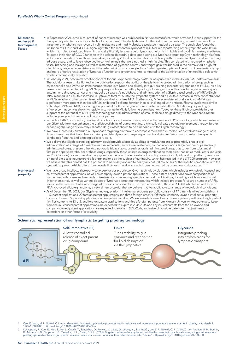 52 PureTech Health plc Annual report and accounts 2021 St ra te g ic r ep o rt Milestones Achieved & Development Status • In September 2021, preclinical proof-of-concept research was published in Nature Metabolism, which provides further support for the therapeutic potential of our Glyph technology platform1. The study showed for the first time that restoring normal function of the mesenteric lymphatics may reverse insulin resistance and modify obesity-associated metabolic disease. The study also found that inhibition of COX-2 and VEGF-C signaling within the mesenteric lymphatics resulted in a repatterning of the lymphatic vasculature, which in turn led to reduced branching and significantly less leakage of lymphatic fluids rich in lipids and pro-inflammatory mediators. Targeted inhibition of COX-2 function with a celecoxib prodrug developed using our lymphatic targeting Glyph technology platform led to a normalization of multiple biomarkers, including VEGF-C concentrations specifically within mesenteric lymph and surrounding adipose tissue, and to levels observed in control animals that were not fed a high-fat diet. This correlated with reduced lymphatic vessel branching and leakage as well as restoration of glycemic control, and weight gain was blocked in the animals fed a high-fat diet. In fact, targeted administration of the celecoxib Glyph prodrug led to a 10-fold greater uptake of celecoxib in mesenteric lymph and more effective restoration of lymphatic function and glycemic control compared to the administration of unmodified celecoxib, which is commercially available. • In February 2021, preclinical proof-of-concept for our Glyph technology platform was published in the Journal of Controlled Release2. The additional results highlighted in the publication support the ability of the platform to target administration of drugs such as mycophenolic acid (MPA), an immunosuppressant, into lymph and directly into gut-draining mesenteric lymph nodes (MLNs). As a key nexus of immune cell trafficking, MLNs play major roles in the pathophysiology of a range of conditions including inflammatory and autoimmune diseases, cancer and metabolic diseases. As published, oral administration of a Glyph-based prodrug of MPA (Glyph- MPA) resulted in a >80-fold increase in uptake of total MPA into the lymphatic system and a >20-fold increase in MPA concentrations in MLNs relative to what was achieved with oral dosing of free MPA. Furthermore, MPA administered orally as Glyph-MPA was significantly more potent than free MPA in inhibiting T cell proliferation in mice challenged with antigen. Plasma levels were similar with Glyph-MPA and MPA, indicating low potential for the emergence of new systemic side effects. Additionally, a prodrug of a fluorescent tracer was shown to rapidly accumulate in MLNs following administration. Together, these findings provide further support of the potential of our Glyph technology for oral administration of small molecule drugs directly to the lymphatic system, including drugs with immunomodulatory properties. • In the April 2022 post-period, preclinical proof-of-concept research was published in Frontiers in Pharmacology, which demonstrated our Glyph platform can enhance the oral bioavailability of buprenorphine, a clinically-validated opioid replacement therapy, further expanding the range of clinically-validated drug classes shown to be amendable to the Glyph technology. • We have successfully extended our lymphatic targeting platform to encompass more than 20 molecules as well as a range of novel linker chemistries that have demonstrated promising lymphatic targeting in preclinical studies. We expect to select therapeutic candidates from this and ongoing discovery work. • We believe the Glyph technology platform could provide a broadly applicable modular means to potentially enable oral administration of a range of bio-active natural molecules, such as neurosteroids, cannabinoids and a large number of parenterally administered drugs that are otherwise not orally bioavailable, or such as orally-administered drugs that suffer from substantial first-pass hepatic metabolism or those drugs, especially those utilized in drug combination therapies, that act as modulators (inducers and/or inhibitors) of drug-metabolizing systems in the liver. To demonstrate the utility of our Glyph lipid prodrug platform, we chose a natural bio-active neurosteroid allopregnanolone as the subject of our inquiry, which has resulted in the LYT-300 program. However, we believe that this benefit has the potential to be widely applied to nearly any natural molecules or therapeutic compatible with the synthetic approach which suffers from hepatic first-pass metabolism as has been evaluated by us and our collaborators. Intellectual property • We have broad intellectual property coverage for our proprietary Glyph technology platform, which includes exclusively licensed and co-owned patent applications, as well as company-owned patent applications. These patent applications cover compositions of matter, methods of use and methods of treatment encompassing specific chemical modifications, including a wide range of novel linker chemistries, as well as various classes of lymphatic targeting therapeutics, which include prodrugs for a large number of APIs, for use in the treatment of a wide range of diseases and disorders. The most advanced of these is LYT-300, which is an oral form of FDA-approved allopregnanolone, a natural neurosteroid, that we believe may be applicable to a range of neurological conditions. • As of December 31, 2021, our Glyph technology platform intellectual property portfolio consists of 17 patent families comprising 19 U.S. patent applications, 20 foreign patent applications and three foreign patents. Of these, company-owned intellectual property consists of nine U.S. patent applications in nine patent families. We exclusively licensed and co-own a patent portfolio of eigh