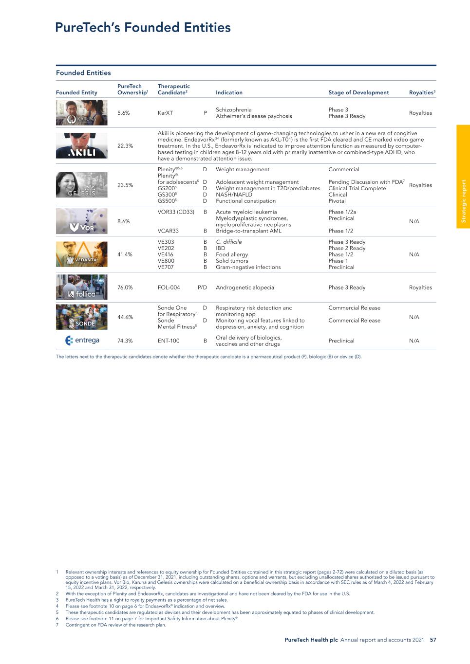 PureTech Health plc Annual report and accounts 2021 57 St ra te g ic r ep o rt PureTech’s Founded Entities 1 Relevant ownership interests and references to equity ownership for Founded Entities contained in this strategic report (pages 2-72) were calculated on a diluted basis (as opposed to a voting basis) as of December 31, 2021, including outstanding shares, options and warrants, but excluding unallocated shares authorized to be issued pursuant to equity incentive plans. Vor Bio, Karuna and Gelesis ownerships were calculated on a beneficial ownership basis in accordance with SEC rules as of March 4, 2022 and February 15, 2022 and March 31, 2022, respectively. 2 With the exception of Plenity and EndeavorRx, candidates are investigational and have not been cleared by the FDA for use in the U.S. 3 PureTech Health has a right to royalty payments as a percentage of net sales. 4 Please see footnote 10 on page 6 for EndeavorRx® indication and overview. 5 These therapeutic candidates are regulated as devices and their development has been approximately equated to phases of clinical development. 6 Please see footnote 11 on page 7 for Important Safety Information about Plenity®. 7 Contingent on FDA review of the research plan. Founded Entities The letters next to the therapeutic candidates denote whether the therapeutic candidate is a pharmaceutical product (P), biologic (B) or device (D). Founded Entity PureTech Ownership1 Therapeutic Candidate2 Indication Stage of Development Royalties3 5.6% KarXT P Schizophrenia Alzheimer’s disease psychosis Phase 3 Phase 3 Ready Royalties 22.3% Akili is pioneering the development of game-changing technologies to usher in a new era of congitive medicine. EndeavorRx®4 (formerly known as AKL-T01) is the first FDA cleared and CE marked video game treatment. In the U.S., EndeavorRx is indicated to improve attention function as measured by computer- based testing in children ages 8-12 years old with primarily inattentive or combined-type ADHD, who have a demonstrated attention issue. 23.5% Plenity®5,6 D Plenity® for adolescents5 D GS2005 D GS3005 D GS5005 D Weight management Adolescent weight management Weight management in T2D/prediabetes NASH/NAFLD Functional constipation Commercial Pending Discussion with FDA7 Clinical Trial Complete Clinical Pivotal Royalties 8.6% VOR33 (CD33) B VCAR33 B Acute myeloid leukemia Myelodysplastic syndromes, myeloproliferative neoplasms Bridge-to-transplant AML Phase 1/2a Preclinical Phase 1/2 N/A 41.4% VE303 B VE202 B VE416 B VE800 B VE707 B C. difficile IBD Food allergy Solid tumors Gram-negative infections Phase 3 Ready Phase 2 Ready Phase 1/2 Phase 1 Preclinical N/A 76.0% FOL-004 P/D Androgenetic alopecia Phase 3 Ready Royalties 44.6% Sonde One D for Respiratory5 Sonde D Mental Fitness5 Respiratory risk detection and monitoring app Monitoring vocal features linked to depression, anxiety, and cognition Commercial Release Commercial Release N/A 74.3% ENT-100 B Oral delivery of biologics, vaccines and other drugs Preclinical N/A