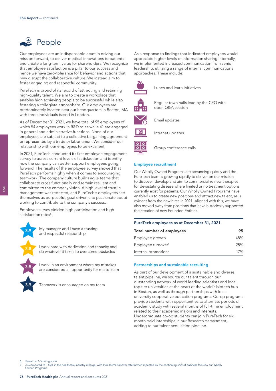 E SG 76 PureTech Health plc Annual report and accounts 2021 ESG Report — continued As a response to findings that indicated employees would appreciate higher levels of information sharing internally, we implemented increased communication from senior leadership, utilizing a range of internal communications approaches. These include: Our employees are an indispensable asset in driving our mission forward, to deliver medical innovations to patients and create a long-term value for shareholders. We recognize that employee satisfaction is a pillar to our success and hence we have zero-tolerance for behavior and actions that may disrupt the collaborative culture. We instead aim to foster engaging and respectful community. PureTech is proud of its record of attracting and retaining high-quality talent. We aim to create a workplace that enables high achieving people to be successful while also fostering a collegiate atmosphere. Our employees are predominately located near our headquarters in Boston, MA with three individuals based in London. As of December 31, 2021, we have total of 95 employees of which 54 employees work in R&D roles while 41 are engaged in general and administrative functions. None of our employees are subject to a collective bargaining agreement or represented by a trade or labor union. We consider our relationship with our employees to be excellent. In 2021, PureTech conducted its first employee engagement survey to assess current levels of satisfaction and identify how the company can better support employees going forward. The results of the employee survey showed that PureTech performs highly when it comes to encouraging teamwork. The company culture builds agile teams that collaborate cross functionally and remain resilient and committed to the company vision. A high level of trust in management was reported, and PureTech’s employees see themselves as purposeful, goal driven and passionate about working to contribute to the company’s success. Employee survey yielded high participation and high satisfaction rates6: 6 Based on 1-5 rating scale 7 As compared to ~45% in the healthcare industry at large, with PureTech’s turnover rate further impacted by the continuing shift of business focus to our Wholly Owned Programs People Employee recruitment Our Wholly Owned Programs are advancing quickly and the PureTech team is growing rapidly to deliver on our mission to discover, develop and aim to commercialize new therapies for devastating disease where limited or no treatment options currently exist for patients. Our Wholly Owned Programs have enabled us to create new positions and attract new talent, as is evident from the new hires in 2021. Aligned with this, we have also moved away from positions that have historically supported the creation of new Founded Entities. PureTech employees as at December 31, 2021 Total number of employees 95 Employee growth 48% Employee turnover7 25% Internal promotions 17% Partnerships and sustainable recruiting As part of our development of a sustainable and diverse talent pipeline, we source our talent through our outstanding network of world leading scientists and local top tier universities at the heart of the world’s biotech hub in Boston, as well as through partnerships with local university cooperative education programs. Co-op programs provide students with opportunities to alternate periods of academic study with several months of full-time employment related to their academic majors and interests. Undergraduate co-op students can join PureTech for six month paid internships in our Research department, adding to our talent acquisition pipeline. 3.9 My manager and I have a trusting and respectful relationship 3.8 I work hard with dedication and tenacity and do whatever it takes to overcome obstacles 3.5 I work in an environment where my mistakes are considered an opportunity for me to learn 3.9 Teamwork is encouraged on my team Lunch and learn initiatives Regular town halls lead by the CEO with open Q&A session Email updates Intranet updates Group conference calls