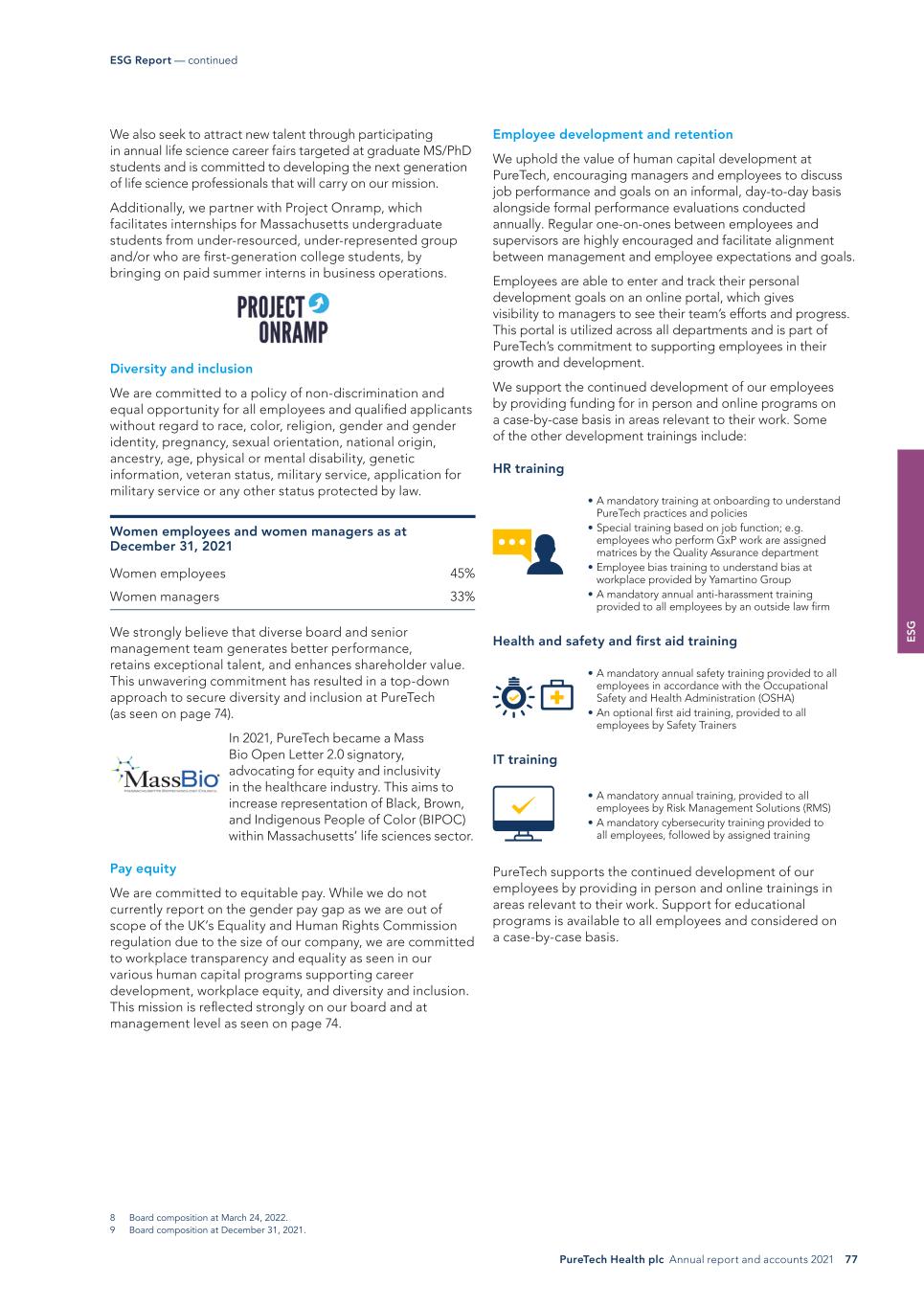 E SG PureTech Health plc Annual report and accounts 2021 77 ESG Report — continued Employee development and retention We uphold the value of human capital development at PureTech, encouraging managers and employees to discuss job performance and goals on an informal, day-to-day basis alongside formal performance evaluations conducted annually. Regular one-on-ones between employees and supervisors are highly encouraged and facilitate alignment between management and employee expectations and goals. Employees are able to enter and track their personal development goals on an online portal, which gives visibility to managers to see their team’s efforts and progress. This portal is utilized across all departments and is part of PureTech’s commitment to supporting employees in their growth and development. We support the continued development of our employees by providing funding for in person and online programs on a case-by-case basis in areas relevant to their work. Some of the other development trainings include: HR training • A mandatory training at onboarding to understand PureTech practices and policies • Special training based on job function; e.g. employees who perform GxP work are assigned matrices by the Quality Assurance department • Employee bias training to understand bias at workplace provided by Yamartino Group • A mandatory annual anti-harassment training provided to all employees by an outside law firm Health and safety and first aid training • A mandatory annual safety training provided to all employees in accordance with the Occupational Safety and Health Administration (OSHA) • An optional first aid training, provided to all employees by Safety Trainers IT training • A mandatory annual training, provided to all employees by Risk Management Solutions (RMS) • A mandatory cybersecurity training provided to all employees, followed by assigned training PureTech supports the continued development of our employees by providing in person and online trainings in areas relevant to their work. Support for educational programs is available to all employees and considered on a case-by-case basis. We also seek to attract new talent through participating in annual life science career fairs targeted at graduate MS/PhD students and is committed to developing the next generation of life science professionals that will carry on our mission. Additionally, we partner with Project Onramp, which facilitates internships for Massachusetts undergraduate students from under-resourced, under-represented group and/or who are first-generation college students, by bringing on paid summer interns in business operations. Diversity and inclusion We are committed to a policy of non-discrimination and equal opportunity for all employees and qualified applicants without regard to race, color, religion, gender and gender identity, pregnancy, sexual orientation, national origin, ancestry, age, physical or mental disability, genetic information, veteran status, military service, application for military service or any other status protected by law. Women employees and women managers as at December 31, 2021 Women employees 45% Women managers 33% We strongly believe that diverse board and senior management team generates better performance, retains exceptional talent, and enhances shareholder value. This unwavering commitment has resulted in a top-down approach to secure diversity and inclusion at PureTech (as seen on page 74). In 2021, PureTech became a Mass Bio Open Letter 2.0 signatory, advocating for equity and inclusivity in the healthcare industry. This aims to increase representation of Black, Brown, and Indigenous People of Color (BIPOC) within Massachusetts’ life sciences sector. Pay equity We are committed to equitable pay. While we do not currently report on the gender pay gap as we are out of scope of the UK’s Equality and Human Rights Commission regulation due to the size of our company, we are committed to workplace transparency and equality as seen in our various human capital programs supporting career development, workplace equity, and diversity and inclusion. This mission is reflected strongly on our board and at management level as seen on page 74. 8 Board composition at March 24, 2022. 9 Board composition at December 31, 2021.
