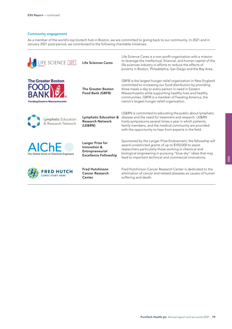 E SG PureTech Health plc Annual report and accounts 2021 79 ESG Report — continued Community engagement As a member of the world’s top biotech hub in Boston, we are committed to giving back to our community. In 2021 and in January 2021 post-period, we contributed to the following charitable initiatives: Life Sciences Cares Life Science Cares is a non-profit organization with a mission to leverage the intellectual, financial, and human capital of the life sciences industry in efforts to reduce the effects of poverty in Boston, Philadelphia, San Diego and the Bay Area. The Greater Boston Food Bank (GBFB) GBFB is the largest hunger-relief organization in New England committed to increasing our food distribution by providing three meals a day to every person in need in Eastern Massachusetts while supporting healthy lives and healthy communities. GBFB is a member of Feeding America, the nation’s largest hunger-relief organization. Lymphatic Education & Research Network (LE&RN) LE&RN is committed to educating the public about lymphatic disease and the need for treatment and research. LE&RN hosts symposiums several times a year in which patients, family members, and the medical community are provided with the opportunity to hear from experts in the field. Langer Prize for Innovation & Entrepreneurial Excellence Fellowship Sponsored by the Langer Prize Endowment, the fellowship will award unrestricted grants of up to $100,000 to assist researchers particularly those working in chemical and biological engineering in pursuing “blue-sky” ideas that may lead to important technical and commercial innovations. Fred Hutchinson Cancer Research Center Fred Hutchinson Cancer Research Center is dedicated to the elimination of cancer and related diseases as causes of human suffering and death.
