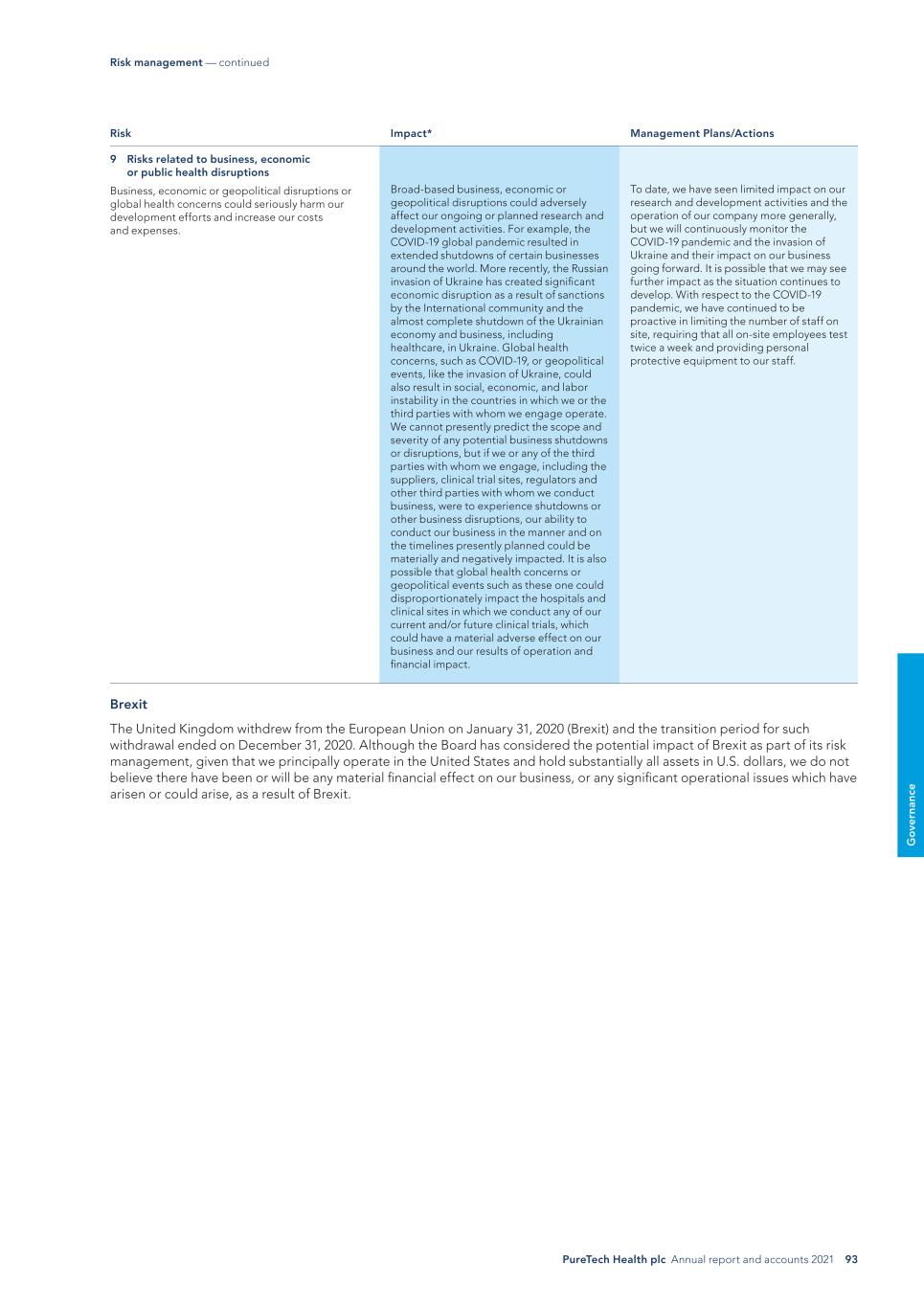 PureTech Health plc Annual report and accounts 2021 93 G o ve rn an ce Risk Impact* Management Plans/Actions 9 Risks related to business, economic or public health disruptions Business, economic or geopolitical disruptions or global health concerns could seriously harm our development efforts and increase our costs and expenses. Broad-based business, economic or geopolitical disruptions could adversely affect our ongoing or planned research and development activities. For example, the COVID-19 global pandemic resulted in extended shutdowns of certain businesses around the world. More recently, the Russian invasion of Ukraine has created significant economic disruption as a result of sanctions by the International community and the almost complete shutdown of the Ukrainian economy and business, including healthcare, in Ukraine. Global health concerns, such as COVID-19, or geopolitical events, like the invasion of Ukraine, could also result in social, economic, and labor instability in the countries in which we or the third parties with whom we engage operate. We cannot presently predict the scope and severity of any potential business shutdowns or disruptions, but if we or any of the third parties with whom we engage, including the suppliers, clinical trial sites, regulators and other third parties with whom we conduct business, were to experience shutdowns or other business disruptions, our ability to conduct our business in the manner and on the timelines presently planned could be materially and negatively impacted. It is also possible that global health concerns or geopolitical events such as these one could disproportionately impact the hospitals and clinical sites in which we conduct any of our current and/or future clinical trials, which could have a material adverse effect on our business and our results of operation and financial impact. To date, we have seen limited impact on our research and development activities and the operation of our company more generally, but we will continuously monitor the COVID-19 pandemic and the invasion of Ukraine and their impact on our business going forward. It is possible that we may see further impact as the situation continues to develop. With respect to the COVID-19 pandemic, we have continued to be proactive in limiting the number of staff on site, requiring that all on-site employees test twice a week and providing personal protective equipment to our staff. Brexit The United Kingdom withdrew from the European Union on January 31, 2020 (Brexit) and the transition period for such withdrawal ended on December 31, 2020. Although the Board has considered the potential impact of Brexit as part of its risk management, given that we principally operate in the United States and hold substantially all assets in U.S. dollars, we do not believe there have been or will be any material financial effect on our business, or any significant operational issues which have arisen or could arise, as a result of Brexit. Risk management — continued