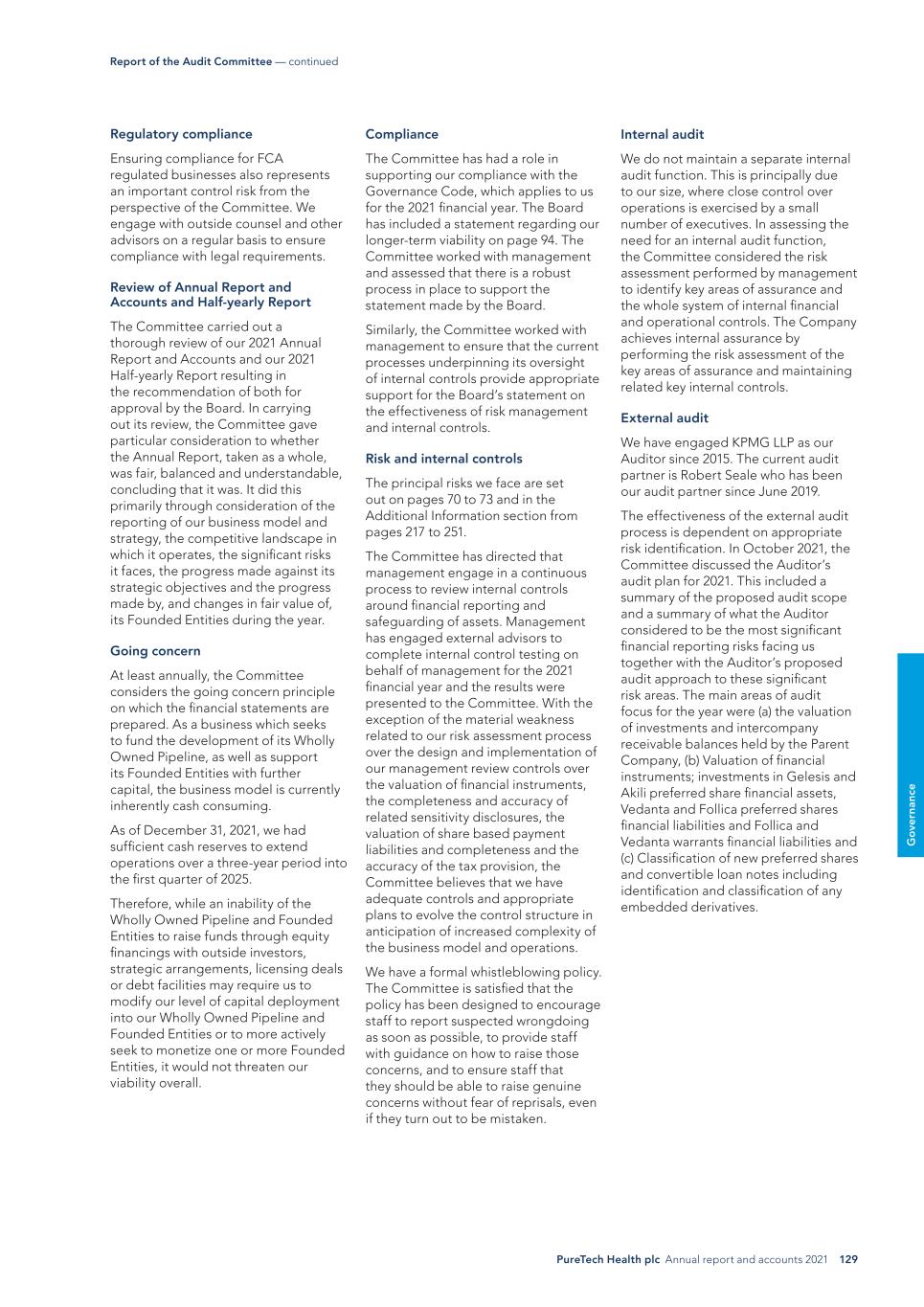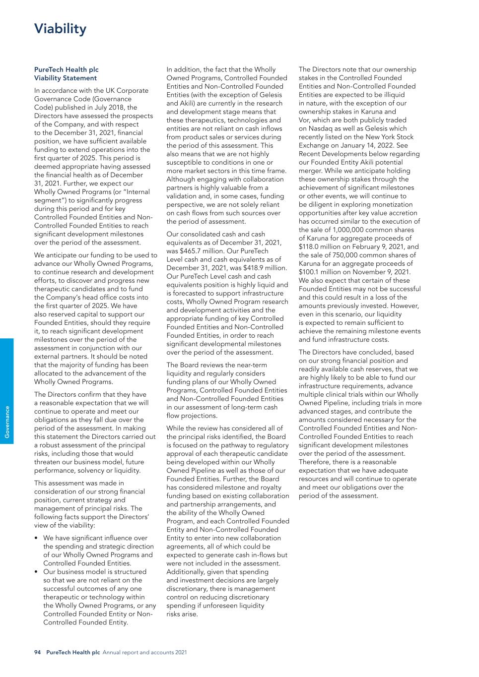 94 PureTech Health plc Annual report and accounts 2021 G o ve rn an ce Viability PureTech Health plc Viability Statement In accordance with the UK Corporate Governance Code (Governance Code) published in July 2018, the Directors have assessed the prospects of the Company, and with respect to the December 31, 2021, financial position, we have sufficient available funding to extend operations into the first quarter of 2025. This period is deemed appropriate having assessed the financial health as of December 31, 2021. Further, we expect our Wholly Owned Programs (or “Internal segment”) to significantly progress during this period and for key Controlled Founded Entities and Non- Controlled Founded Entities to reach significant development milestones over the period of the assessment. We anticipate our funding to be used to advance our Wholly Owned Programs, to continue research and development efforts, to discover and progress new therapeutic candidates and to fund the Company’s head office costs into the first quarter of 2025. We have also reserved capital to support our Founded Entities, should they require it, to reach significant development milestones over the period of the assessment in conjunction with our external partners. It should be noted that the majority of funding has been allocated to the advancement of the Wholly Owned Programs. The Directors confirm that they have a reasonable expectation that we will continue to operate and meet our obligations as they fall due over the period of the assessment. In making this statement the Directors carried out a robust assessment of the principal risks, including those that would threaten our business model, future performance, solvency or liquidity. This assessment was made in consideration of our strong financial position, current strategy and management of principal risks. The following facts support the Directors’ view of the viability: • We have significant influence over the spending and strategic direction of our Wholly Owned Programs and Controlled Founded Entities. • Our business model is structured so that we are not reliant on the successful outcomes of any one therapeutic or technology within the Wholly Owned Programs, or any Controlled Founded Entity or Non- Controlled Founded Entity. In addition, the fact that the Wholly Owned Programs, Controlled Founded Entities and Non-Controlled Founded Entities (with the exception of Gelesis and Akili) are currently in the research and development stage means that these therapeutics, technologies and entities are not reliant on cash inflows from product sales or services during the period of this assessment. This also means that we are not highly susceptible to conditions in one or more market sectors in this time frame. Although engaging with collaboration partners is highly valuable from a validation and, in some cases, funding perspective, we are not solely reliant on cash flows from such sources over the period of assessment. Our consolidated cash and cash equivalents as of December 31, 2021, was $465.7 million. Our PureTech Level cash and cash equivalents as of December 31, 2021, was $418.9 million. Our PureTech Level cash and cash equivalents position is highly liquid and is forecasted to support infrastructure costs, Wholly Owned Program research and development activities and the appropriate funding of key Controlled Founded Entities and Non-Controlled Founded Entities, in order to reach significant developmental milestones over the period of the assessment. The Board reviews the near-term liquidity and regularly considers funding plans of our Wholly Owned Programs, Controlled Founded Entities and Non-Controlled Founded Entities in our assessment of long-term cash flow projections. While the review has considered all of the principal risks identified, the Board is focused on the pathway to regulatory approval of each therapeutic candidate being developed within our Wholly Owned Pipeline as well as those of our Founded Entities. Further, the Board has considered milestone and royalty funding based on existing collaboration and partnership arrangements, and the ability of the Wholly Owned Program, and each Controlled Founded Entity and Non-Controlled Founded Entity to enter into new collaboration agreements, all of which could be expected to generate cash in-flows but were not included in the assessment. Additionally, given that spending and investment decisions are largely discretionary, there is management control on reducing discretionary spending if unforeseen liquidity risks arise. The Directors note that our ownership stakes in the Controlled Founded Entities and Non-Controlled Founded Entities are expected to be illiquid in nature, with the exception of our ownership stakes in Karuna and Vor, which are both publicly traded on Nasdaq as well as Gelesis which recently listed on the New York Stock Exchange on January 14, 2022. See Recent Developments below regarding our Founded Entity Akili potential merger. While we anticipate holding these ownership stakes through the achievement of significant milestones or other events, we will continue to be diligent in exploring monetization opportunities after key value accretion has occurred similar to the execution of the sale of 1,000,000 common shares of Karuna for aggregate proceeds of $118.0 million on February 9, 2021, and the sale of 750,000 common shares of Karuna for an aggregate proceeds of $100.1 million on November 9, 2021. We also expect that certain of these Founded Entities may not be successful and this could result in a loss of the amounts previously invested. However, even in this scenario, our liquidity is expected to remain sufficient to achieve the remaining milestone events and fund infrastructure costs. The Directors have concluded, based on our strong financial position and readily available cash reserves, that we are highly likely to be able to fund our infrastructure requirements, advance multipl