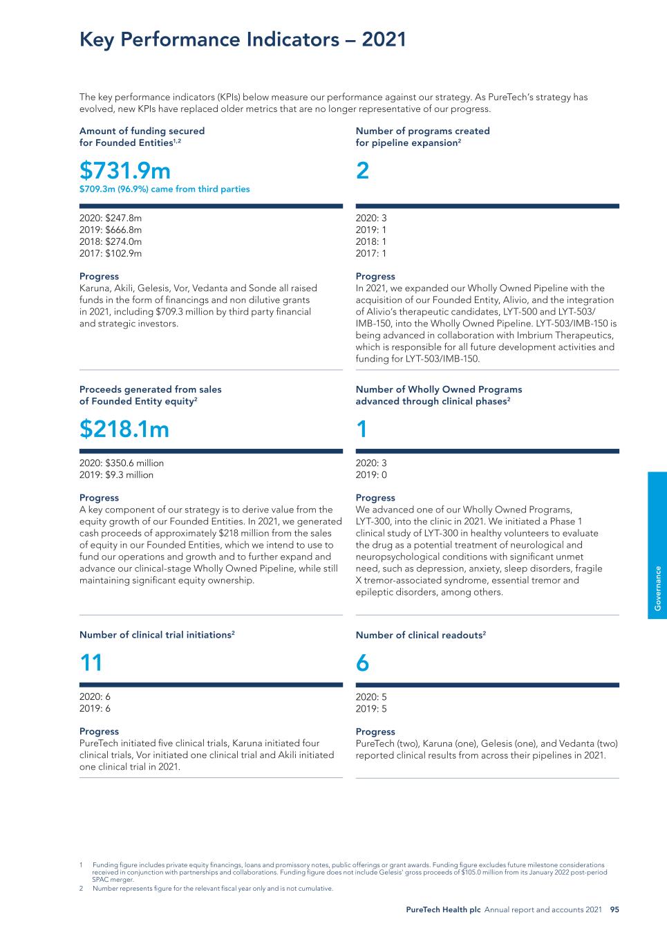 PureTech Health plc Annual report and accounts 2021 95 G o ve rn an ce 1 Funding figure includes private equity financings, loans and promissory notes, public offerings or grant awards. Funding figure excludes future milestone considerations received in conjunction with partnerships and collaborations. Funding figure does not include Gelesis’ gross proceeds of $105.0 million from its January 2022 post-period SPAC merger. 2 Number represents figure for the relevant fiscal year only and is not cumulative. Key Performance Indicators – 2021 The key performance indicators (KPIs) below measure our performance against our strategy. As PureTech’s strategy has evolved, new KPIs have replaced older metrics that are no longer representative of our progress. Number of clinical trial initiations2 11 2020: 6 2019: 6 Progress PureTech initiated five clinical trials, Karuna initiated four clinical trials, Vor initiated one clinical trial and Akili initiated one clinical trial in 2021. Number of clinical readouts2 6 2020: 5 2019: 5 Progress PureTech (two), Karuna (one), Gelesis (one), and Vedanta (two) reported clinical results from across their pipelines in 2021. Amount of funding secured for Founded Entities1,2 $731.9m $709.3m (96.9%) came from third parties 2020: $247.8m 2019: $666.8m 2018: $274.0m 2017: $102.9m Progress Karuna, Akili, Gelesis, Vor, Vedanta and Sonde all raised funds in the form of financings and non dilutive grants in 2021, including $709.3 million by third party financial and strategic investors. Number of programs created for pipeline expansion2 2 2020: 3 2019: 1 2018: 1 2017: 1 Progress In 2021, we expanded our Wholly Owned Pipeline with the acquisition of our Founded Entity, Alivio, and the integration of Alivio’s therapeutic candidates, LYT-500 and LYT-503/ IMB-150, into the Wholly Owned Pipeline. LYT-503/IMB-150 is being advanced in collaboration with Imbrium Therapeutics, which is responsible for all future development activities and funding for LYT-503/IMB-150. Proceeds generated from sales of Founded Entity equity2 $218.1m 2020: $350.6 million 2019: $9.3 million Progress A key component of our strategy is to derive value from the equity growth of our Founded Entities. In 2021, we generated cash proceeds of approximately $218 million from the sales of equity in our Founded Entities, which we intend to use to fund our operations and growth and to further expand and advance our clinical-stage Wholly Owned Pipeline, while still maintaining significant equity ownership. Number of Wholly Owned Programs advanced through clinical phases2 1 2020: 3 2019: 0 Progress We advanced one of our Wholly Owned Programs, LYT-300, into the clinic in 2021. We initiated a Phase 1 clinical study of LYT-300 in healthy volunteers to evaluate the drug as a potential treatment of neurological and neuropsychological conditions with significant unmet need, such as depression, anxiety, sleep disorders, fragile X tremor-associated syndrome, essential tremor and epileptic disorders, among others.