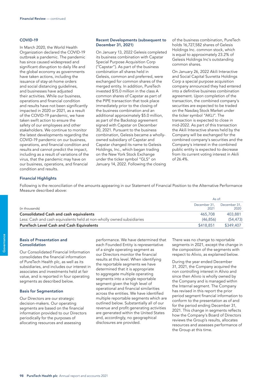98 PureTech Health plc Annual report and accounts 2021 G o ve rn an ce Financial Review — continued Basis of Presentation and Consolidation Our Consolidated Financial Information consolidates the financial information of PureTech Health plc, as well as its subsidiaries, and includes our interest in associates and investments held at fair value, and is reported in four operating segments as described below. Basis for Segmentation Our Directors are our strategic decision-makers. Our operating segments are based on the financial information provided to our Directors periodically for the purposes of allocating resources and assessing COVID-19 In March 2020, the World Health Organization declared the COVID-19 outbreak a pandemic. The pandemic has since caused widespread and significant disruption to daily life and the global economy as governments have taken actions, including the issuance of stay-at-home orders and social distancing guidelines, and businesses have adjusted their activities. While our business, operations and financial condition and results have not been significantly impacted in 2020 or 2021, as a result of the COVID-19 pandemic, we have taken swift action to ensure the safety of our employees and other stakeholders. We continue to monitor the latest developments regarding the COVID-19 pandemic on our business, operations, and financial condition and results and cannot predict the impact, including as a result of variations of the virus, that the pandemic may have on our business, operations, and financial condition and results. performance. We have determined that each Founded Entity is representative of a single operating segment as our Directors monitor the financial results at this level. When identifying the reportable segments we have determined that it is appropriate to aggregate multiple operating segments into a single reportable segment given the high level of operational and financial similarities across the entities. We have identified multiple reportable segments which are outlined below. Substantially all of our revenue and profit generating activities are generated within the United States and, accordingly, no geographical disclosures are provided. Recent Developments (subsequent to December 31, 2021) On January 13, 2022 Gelesis completed its business combination with Capstar Special Purpose Acquisition Corp (“Capstar”). As part of the business combination all shares held in Gelesis, common and preferred, were exchanged for common shares of the merged entity. In addition, PureTech invested $15.0 million in the class A common shares of Capstar as part of the PIPE transaction that took place immediately prior to the closing of the business combination and an additional approximately $5.0 million, as part of the Backstop agreement signed with Capstar on December 30, 2021. Pursuant to the business combination, Gelesis became a wholly- owned subsidiary of Capstar and Capstar changed its name to Gelesis Holdings, Inc., which began trading on the New York Stock Exchange under the ticker symbol “GLS” on January 14, 2022. Following the closing There was no change to reportable segments in 2021, except the change in the composition of the segments with respect to Alivio, as explained below. During the year ended December 31, 2021, the Company acquired the non controlling interest in Alivio and since then Alivio is wholly owned by the Company and is managed within the Internal segment. The Company has revised in this report the prior period segment financial information to conform to the presentation as of and for the period ending December 31, 2021. This change in segments reflects how the Company’s Board of Directors reviews the Group’s results, allocates resources and assesses performance of the Group at this time. of the business combination, PureTech holds 16,727,582 shares of Gelesis Holdings Inc. common stock, which is equal to approximately 23.2% of Gelesis Holdings Inc's outstanding common shares. On January 26, 2022 Akili Interactive and Social Capital Suvretta Holdings Corp a special purpose acquisition company announced they had entered into a definitive business combination agreement. Upon completion of the transaction, the combined company’s securities are expected to be traded on the Nasdaq Stock Market under the ticker symbol “AKLI”. The transaction is expected to close in mid-2022. As part of this transaction the Akili Interactive shares held by the Company will be exchanged for the combined company's securities and the Company's interest in the combined public entity is expected to decrease from its current voting interest in Akili of 26.4%. Financial Highlights Following is the reconciliation of the amounts appearing in our Statement of Financial Position to the Alternative Performance Measure described above: As of: (in thousands) December 31, 2021 December 31, 2020 Consolidated Cash and cash equivalents 465,708 403,881 Less: Cash and cash equivalents held at non-wholly owned subsidiaries (46,856) (54,473) PureTech Level Cash and Cash Equivalents $418,851 $349,407