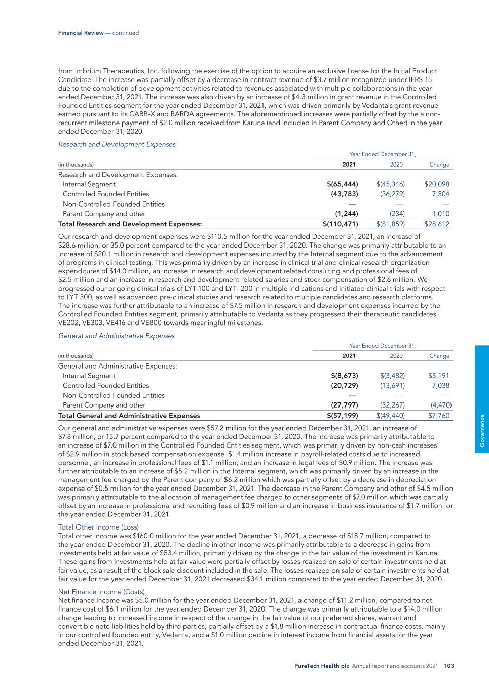 96 PureTech Health plc Annual report and accounts 2021 G o ve rn an ce Financial Review Reporting Framework You should read the following discussion and analysis together with our Consolidated Financial Statements, including the notes thereto, set forth elsewhere in this report. Some of the information contained in this discussion and analysis or set forth elsewhere in this report, including information with respect to our plans and strategy for our business and financing our business, includes forward-looking statements that involve risks and uncertainties. As a result of many factors, including the risks set forth on pages 90 to 93 and in the Additional Information section from pages 217 to 251, our actual results could differ materially from the results described in or implied by these forward-looking statements. Our audited Consolidated Financial Statements as of December 31, 2021 and 2020, and for the years ended December 31, 2021, 2020 and 2019, have been prepared in accordance with UK-adopted International Financial Reporting Standards (IFRS). The Consolidated Financial Statements also comply fully with IFRSs as issued by the International Accounting Standards Board (IASB). The following discussion contains references to the Consolidated Financial Statements of PureTech Health plc, or the Company, and its consolidated subsidiaries, together the Group. These financial statements consolidate the Company’s subsidiaries and include the Company’s interest in associates and investments held at fair value. Subsidiaries are those entities over which the Company maintains control. Associates are those entities in which the Company does not have control for financial accounting purposes but maintains significant influence over financial and operating policies. Where the Company has neither control nor significant influence for financial accounting purposes, we recognize our holding in such entity as an investment at fair value. For purposes of our Consolidated Financial Statements, each of our Founded Entities are considered to be either a “subsidiary”, an “associate” or an “investment held at fair value” depending on whether PureTech Health plc controls or maintains significant influence over the financial and operating policies of the respective entity at the respective period end date. For additional information regarding the accounting treatment of these entities, see Note 1 to our Consolidated Financial Statements included in this report. For additional information regarding our operating structure, see “—Basis of Presentation and Consolidation” below. Fair value of Investments held at fair value, does not take into consideration contribution from milestones that occurred after December 31, 2021, the value of our interests in our consolidated Founded Entities (Vedanta, Follica, Sonde, and Entrega), our Wholly Owned Programs, or our cash. Business Background and Results Overview The business background is discussed from pages 1 to 72, which describe in detail the business development of our Wholly Owned Programs and Founded Entities. Our ability to generate product revenue sufficient to achieve profitability will depend heavily on the successful development and eventual commercialization of one or more of our wholly-owned or Controlled Founded Entities’ therapeutics candidates, which may or may not occur. Our Founded Entities, Gelesis, Inc. (“Gelesis”), and Akili Interactive Labs, Inc. (“Akili”), which we have not controlled since 2019 and 2018, respectively, have products cleared for sale, but our Wholly Owned Programs and our Controlled Founded Entities have not yet generated any meaningful revenue from product sales. We deconsolidated a number of our Founded Entities, specifically Karuna Therapeutics, Inc. (“Karuna”), Vor Biopharma Inc. (“Vor”), and Gelesis during 2019. We expect this trend to continue into the foreseeable future as our Controlled Founded Entities raise additional funding that reduces our ownership interest. Any deconsolidation affects our financials in the following manner: • our ownership interest does not provide us with a controlling financial interest; • we no longer control the Founded Entity's assets and liabilities and as a result we derecognize the assets, liabilities and non-controlling interests related to the Founded Entity from our Consolidated Statements of Financial Position; • we record our non-controlling financial interest in the Founded Entity at fair value; and • the resulting amount of any gain or loss is recognized in our Consolidated Statements of Comprehensive Income/(Loss). We anticipate our expenses to continue to increase proportionally in connection with our ongoing development activities related mostly due to the advancement into late-stage studies of the clinical programs within our Wholly Owned Pipeline and Controlled Founded Entities. In addition, having completed our U.S. listing in November 2020, we have, and will continue, to incur additional costs associated with operating as a public company in the U.S. We also expect that our expenses and capital requirements will increase substantially in the near to mid-term as we: • continue our research and development efforts; • seek regulatory approvals for any therapeutic candidates that successfully complete clinical trials; • add clinical, scientific, operational financial and management information systems and personnel, including personnel to support our therapeutic development and potential future commercialization claims; and • operate as a U.S. public company. In addition, our internal research and development spend will increase in the foreseeable future as we may initiate additional clinical studies for LYT-100, LYT-200 and LYT-300, and advance LYT- 210, LYT-510 and LYT-500 into the clinic and continue to progress our GlyphTM, OrasomeTM and AlivioTM technology platforms as well as our meningeal lymphatics research program. In