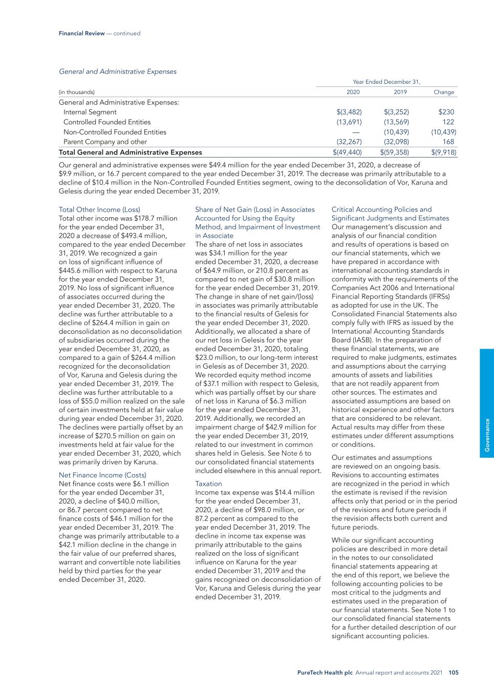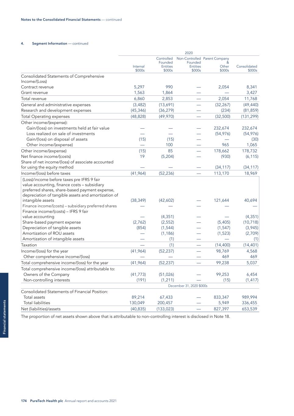 174 PureTech Health plc Annual report and accounts 2021 Fi na nc ia l s ta te m en ts 2020 Internal $000s Controlled Founded Entities $000s Non-Controlled Founded Entities $000s ParentCompany & Other $000s Consolidated $000s ConsolidatedStatementsofComprehensive Income/(Loss) Contractrevenue 5,297 990 — 2,054 8,341 Grantrevenue 1,563 1,864 — — 3,427 Totalrevenue 6,860 2,853 — 2,054 11,768 Generalandadministrativeexpenses (3,482) (13,691) — (32,267) (49,440) Researchanddevelopmentexpenses (45,346) (36,279) — (234) (81,859) TotalOperatingexpenses (48,828) (49,970) — (32,500) (131,299) Otherincome/(expense): Gain/(loss)oninvestmentsheldatfairvalue — — — 232,674 232,674 Lossrealizedonsaleofinvestments — — — (54,976) (54,976) Gain/(loss)ondisposalofassets (15) (15) — — (30) Otherincome/(expense) — 100 — 965 1,065 Otherincome/(expense) (15) 85 — 178,662 178,732 Netfinanceincome/(costs) 19 (5,204) — (930) (6,115) Shareofnetincome/(loss)ofassociateaccounted forusingtheequitymethod — — — (34,117) (34,117) Income/(loss)beforetaxes (41,964) (52,236) — 113,170 18,969 (Loss)/incomebeforetaxespreIFRS9fair valueaccounting,financecosts–subsidiary preferredshares,share-basedpaymentexpense, depreciationoftangibleassetsandamortizationof intangibleassets (38,349) (42,602) — 121,644 40,694 Finance income/(costs) – subsidiary preferred shares — — — — — Financeincome/(costs)–IFRS9fair value accounting — (4,351) — — (4,351) Share-basedpaymentexpense (2,762) (2,552) — (5,405) (10,718) Depreciationoftangibleassets (854) (1,544) — (1,547) (3,945) AmortizationofROUassets — (1,186) — (1,523) (2,709) Amortizationofintangibleassets — (1) — — (1) Taxation — (1) — (14,400) (14,401) Income/(loss)fortheyear (41,964) (52,237) — 98,769 4,568 Othercomprehensiveincome/(loss) — — — 469 469 Totalcomprehensiveincome/(loss)fortheyear (41,964) (52,237) — 99,238 5,037 Totalcomprehensiveincome/(loss)attributableto: OwnersoftheCompany (41,773) (51,026) — 99,253 6,454 Non-controllinginterests (191) (1,211) — (15) (1,417) December 31, 2020 $000s ConsolidatedStatementsofFinancialPosition: Totalassets 89,214 67,433 — 833,347 989,994 Totalliabilities 130,049 200,457 — 5,949 336,455 Net(liabilities)/assets (40,835) (133,023) — 827,397 653,539 Theproportionofnetassetsshownabovethatisattributabletonon-controllinginterestisdisclosedinNote18. 4. Segment Information —continued Notes to the Consolidated Financial Statements — continued