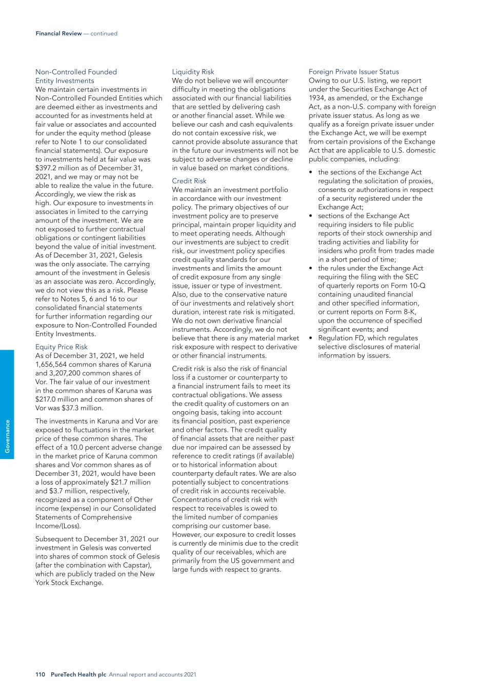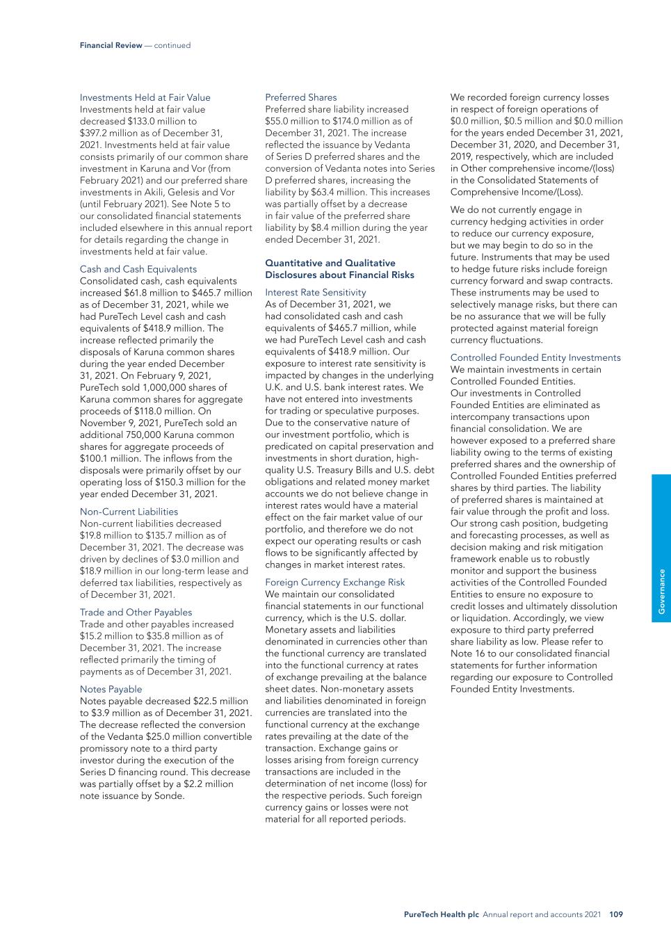 PureTech Health plc Annual report and accounts 2021 205 Fi na nc ia l s ta te m en ts InterestRateSensitivity AsofDecember31,2021,theGrouphadcashandcashequivalentsof$465.7 million.TheGroup'sexposuretointerest ratesensitivityisimpactedbychangesintheunderlyingU.K.andU.S.bankinterestrates.TheGrouphasnotenteredinto investmentsfortradingorspeculativepurposes.DuetotheconservativenatureoftheGroup'sinvestmentportfolio,whichis predicatedoncapitalpreservationandinvestmentsinshortduration,high-qualityU.S.TreasuryBillsandU.S.debtobligations andrelatedmoneymarketaccounts,achangeininterestrateswouldnothaveamaterialeffectonthefairmarketvalueof theGroup'sportfolio,andthereforetheGroupdoesnotexpectoperatingresultsorcashflowstobesignificantlyaffectedby changesinmarketinterestrates. ControlledFoundedEntityInvestments TheGroupmaintainsinvestmentsincertainControlledFoundedEntities.TheGroup’sinvestmentsinControlledFounded Entitiesareeliminatedasintercompanytransactionsuponfinancialconsolidation.TheGroupishoweverexposedtoa preferredshareliabilityowingtothetermsofexistingpreferredsharesandtheownershipofControlledFoundedEntities preferredsharesbythirdparties.AsdiscussedinNote15,certainoftheGroup’ssubsidiarieshaveissuedpreferredsharesthat includetherighttoreceiveapaymentintheeventofanyvoluntaryorinvoluntaryliquidation,dissolutionorwindingupofa subsidiary,includingintheeventof"deemedliquidation"asdefinedintheincorporationdocumentsoftheentities,whichshall bepaidoutoftheassetsofthesubsidiaryavailablefordistributiontoshareholdersandbeforeanypaymentshallbemadeto holdersofordinaryshares.Theliabilityofpreferredsharesismaintainedatfairvaluethroughtheprofitandloss.TheGroup’s strongcashposition,budgetingandforecastingprocesses,aswellasdecisionmakingandriskmitigationframeworkenable theGrouptorobustlymonitorandsupportthebusinessactivitiesoftheControlledFoundedEntitiestoensurenoexposure to dissolutionorliquidation.Accordingly,theGroupviewsexposureto3rdpartypreferredshareliabilityaslow. Non-ControlledFoundedEntityInvestments TheGroupmaintainscertaininvestmentsinNon-ControlledFoundedEntitieswhicharedeemedeitherasinvestmentsand accountedforasinvestmentsheldatfairvalueorassociatesandaccountedforundertheequitymethod(pleasereferto Note1).TheGroup'sexposuretoinvestmentsheldatfairvalueis$397.2 millionasofDecember31,2021,andtheGroupmay ormaynotbeabletorealizethevalueinthefuture.Accordingly,theGroupviewstheriskashigh.TheGroup’sexposureto investmentsinassociatesislimitedtothecarryingamountoftheinvestmentinanAssociate.TheGroupisnotexposedto furthercontractualobligationsorcontingentliabilitiesbeyondthevalueofinitialinvestment.AsofDecember31,2021,Gelesis wastheonlyassociate.ThecarryingamountoftheinvestmentinGelesisasanassociatewaszero.Accordingly,theGroup doesnotviewthisasarisk.PleaserefertoNotes5,6and16forfurtherinformationregardingtheGroup'sexposuretoNon- ControlledFoundedEntityInvestments. EquityPriceRisk AsofDecember31,2021,theGroupheld1,656,564commonsharesofKarunaand3,207,200commonsharesofVor.Thefair valueoftheGroup'sinvestmentinthecommonstockofKarunaandVorwas$217.0 millionand$37.3 millionrespectively. TheinvestmentsinKarunaandVorareexposedtofluctuationsinthemarketpriceofthesecommonshares.Theeffectofa 10.0percentadversechangeinthemarketpriceofKarunaandVorcommonsharesasofDecember31,2021,wouldhavebeen alossofapproximately$21.7 millionand$3.7 millionrespectively,recognizedasacomponentofOtherincome(expense)in theConsolidatedStatementsofComprehensiveIncome/(Loss). ForeignExchangeRisk TheGroupmaintainsconsolidatedfinancialstatementsintheGroup'sfunctionalcurrency,whichistheU.S.dollar.Monetary assetsandliabilitiesdenominatedincurrenciesotherthanthefunctionalcurrencyaretranslatedintothefunctionalcurrencyat ratesofexchangeprevailingatthebalancesheetdates. Non-monetary assetsandliabilitiesdenominatedinforeigncurrencies aretranslatedintothefunctionalcurrencyattheexchangeratesprevailingatthedateofthetransaction.Exchangegains orlossesarisingfromforeigncurrencytransactionsareincludedinthedeterminationofnetincome(loss)fortherespective periods.Suchforeigncurrencygainsorlosseswerenotmaterialforallreportedperiods.SeeNote9. TheGroupdoesnotcurrentlyengageincurrencyhedgingactivitiessinceitsforeigncurrencyriskislimited,buttheGroupmay begintodosointhefutureifandwhenitsforeigncurrencyriskexposurechanges.Instrumentsthatmaybeusedtohedge futurerisksincludeforeigncurrencyforwardandswapcontracts.Theseinstrumentsmaybeusedtoselectivelymanagerisks, buttherecanbenoassurancethattheGroupwillbefullyprotectedagainstmaterialforeigncurrencyfluctuations. 22. Capital and Financial Risk Management —continued Notes to the Consolidated Financial Statements — continued