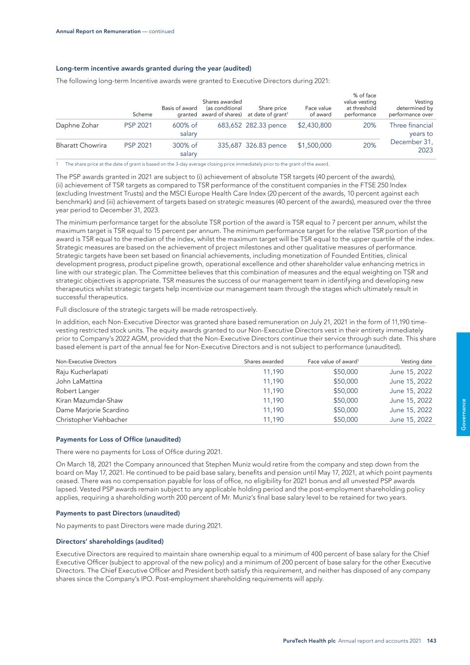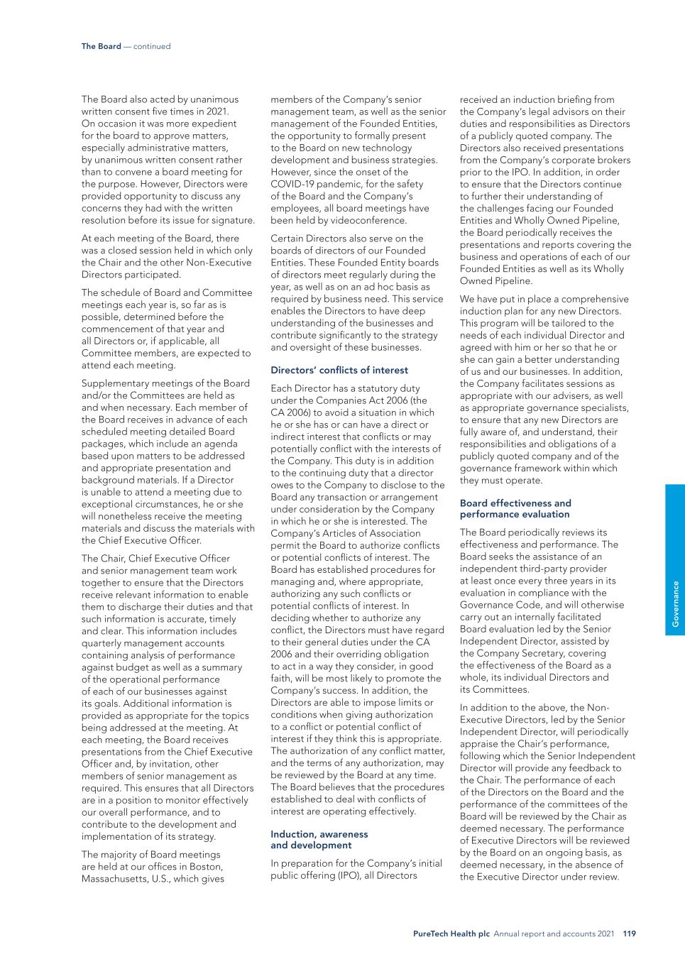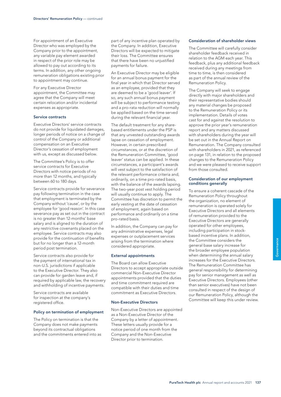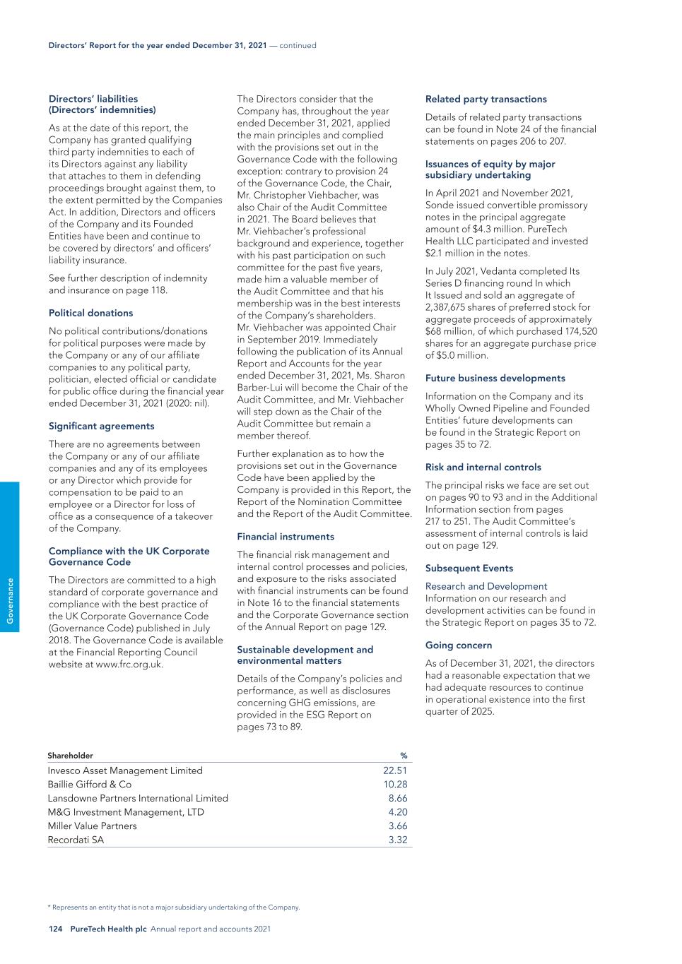 The Board 117 Directors’ Report 123 Report of the Nomination Committee 127 Report of the Audit Committee 128 Directors’ Remuneration Report 131 Directors’ Remuneration Policy 133 Annual Report on Remuneration 138 Financial statements Independent Auditor’s Report to the Members of PureTech Health plc 147 Consolidated Statements of Comprehensive Income/(Loss) 156 Consolidated Statements of Financial Position 157 Consolidated Statements of Changes in Equity 158 Consolidated Statements of Cash Flows 159 Notes to the Consolidated Financial Statements 160 PureTech Health plc Statement of Financial Position 211 PureTech Health plc Statements of Cash Flows 212 PureTech Health plc Statements of Changes in Equity 213 Notes to the Financial Statements 214 Additional information History and Development of the Company 216 Risk Factor Annex 217 Directors, Secretary and Advisors to PureTech Health plc 252 Overview Highlights of the Year 2 Components of Value 10 Letter from the Chair 12 Strategic report Letter from the Chief Executive Officer 14 Letter from the Chief Scientific Officer, Chief Medical Officer and Chief Innovation and Strategy Officer 19 How PureTech is Building Value for Investors 23 PureTech’s Wholly Owned Programs 35 PureTech’s Founded Entities 57 ESG report Our Approach to ESG and Sustainable Business 73 Governance Risk Management 90 Viability 94 Key Performance Indicators 95 Financial Review 96 Chair’s Overview 111 Board of Directors 112 Management Team 115