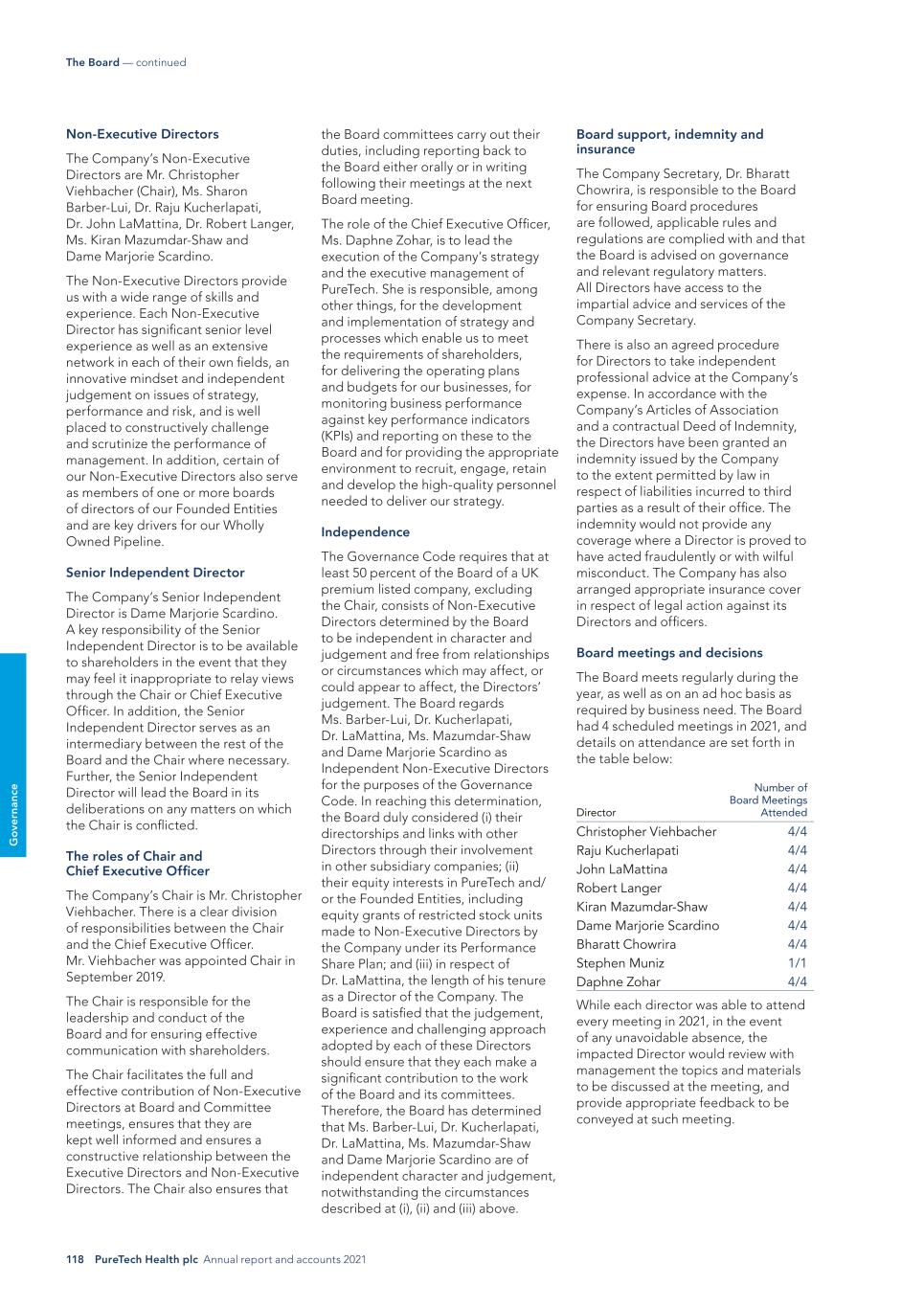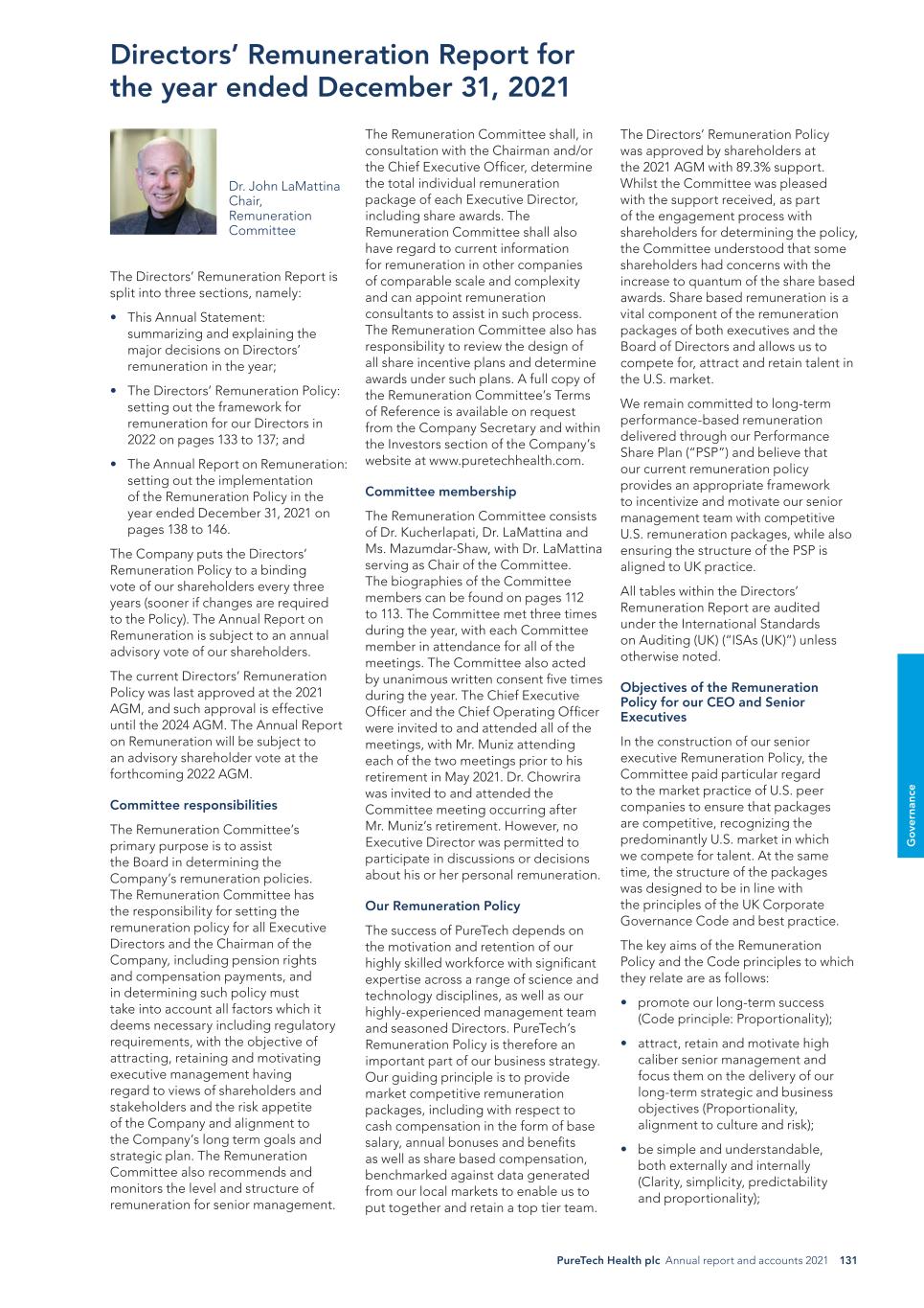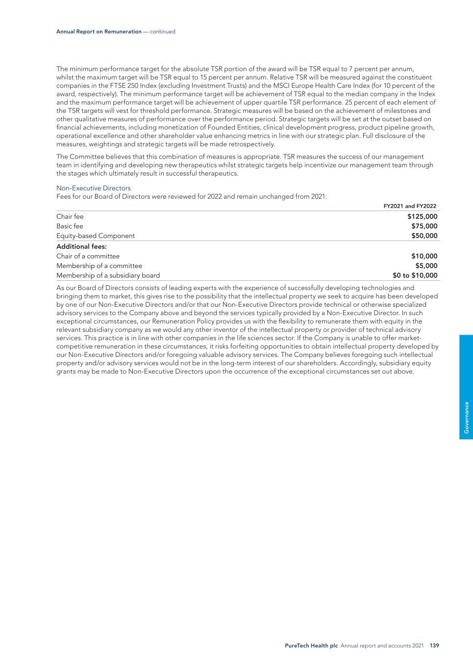 The Board 117 Directors’ Report 123 Report of the Nomination Committee 127 Report of the Audit Committee 128 Directors’ Remuneration Report 131 Directors’ Remuneration Policy 133 Annual Report on Remuneration 138 Financial statements Independent Auditor’s Report to the Members of PureTech Health plc 147 Consolidated Statements of Comprehensive Income/(Loss) 156 Consolidated Statements of Financial Position 157 Consolidated Statements of Changes in Equity 158 Consolidated Statements of Cash Flows 159 Notes to the Consolidated Financial Statements 160 PureTech Health plc Statement of Financial Position 211 PureTech Health plc Statements of Cash Flows 212 PureTech Health plc Statements of Changes in Equity 213 Notes to the Financial Statements 214 Additional information History and Development of the Company 216 Risk Factor Annex 217 Directors, Secretary and Advisors to PureTech Health plc 252 Overview Highlights of the Year 2 Components of Value 10 Letter from the Chair 12 Strategic report Letter from the Chief Executive Officer 14 Letter from the Chief Scientific Officer, Chief Medical Officer and Chief Innovation and Strategy Officer 19 How PureTech is Building Value for Investors 23 PureTech’s Wholly Owned Programs 35 PureTech’s Founded Entities 57 ESG report Our Approach to ESG and Sustainable Business 73 Governance Risk Management 90 Viability 94 Key Performance Indicators 95 Financial Review 96 Chair’s Overview 111 Board of Directors 112 Management Team 115