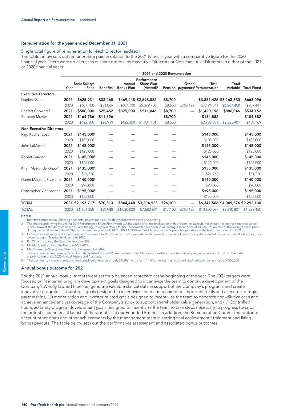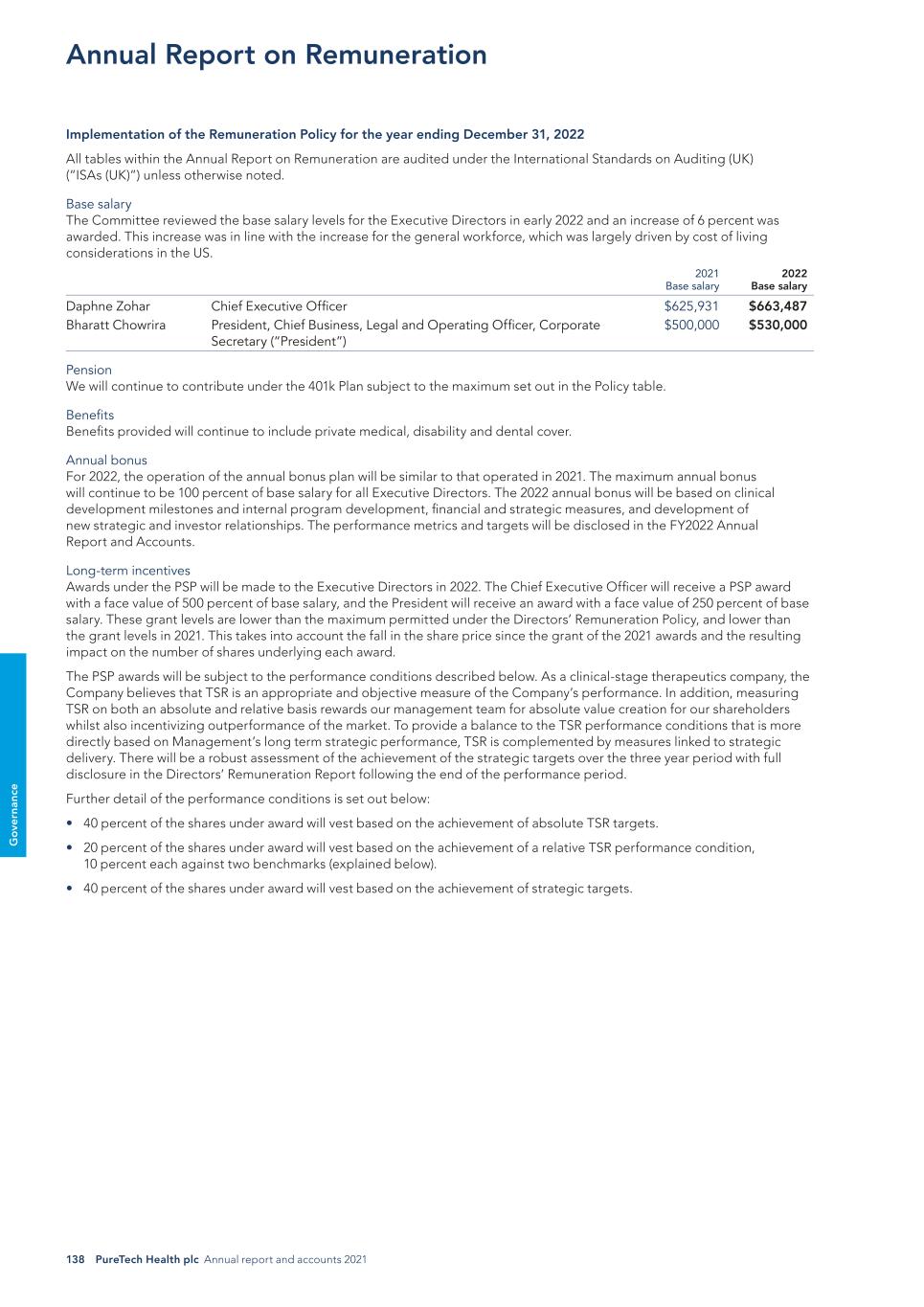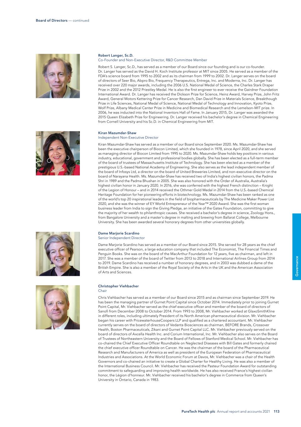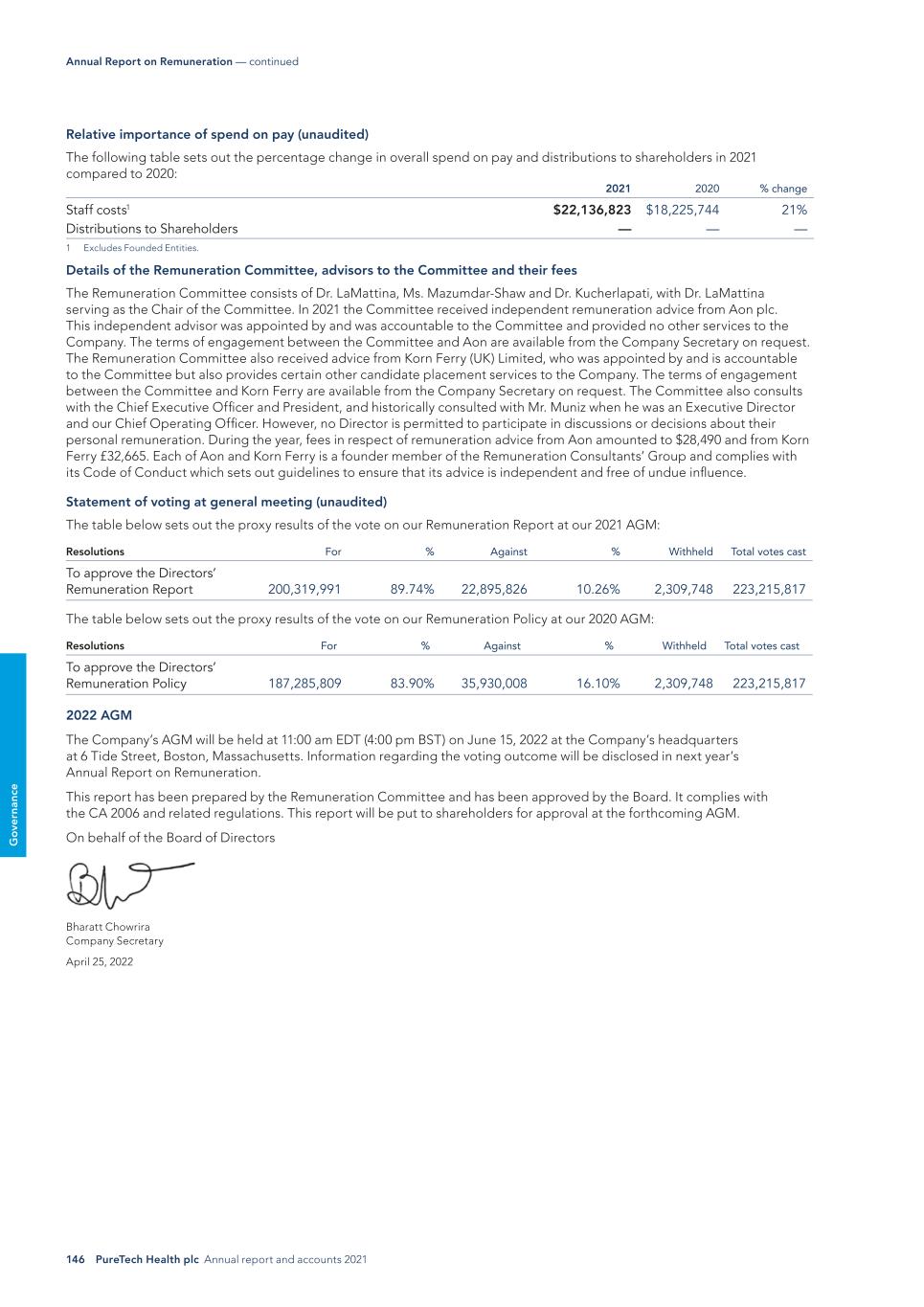 The Board 117 Directors’ Report 123 Report of the Nomination Committee 127 Report of the Audit Committee 128 Directors’ Remuneration Report 131 Directors’ Remuneration Policy 133 Annual Report on Remuneration 138 Financial statements Independent Auditor’s Report to the Members of PureTech Health plc 147 Consolidated Statements of Comprehensive Income/(Loss) 156 Consolidated Statements of Financial Position 157 Consolidated Statements of Changes in Equity 158 Consolidated Statements of Cash Flows 159 Notes to the Consolidated Financial Statements 160 PureTech Health plc Statement of Financial Position 211 PureTech Health plc Statements of Cash Flows 212 PureTech Health plc Statements of Changes in Equity 213 Notes to the Financial Statements 214 Additional information History and Development of the Company 216 Risk Factor Annex 217 Directors, Secretary and Advisors to PureTech Health plc 252 Overview Highlights of the Year 2 Components of Value 10 Letter from the Chair 12 Strategic report Letter from the Chief Executive Officer 14 Letter from the Chief Scientific Officer, Chief Medical Officer and Chief Innovation and Strategy Officer 19 How PureTech is Building Value for Investors 23 PureTech’s Wholly Owned Programs 35 PureTech’s Founded Entities 57 ESG report Our Approach to ESG and Sustainable Business 73 Governance Risk Management 90 Viability 94 Key Performance Indicators 95 Financial Review 96 Chair’s Overview 111 Board of Directors 112 Management Team 115
