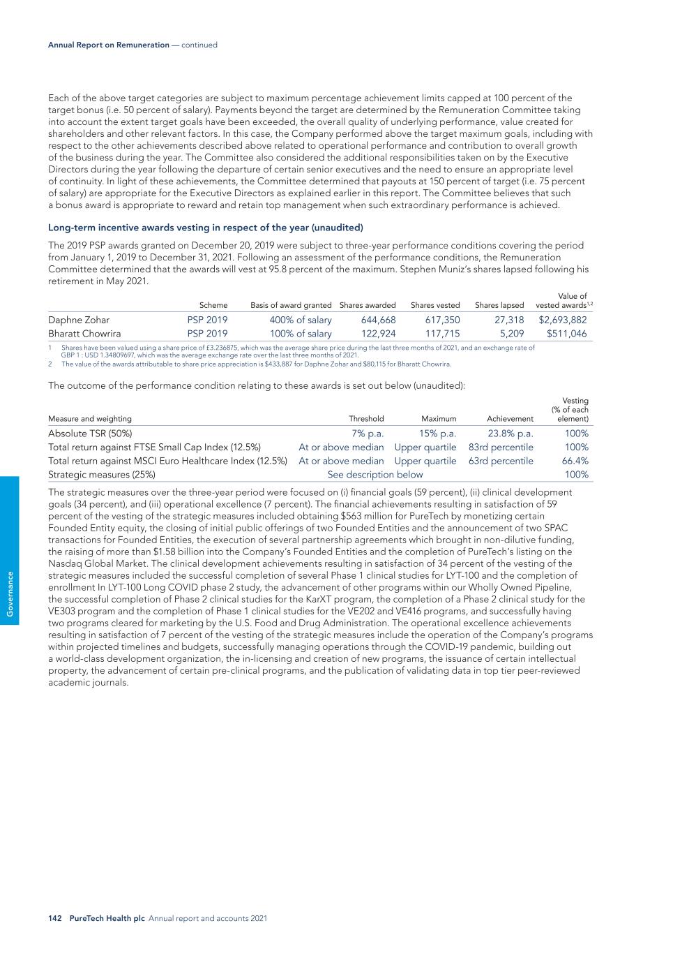 PureTech Health plc Annual report and accounts 2021 183 Fi na nc ia l s ta te m en ts AriyaStockOptionExchange-2019 InconjunctionwiththeacquisitionoftheremainingminorityinterestsofPureTechLYT(previouslynamedAriyaTherapeutics, Inc.)onOctober1,2019(PleaserefertoNote18),PureTechHealthexchangedsubsidiarystockoptionspreviouslygrantedto theco-inventors,advisorsandemployeesofPureTechLYTwithstockoptionstopurchase2,147,965oftheCompany'sordinary sharesunderthePureTechHealthPerformanceSharePlan.Asthiswasanexchangeofawardswithintheconsolidatedgroup, wherebytheCompany'sstockoptionswerereplacingAriya'sstockoptions,theexchangewasaccountedforasamodification oftheoriginalawardandtheincrementalfairvalueonthedateofthereplacementwasamortizedovertheremainingvesting periodoftheawards. ThePerformanceSharePlan InJune2015,theGroupadoptedthePerformanceStockPlan(“PSP”).UnderthePSPandsubsequentamendments,awardsof ordinarysharesmaybemadetotheDirectors,seniormanagersandemployeesof,andotherindividualsprovidingservicesto theCompanyanditssubsidiariesuptoamaximumauthorizedamountof10.0percentofthetotalordinarysharesoutstanding. Theshareshavevariousvestingtermsoveraperiodofservicebetweentwoandfouryears,providedtherecipientremains continuouslyengagedasaserviceprovider. Theshare-basedawardsgrantedunderthePSParegenerallyequitysettled(seecashsettlementsbelow)andexpire10years fromthegrantdate.AsofDecember31,2021,theCompanyhadissuedshare-basedawardstopurchaseanaggregateof 21,756,187sharesunderthisplan. RSUs RSUactivityfortheyearsended December31,2021,2020and2019isdetailedasfollows: Numberof Shares/Units WtdAvgGrant DateFairValue (GBP)(*) Outstanding (Non-vested) at January 1, 2019 6,598,783 1.29 RSUsGrantedinPeriod 1,775,569 2.95 Vested (3,738,005) 1.10 Forfeited — — Outstanding (Non-vested) at December 31, 2019 and January 1, 2020 4,636,347 2.08 RSUsGrantedinPeriod 1,759,011 1.80 Vested (2,781,687) 1.54 Forfeited (191,089) 2.37 Outstanding (Non-vested) at December 31, 2020 and January 1, 2021 3,422,582 2.46 RSUsGrantedinPeriod 2,195,133 2.15 Vested (1,176,695) 2.93 Forfeited (808,305) 2.25 Outstanding (Non-vested) at December 31, 2021 3,632,715 1.91 (*)2021–forliabilityawardsbasedonfairvalueatreportingdate. EachRSUentitlestheholdertooneordinaryshareonvestingandtheRSUawardsaregenerallybasedonacliffvesting scheduleoveraonetothree-yearrequisiteserviceperiodinwhichtheCompanyrecognizescompensationexpenseforthe RSUs.Followingvesting,eachrecipientwillberequiredtomakeapaymentofonepenceperordinaryshareonsettlementof theRSUs.VestingofthemajorityoftheRSUsissubjecttothesatisfactionofperformanceandmarketconditions.Thegrant datefairvalueofmarketconditionawardsthataretreatedasequitysettledawardsismeasuredtoreflectsuchconditionsand thereisnotrue-upfordifferencesbetweenexpectedandactualoutcomes.Forliabilitysettledawards,seebelow. TheCompanyrecognizestheestimatedfairvalueofperformance-basedawardsasshare-basedcompensationexpense overtheperformanceperiodbaseduponitsdeterminationofwhetheritisprobablethattheperformancetargetswillbe achieved.TheCompanyassessestheprobabilityofachievingtheperformancetargetsateachreportingperiod.Cumulative adjustments,ifany,arerecordedtoreflectsubsequentchangesintheestimatedoutcomeofperformance-relatedconditions. Thefairvalueofthemarketandperformance-basedawardsisbasedontheMonteCarlosimulationanalysisutilizinga GeometricBrownianMotionprocesswith100,000simulationstovaluethoseshares.Themodelconsiderssharepricevolatility, risk-freerateandothercovarianceofcomparablepubliccompaniesandothermarketdatatopredictdistributionofrelative shareperformance. TheperformanceandmarketconditionsattachedtotheRSUawardsarebasedontheachievementoftotalshareholder return (“TSR”),basedontheachievementofabsoluteTSRtargets,andtoalesserextentbasedonTSRascomparedtothe FTSE250Index,andtheMSCIEuropeHealthCareIndex.Theremainingportionisbasedontheachievementofstrategic targets.TheRSUawardperformancecriteriahavechangedovertimeasthecriteriaiscontinuallyevaluatedbytheGroup’s RemunerationCommittee. Notes to the Consolidated Financial Statements — continued 8. Share-based Payments —continued