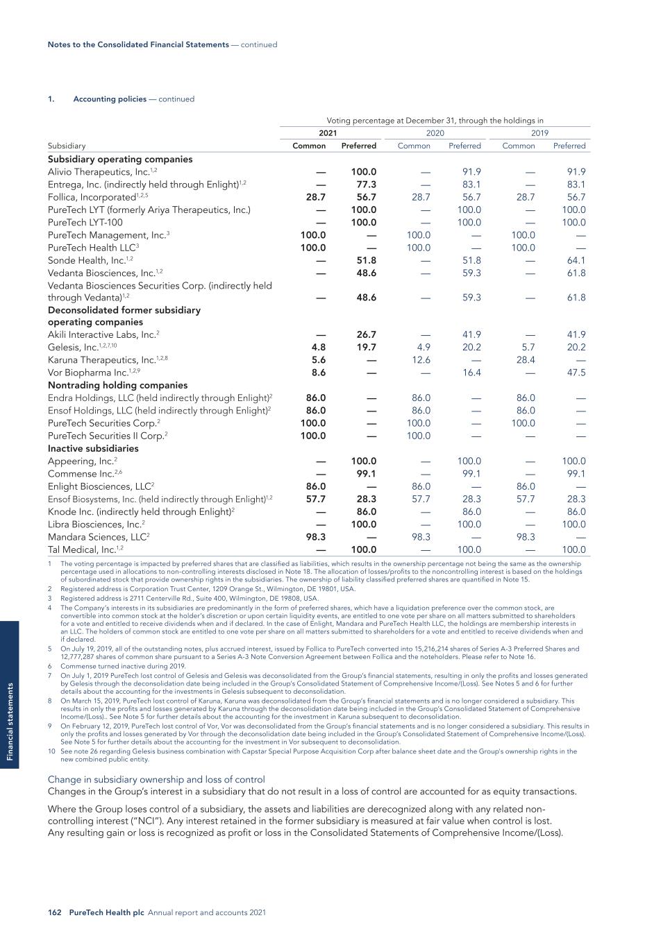 162 PureTech Health plc Annual report and accounts 2021 Fi na nc ia l s ta te m en ts VotingpercentageatDecember31,throughtheholdingsin 2021 2020 2019 Subsidiary Common Preferred Common Preferred Common Preferred Subsidiary operating companies AlivioTherapeutics,Inc.1,2 — 100.0 — 91.9 — 91.9 Entrega,Inc.(indirectlyheldthroughEnlight)1,2 — 77.3 — 83.1 — 83.1 Follica,Incorporated1,2,5 28.7 56.7 28.7 56.7 28.7 56.7 PureTechLYT(formerlyAriyaTherapeutics,Inc.) — 100.0 — 100.0 — 100.0 PureTechLYT-100 — 100.0 — 100.0 — 100.0 PureTechManagement,Inc.3 100.0 — 100.0 — 100.0 — PureTechHealthLLC3 100.0 — 100.0 — 100.0 — SondeHealth,Inc.1,2 — 51.8 — 51.8 — 64.1 VedantaBiosciences,Inc.1,2 — 48.6 — 59.3 — 61.8 VedantaBiosciencesSecuritiesCorp.(indirectlyheld throughVedanta)1,2 — 48.6 — 59.3 — 61.8 Deconsolidated former subsidiary operating companies AkiliInteractiveLabs,Inc.2 — 26.7 — 41.9 — 41.9 Gelesis,Inc.1,2,7,10 4.8 19.7 4.9 20.2 5.7 20.2 KarunaTherapeutics,Inc.1,2,8 5.6 — 12.6 — 28.4 — VorBiopharmaInc.1,2,9 8.6 — — 16.4 — 47.5 Nontrading holding companies Endra Holdings, LLC (held indirectly through Enlight)2 86.0 — 86.0 — 86.0 — Ensof Holdings, LLC (held indirectly through Enlight)2 86.0 — 86.0 — 86.0 — PureTechSecuritiesCorp.2 100.0 — 100.0 — 100.0 — PureTechSecuritiesIICorp.2 100.0 — 100.0 — — — Inactive subsidiaries Appeering,Inc.2 — 100.0 — 100.0 — 100.0 CommenseInc.2,6 — 99.1 — 99.1 — 99.1 EnlightBiosciences,LLC2 86.0 — 86.0 — 86.0 — Ensof Biosystems, Inc. (held indirectly through Enlight)1,2 57.7 28.3 57.7 28.3 57.7 28.3 KnodeInc.(indirectlyheldthroughEnlight)2 — 86.0 — 86.0 — 86.0 LibraBiosciences,Inc.2 — 100.0 — 100.0 — 100.0 MandaraSciences,LLC2 98.3 — 98.3 — 98.3 — TalMedical,Inc.1,2 — 100.0 — 100.0 — 100.0 1 Thevotingpercentageisimpactedbypreferredsharesthatareclassifiedasliabilities,whichresultsintheownershippercentagenotbeingthesameastheownership percentageusedinallocationstonon-controllinginterestsdisclosedinNote18.Theallocationoflosses/profitstothenoncontrollinginterestisbasedontheholdings of subordinatedstockthatprovideownershiprightsinthesubsidiaries.TheownershipofliabilityclassifiedpreferredsharesarequantifiedinNote15. 2 RegisteredaddressisCorporationTrustCenter,1209OrangeSt.,Wilmington,DE19801,USA. 3 Registeredaddressis2711CentervilleRd.,Suite400,Wilmington,DE19808,USA. 4 TheCompany’sinterestsinitssubsidiariesarepredominantlyintheformofpreferredshares,whichhavealiquidationpreferenceoverthecommonstock,are convertibleintocommonstockattheholder’sdiscretionoruponcertainliquidityevents,areentitledtoonevotepershareonallmatterssubmittedtoshareholders foravoteandentitledtoreceivedividendswhenandifdeclared.InthecaseofEnlight,MandaraandPureTechHealthLLC,theholdingsaremembershipinterestsin an LLC.Theholdersofcommonstockareentitledtoonevotepershareonallmatterssubmittedtoshareholdersforavoteandentitledtoreceivedividendswhenand if declared. 5 OnJuly19,2019,alloftheoutstandingnotes,plusaccruedinterest,issuedbyFollicatoPureTechconvertedinto15,216,214sharesofSeriesA-3PreferredSharesand 12,777,287sharesofcommonsharepursuanttoaSeriesA-3NoteConversionAgreementbetweenFollicaandthenoteholders.PleaserefertoNote16. 6 Commenseturnedinactiveduring2019. 7 OnJuly1,2019PureTechlostcontrolofGelesisandGelesiswasdeconsolidatedfromtheGroup’sfinancialstatements,resultinginonlytheprofitsandlossesgenerated byGelesisthroughthedeconsolidationdatebeingincludedintheGroup’sConsolidatedStatementofComprehensiveIncome/(Loss).SeeNotes5and6forfurther detailsabouttheaccountingfortheinvestmentsinGelesissubsequenttodeconsolidation. 8 OnMarch15,2019,PureTechlostcontrolofKaruna,KarunawasdeconsolidatedfromtheGroup’sfinancialstatementsandisnolongerconsideredasubsidiary.This resultsinonlytheprofitsandlossesgeneratedbyKarunathroughthedeconsolidationdatebeingincludedintheGroup’sConsolidatedStatementofComprehensive Income/(Loss)..SeeNote5forfurtherdetailsabouttheaccountingfortheinvestmentinKarunasubsequenttodeconsolidation. 9 OnFebruary12,2019,PureTechlostcontrolofVor,VorwasdeconsolidatedfromtheGroup’sfinancialstatementsandisnolongerconsideredasubsidiary.Thisresultsin onlytheprofitsandlossesgeneratedbyVorthroughthedeconsolidationdatebeingincludedintheGroup’sConsolidatedStatementofComprehensiveIncome/(Loss). SeeNote5forfurtherdetailsabouttheaccountingfortheinvestmentinVorsubsequenttodeconsolidation. 10 Seenote26regardingGelesisbusinesscombinationwithCapstarSpecialPurposeAcquisitionCorpafterbalancesheetdateandtheGroup'sownershiprightsinthe newcombinedpublicentity. Changeinsubsidiaryownershipandlossofcontrol ChangesintheGroup’sinterestinasubsidiarythatdonotresultinalossofcontrolareaccountedforasequitytransactions. WheretheGrouplosescontrolofasubsidiary,theassetsandliabilitiesarederecognizedalongwithanyrelatednon- controllinginterest(“NCI”).Anyinterestretainedintheformersubsidiaryismeasuredatfairvaluewhencontrolislost. Any resultinggainorlossisrecognizedasprofitorlossintheConsolidatedStatementsofComprehensiveIncome/(Loss). 1. Accounting policies —continued Notes to the Consolidated Financial Statements — continued