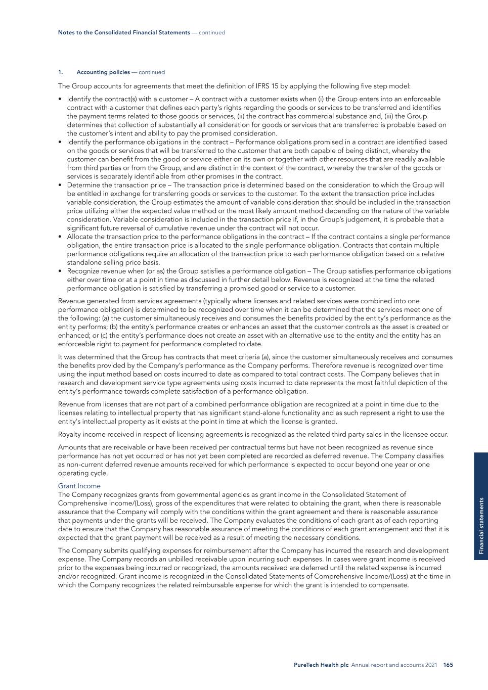 PureTech Health plc Annual report and accounts 2021 165 Fi na nc ia l s ta te m en ts TheGroupaccountsforagreementsthatmeetthedefinitionofIFRS15byapplyingthefollowingfivestepmodel: • Identifythecontract(s)withacustomer–Acontractwithacustomerexistswhen(i)theGroupentersintoanenforceable contractwithacustomerthatdefineseachparty’srightsregardingthegoodsorservicestobetransferredandidentifies thepaymenttermsrelatedtothosegoodsorservices,(ii)thecontracthascommercialsubstanceand,(iii)theGroup determinesthatcollectionofsubstantiallyallconsiderationforgoodsorservicesthataretransferredisprobablebasedon thecustomer’sintentandabilitytopaythepromisedconsideration. • Identifytheperformanceobligationsinthecontract–Performanceobligationspromisedinacontractareidentifiedbased onthegoodsorservicesthatwillbetransferredtothecustomerthatarebothcapableofbeingdistinct,wherebythe customercanbenefitfromthegoodorserviceeitheronitsownortogetherwithotherresourcesthatarereadilyavailable fromthirdpartiesorfromtheGroup,andaredistinctinthecontextofthecontract,wherebythetransferofthegoodsor servicesisseparatelyidentifiablefromotherpromisesinthecontract. • Determinethetransactionprice–ThetransactionpriceisdeterminedbasedontheconsiderationtowhichtheGroupwill beentitledinexchangefortransferringgoodsorservicestothecustomer.Totheextentthetransactionpriceincludes variableconsideration,theGroupestimatestheamountofvariableconsiderationthatshouldbeincludedinthetransaction priceutilizingeithertheexpectedvaluemethodorthemostlikelyamountmethoddependingonthenatureofthevariable consideration.Variableconsiderationisincludedinthetransactionpriceif,intheGroup’sjudgement,itisprobablethata significantfuturereversalofcumulativerevenueunderthecontractwillnotoccur. • Allocatethetransactionpricetotheperformanceobligationsinthecontract–Ifthecontractcontainsasingleperformance obligation,theentiretransactionpriceisallocatedtothesingleperformanceobligation.Contractsthatcontainmultiple performanceobligationsrequireanallocationofthetransactionpricetoeachperformanceobligationbasedonarelative standalonesellingpricebasis. • Recognizerevenuewhen(oras)theGroupsatisfiesaperformanceobligation–TheGroupsatisfiesperformanceobligations eitherovertimeoratapointintimeasdiscussedinfurtherdetailbelow.Revenueisrecognizedatthetimetherelated performanceobligationissatisfiedbytransferringapromisedgoodorservicetoacustomer. Revenuegeneratedfromservicesagreements(typicallywherelicensesandrelatedserviceswerecombinedintoone performanceobligation)isdeterminedtoberecognizedovertimewhenitcanbedeterminedthattheservicesmeetoneof thefollowing:(a)thecustomersimultaneouslyreceivesandconsumesthebenefitsprovidedbytheentity’sperformanceasthe entityperforms;(b)theentity’sperformancecreatesorenhancesanassetthatthecustomercontrolsastheassetiscreatedor enhanced;or(c)theentity’sperformancedoesnotcreateanassetwithanalternativeusetotheentityandtheentityhasan enforceablerighttopaymentforperformancecompletedtodate. ItwasdeterminedthattheGrouphascontractsthatmeetcriteria(a),sincethecustomersimultaneouslyreceivesandconsumes thebenefitsprovidedbytheCompany’sperformanceastheCompanyperforms.Thereforerevenueisrecognizedovertime usingtheinputmethodbasedoncostsincurredtodateascomparedtototalcontractcosts.TheCompanybelievesthatin researchanddevelopmentservicetypeagreementsusingcostsincurredtodaterepresentsthemostfaithfuldepictionofthe entity’sperformancetowardscompletesatisfactionofaperformanceobligation. Revenuefromlicensesthatarenotpartofacombinedperformanceobligationarerecognizedatapointintimeduetothe licensesrelatingtointellectualpropertythathassignificantstand-alonefunctionalityandassuchrepresentarighttousethe entity'sintellectualpropertyasitexistsatthepointintimeatwhichthelicenseisgranted. Royaltyincomereceivedinrespectoflicensingagreementsisrecognizedastherelatedthirdpartysalesinthelicenseeoccur. Amountsthatarereceivableorhavebeenreceivedpercontractualtermsbuthavenotbeenrecognizedasrevenuesince performancehasnotyetoccurredorhasnotyetbeencompletedarerecordedasdeferredrevenue.TheCompanyclassifies asnon-currentdeferredrevenueamountsreceivedforwhichperformanceisexpectedtooccurbeyondoneyearorone operatingcycle. GrantIncome TheCompanyrecognizesgrantsfromgovernmentalagenciesasgrantincomeintheConsolidatedStatementof ComprehensiveIncome/(Loss),grossoftheexpendituresthatwererelatedtoobtainingthegrant,whenthereisreasonable assurancethattheCompanywillcomplywiththeconditionswithinthegrantagreementandthereisreasonableassurance thatpaymentsunderthegrantswillbereceived.TheCompanyevaluatestheconditionsofeachgrantasofeachreporting datetoensurethattheCompanyhasreasonableassuranceofmeetingtheconditionsofeachgrantarrangementandthatitis expectedthatthegrantpaymentwillbereceivedasaresultofmeetingthenecessaryconditions. TheCompanysubmitsqualifyingexpensesforreimbursementaftertheCompanyhasincurredtheresearchanddevelopment expense.TheCompanyrecordsanunbilledreceivableuponincurringsuchexpenses.Incasesweregrantincomeisreceived priortotheexpensesbeingincurredorrecognized,theamountsreceivedaredeferreduntiltherelatedexpenseisincurred and/orrecognized.GrantincomeisrecognizedintheConsolidatedStatementsofComprehensiveIncome/(Loss)atthetimein whichtheCompanyrecognizestherelatedreimbursableexpenseforwhichthegrantisintendedtocompensate. 1. Accounting policies —continued Notes to the Consolidated Financial Statements — continued