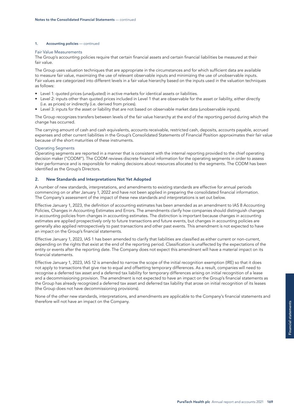 PureTech Health plc Annual report and accounts 2021 169 Fi na nc ia l s ta te m en ts FairValueMeasurements TheGroup’saccountingpoliciesrequirethatcertainfinancialassetsandcertainfinancialliabilitiesbemeasuredattheir fair value. TheGroupusesvaluationtechniquesthatareappropriateinthecircumstancesandforwhichsufficientdataareavailable tomeasurefairvalue,maximizingtheuseofrelevantobservableinputsandminimizingtheuseofunobservableinputs. Fair valuesarecategorizedintodifferentlevelsinafairvaluehierarchybasedontheinputsusedinthevaluationtechniques as follows: • Level1:quotedprices(unadjusted)inactivemarketsforidenticalassetsorliabilities. • Level2:inputsotherthanquotedpricesincludedinLevel1thatareobservablefortheassetorliability,eitherdirectly (i.e.asprices)orindirectly(i.e.derivedfromprices). • Level3:inputsfortheassetorliabilitythatarenotbasedonobservablemarketdata(unobservableinputs). TheGrouprecognizestransfersbetweenlevelsofthefairvaluehierarchyattheendofthereportingperiodduringwhichthe changehasoccurred. Thecarryingamountofcashandcashequivalents,accountsreceivable,restrictedcash,deposits,accountspayable,accrued expensesandothercurrentliabilitiesintheGroup’sConsolidatedStatementsofFinancialPositionapproximatestheirfairvalue becauseoftheshortmaturitiesoftheseinstruments. OperatingSegments Operatingsegmentsarereportedinamannerthatisconsistentwiththeinternalreportingprovidedtothechiefoperating decisionmaker(“CODM”).TheCODMreviewsdiscretefinancialinformationfortheoperatingsegmentsinordertoassess theirperformanceandisresponsibleformakingdecisionsaboutresourcesallocatedtothesegments.TheCODMhasbeen identifiedastheGroup’sDirectors. 2. New Standards and Interpretations Not Yet Adopted Anumberofnewstandards,interpretations,andamendmentstoexistingstandardsareeffectiveforannualperiods commencingonorafterJanuary1,2022andhavenotbeenappliedinpreparingtheconsolidatedfinancialinformation. The Company’sassessmentoftheimpactofthesenewstandardsandinterpretationsissetoutbelow. EffectiveJanuary1,2023,thedefinitionofaccountingestimateshasbeenamendedasanamendmenttoIAS8Accounting Policies,ChangesinAccountingEstimatesandErrors.Theamendmentsclarifyhowcompaniesshoulddistinguishchanges inaccountingpoliciesfromchangesinaccountingestimates.Thedistinctionisimportantbecausechangesinaccounting estimatesareappliedprospectivelyonlytofuturetransactionsandfutureevents,butchangesinaccountingpoliciesare generallyalsoappliedretrospectivelytopasttransactionsandotherpastevents.Thisamendmentisnotexpectedtohave an impactontheGroup’sfinancialstatements. EffectiveJanuary1,2023,IAS1hasbeenamendedtoclarifythatliabilitiesareclassifiedaseithercurrentornon-current, dependingontherightsthatexistattheendofthereportingperiod.Classificationisunaffectedbytheexpectationsofthe entityoreventsafterthereportingdate.TheCompanydoesnotexpectthisamendmentwillhaveamaterialimpactonits financialstatements. EffectiveJanuary1,2023,IAS12isamendedtonarrowthescopeoftheinitialrecognitionexemption(IRE)sothatitdoes notapplytotransactionsthatgiverisetoequalandoffsettingtemporarydifferences.Asaresult,companieswillneedto recogniseadeferredtaxassetandadeferredtaxliabilityfortemporarydifferencesarisingoninitialrecognitionofalease and adecommissioningprovision.TheamendmentisnotexpectedtohaveanimpactontheGroup’sfinancialstatementsas theGrouphasalreadyrecognizedadeferredtaxassetanddeferredtaxliabilitythataroseoninitialrecognitionofitsleases (theGroupdoesnothavedecommissioningprovisions). Noneoftheothernewstandards,interpretations,andamendmentsareapplicabletotheCompany’sfinancialstatementsand thereforewillnothaveanimpactontheCompany. 1. Accounting policies —continued Notes to the Consolidated Financial Statements — continued