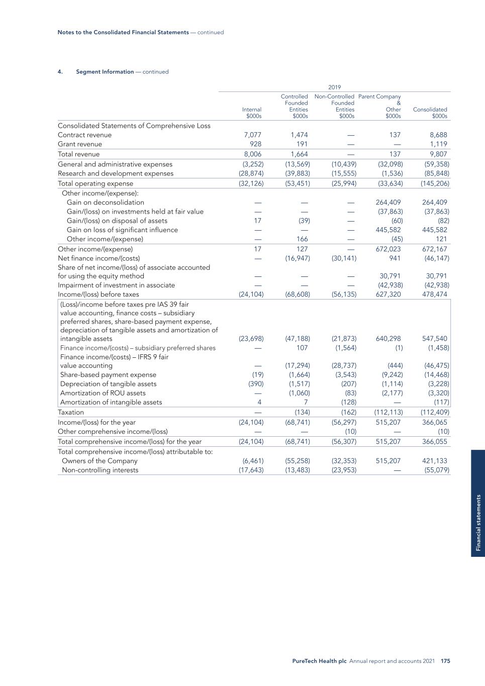 PureTech Health plc Annual report and accounts 2021 175 Fi na nc ia l s ta te m en ts 2019 Internal $000s Controlled Founded Entities $000s Non-Controlled Founded Entities $000s ParentCompany & Other $000s Consolidated $000s ConsolidatedStatementsofComprehensiveLoss Contractrevenue 7,077 1,474 — 137 8,688 Grantrevenue 928 191 — — 1,119 Totalrevenue 8,006 1,664 — 137 9,807 Generalandadministrativeexpenses (3,252) (13,569) (10,439) (32,098) (59,358) Researchanddevelopmentexpenses (28,874) (39,883) (15,555) (1,536) (85,848) Totaloperatingexpense (32,126) (53,451) (25,994) (33,634) (145,206) Otherincome/(expense): Gainondeconsolidation — — — 264,409 264,409 Gain/(loss)oninvestmentsheldatfairvalue — — — (37,863) (37,863) Gain/(loss)ondisposalofassets 17 (39) — (60) (82) Gainonlossofsignificantinfluence — — — 445,582 445,582 Otherincome/(expense) — 166 — (45) 121 Otherincome/(expense) 17 127 — 672,023 672,167 Netfinanceincome/(costs) — (16,947) (30,141) 941 (46,147) Shareofnetincome/(loss)ofassociateaccounted forusingtheequitymethod — — — 30,791 30,791 Impairmentofinvestmentinassociate — — — (42,938) (42,938) Income/(loss)beforetaxes (24,104) (68,608) (56,135) 627,320 478,474 (Loss)/incomebeforetaxespreIAS39fair valueaccounting,financecosts–subsidiary preferredshares,share-basedpaymentexpense, depreciationoftangibleassetsandamortizationof intangibleassets (23,698) (47,188) (21,873) 640,298 547,540 Finance income/(costs) – subsidiary preferred shares — 107 (1,564) (1) (1,458) Financeincome/(costs)–IFRS9fair value accounting — (17,294) (28,737) (444) (46,475) Share-basedpaymentexpense (19) (1,664) (3,543) (9,242) (14,468) Depreciationoftangibleassets (390) (1,517) (207) (1,114) (3,228) AmortizationofROUassets — (1,060) (83) (2,177) (3,320) Amortizationofintangibleassets 4 7 (128) — (117) Taxation — (134) (162) (112,113) (112,409) Income/(loss)fortheyear (24,104) (68,741) (56,297) 515,207 366,065 Othercomprehensiveincome/(loss) — — (10) — (10) Totalcomprehensiveincome/(loss)fortheyear (24,104) (68,741) (56,307) 515,207 366,055 Totalcomprehensiveincome/(loss)attributableto: OwnersoftheCompany (6,461) (55,258) (32,353) 515,207 421,133 Non-controllinginterests (17,643) (13,483) (23,953) — (55,079) Notes to the Consolidated Financial Statements — continued 4. Segment Information —continued