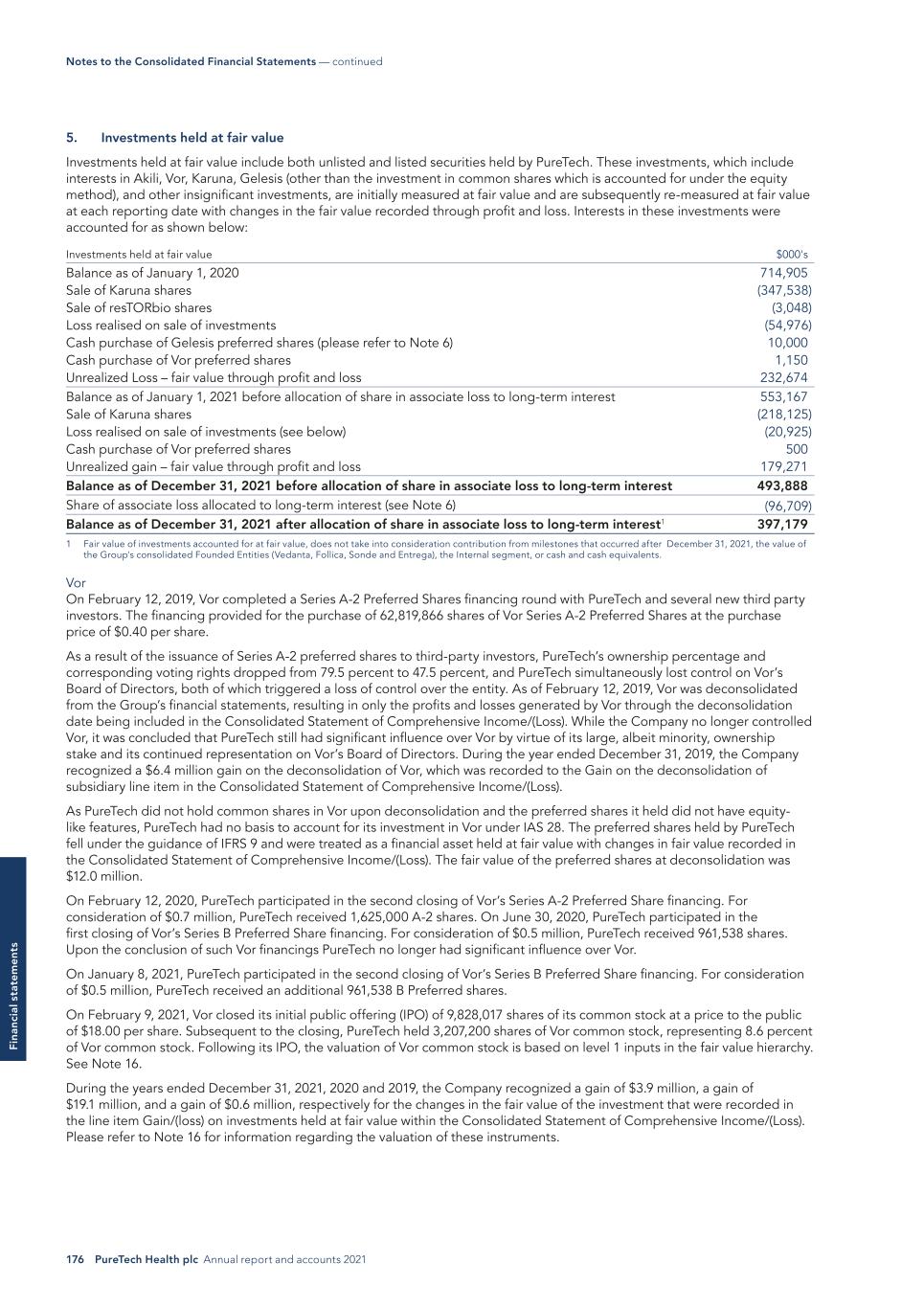 176 PureTech Health plc Annual report and accounts 2021 Fi na nc ia l s ta te m en ts 5. Investments held at fair value InvestmentsheldatfairvalueincludebothunlistedandlistedsecuritiesheldbyPureTech.Theseinvestments,whichinclude interestsinAkili,Vor,Karuna,Gelesis(otherthantheinvestmentincommonshareswhichisaccountedforundertheequity method),andotherinsignificantinvestments,areinitiallymeasuredatfairvalueandaresubsequentlyre-measuredatfairvalue ateachreportingdatewithchangesinthefairvaluerecordedthroughprofitandloss.Interestsintheseinvestmentswere accountedforasshownbelow: Investmentsheldatfairvalue $000's BalanceasofJanuary1,2020 714,905 SaleofKarunashares (347,538) SaleofresTORbioshares (3,048) Lossrealisedonsaleofinvestments (54,976) CashpurchaseofGelesispreferredshares(pleaserefertoNote6) 10,000 CashpurchaseofVorpreferredshares 1,150 UnrealizedLoss–fairvaluethroughprofitandloss 232,674 BalanceasofJanuary1,2021beforeallocationofshareinassociatelosstolong-terminterest 553,167 SaleofKarunashares (218,125) Lossrealisedonsaleofinvestments(seebelow) (20,925) CashpurchaseofVorpreferredshares 500 Unrealizedgain–fairvaluethroughprofitandloss 179,271 Balance as of December 31, 2021 before allocation of share in associate loss to long-term interest 493,888 Shareofassociatelossallocatedtolong-terminterest(seeNote6) (96,709) Balance as of December 31, 2021 after allocation of share in associate loss to long-term interest1 397,179 1 Fairvalueofinvestmentsaccountedforatfairvalue,doesnottakeintoconsiderationcontributionfrommilestonesthatoccurredafter December31,2021,thevalueof theGroup'sconsolidatedFoundedEntities(Vedanta,Follica,SondeandEntrega),theInternalsegment,orcashandcashequivalents. Vor OnFebruary12,2019,VorcompletedaSeriesA-2PreferredSharesfinancingroundwithPureTechandseveralnewthirdparty investors.Thefinancingprovidedforthepurchaseof62,819,866sharesofVorSeriesA-2PreferredSharesatthepurchase priceof$0.40pershare. AsaresultoftheissuanceofSeriesA-2preferredsharestothird-partyinvestors,PureTech’sownershippercentageand correspondingvotingrightsdroppedfrom79.5percentto47.5percent,andPureTechsimultaneouslylostcontrolonVor’s BoardofDirectors,bothofwhichtriggeredalossofcontrolovertheentity.AsofFebruary12,2019,Vorwasdeconsolidated fromtheGroup’sfinancialstatements,resultinginonlytheprofitsandlossesgeneratedbyVorthroughthedeconsolidation datebeingincludedintheConsolidatedStatementofComprehensiveIncome/(Loss).WhiletheCompanynolongercontrolled Vor,itwasconcludedthatPureTechstillhadsignificantinfluenceoverVorbyvirtueofitslarge,albeitminority,ownership stakeanditscontinuedrepresentationonVor’sBoardofDirectors.DuringtheyearendedDecember31,2019,theCompany recognizeda$6.4 milliongainonthedeconsolidationofVor,whichwasrecordedtotheGainonthedeconsolidationof subsidiarylineitemintheConsolidatedStatementofComprehensiveIncome/(Loss). AsPureTechdidnotholdcommonsharesinVorupondeconsolidationandthepreferredsharesithelddidnothaveequity- likefeatures,PureTechhadnobasistoaccountforitsinvestmentinVorunderIAS28.ThepreferredsharesheldbyPureTech fellundertheguidanceofIFRS9andweretreatedasafinancialassetheldatfairvaluewithchangesinfairvaluerecordedin theConsolidatedStatementofComprehensiveIncome/(Loss).Thefairvalueofthepreferredsharesatdeconsolidationwas $12.0 million. OnFebruary12,2020,PureTechparticipatedinthesecondclosingofVor’sSeriesA-2PreferredSharefinancing.For considerationof$0.7 million,PureTechreceived1,625,000A-2shares.OnJune30,2020,PureTechparticipatedinthe first closingofVor’sSeriesBPreferredSharefinancing.Forconsiderationof$0.5 million,PureTechreceived961,538shares. UpontheconclusionofsuchVorfinancingsPureTechnolongerhadsignificantinfluenceoverVor. OnJanuary8,2021,PureTechparticipatedinthesecondclosingofVor’sSeriesBPreferredSharefinancing.Forconsideration of$0.5million,PureTechreceivedanadditional961,538BPreferredshares. OnFebruary9,2021,Vorcloseditsinitialpublicoffering(IPO)of9,828,017sharesofitscommonstockatapricetothepublic of$18.00pershare.Subsequenttotheclosing,PureTechheld3,207,200sharesofVorcommonstock,representing8.6percent ofVorcommonstock.FollowingitsIPO,thevaluationofVorcommonstockisbasedonlevel1inputsinthefairvaluehierarchy. SeeNote16. Duringtheyearsended December31,2021,2020and2019,theCompanyrecognizedagainof$3.9 million,againof $19.1 million,andagainof$0.6 million,respectivelyforthechangesinthefairvalueoftheinvestmentthatwererecordedin thelineitemGain/(loss)oninvestmentsheldatfairvaluewithintheConsolidatedStatementofComprehensiveIncome/(Loss). PleaserefertoNote16forinformationregardingthevaluationoftheseinstruments. Notes to the Consolidated Financial Statements — continued