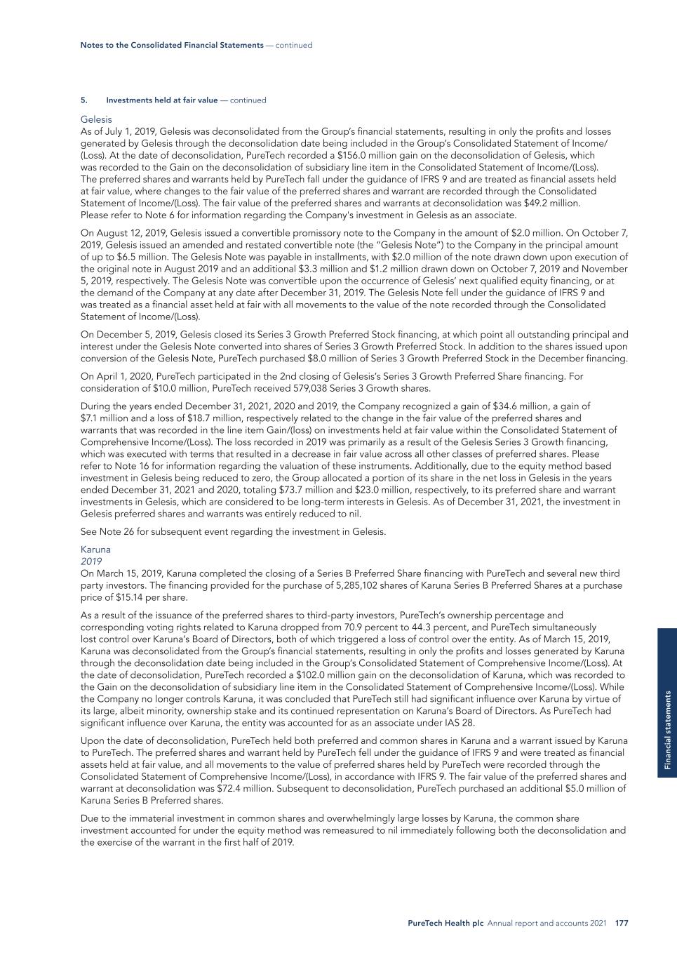 PureTech Health plc Annual report and accounts 2021 177 Fi na nc ia l s ta te m en ts Gelesis AsofJuly1,2019,GelesiswasdeconsolidatedfromtheGroup’sfinancialstatements,resultinginonlytheprofitsandlosses generatedbyGelesisthroughthedeconsolidationdatebeingincludedintheGroup’sConsolidatedStatementofIncome/ (Loss).Atthedateofdeconsolidation,PureTechrecordeda$156.0milliongainonthedeconsolidationofGelesis,which was recordedtotheGainonthedeconsolidationofsubsidiarylineitemintheConsolidatedStatementofIncome/(Loss). The preferredsharesandwarrantsheldbyPureTechfallundertheguidanceofIFRS9andaretreatedasfinancialassetsheld atfairvalue,wherechangestothefairvalueofthepreferredsharesandwarrantarerecordedthroughtheConsolidated StatementofIncome/(Loss).Thefairvalueofthepreferredsharesandwarrantsatdeconsolidationwas$49.2 million. Please refertoNote6forinformationregardingtheCompany'sinvestmentinGelesisasanassociate. OnAugust12,2019,GelesisissuedaconvertiblepromissorynotetotheCompanyintheamountof$2.0 million.OnOctober 7, 2019,Gelesisissuedanamendedandrestatedconvertiblenote(the“GelesisNote”)totheCompanyintheprincipalamount ofupto$6.5 million.TheGelesisNotewaspayableininstallments,with$2.0 millionofthenotedrawndownuponexecutionof theoriginalnoteinAugust2019andanadditional$3.3 millionand$1.2 milliondrawndownonOctober7,2019andNovember 5,2019,respectively.TheGelesisNotewasconvertibleupontheoccurrenceofGelesis’nextqualifiedequityfinancing,orat thedemandoftheCompanyatanydateafterDecember31,2019.TheGelesisNotefellundertheguidanceofIFRS9and wastreatedasafinancialassetheldatfairwithallmovementstothevalueofthenoterecordedthroughtheConsolidated StatementofIncome/(Loss). OnDecember5,2019,GelesiscloseditsSeries3GrowthPreferredStockfinancing,atwhichpointalloutstandingprincipaland interestundertheGelesisNoteconvertedintosharesofSeries3GrowthPreferredStock.Inadditiontothesharesissuedupon conversionoftheGelesisNote,PureTechpurchased$8.0 millionofSeries3GrowthPreferredStockintheDecemberfinancing. OnApril1,2020,PureTechparticipatedinthe2ndclosingofGelesis’sSeries3GrowthPreferredSharefinancing.For considerationof$10.0 million,PureTechreceived579,038Series3Growthshares. Duringtheyearsended December31,2021,2020and2019,theCompanyrecognizedagainof$34.6 million,againof $7.1 millionandalossof$18.7 million,respectivelyrelatedtothechangeinthefairvalueofthepreferredsharesand warrantsthatwasrecordedinthelineitemGain/(loss)oninvestmentsheldatfairvaluewithintheConsolidatedStatementof ComprehensiveIncome/(Loss).Thelossrecordedin2019wasprimarilyasaresultoftheGelesisSeries3Growthfinancing, whichwasexecutedwithtermsthatresultedinadecreaseinfairvalueacrossallotherclassesofpreferredshares.Please refertoNote16forinformationregardingthevaluationoftheseinstruments.Additionally,duetotheequitymethodbased investmentinGelesisbeingreducedtozero,theGroupallocatedaportionofitsshareinthenetlossinGelesisintheyears ended December31,2021and2020,totaling$73.7millionand$23.0 million,respectively,toitspreferredshareandwarrant investmentsinGelesis,whichareconsideredtobelong-terminterestsinGelesis.AsofDecember31,2021,theinvestmentin Gelesispreferredsharesandwarrantswasentirelyreducedto nil. SeeNote26forsubsequenteventregardingtheinvestmentinGelesis. Karuna 2019 OnMarch15,2019,KarunacompletedtheclosingofaSeriesBPreferredSharefinancingwithPureTechandseveralnewthird partyinvestors.Thefinancingprovidedforthepurchaseof5,285,102sharesofKarunaSeriesBPreferredSharesatapurchase priceof$15.14pershare. Asaresultoftheissuanceofthepreferredsharestothird-partyinvestors,PureTech’sownershippercentageand correspondingvotingrightsrelatedtoKarunadroppedfrom70.9percentto44.3percent,andPureTechsimultaneously lostcontroloverKaruna’sBoardofDirectors,bothofwhichtriggeredalossofcontrolovertheentity.AsofMarch15,2019, KarunawasdeconsolidatedfromtheGroup’sfinancialstatements,resultinginonlytheprofitsandlossesgeneratedbyKaruna throughthedeconsolidationdatebeingincludedintheGroup’sConsolidatedStatementofComprehensiveIncome/(Loss).At thedateofdeconsolidation,PureTechrecordeda$102.0 milliongainonthedeconsolidationofKaruna,whichwasrecordedto theGainonthedeconsolidationofsubsidiarylineitemintheConsolidatedStatementofComprehensiveIncome/(Loss).While theCompanynolongercontrolsKaruna,itwasconcludedthatPureTechstillhadsignificantinfluenceoverKarunabyvirtueof itslarge,albeitminority,ownershipstakeanditscontinuedrepresentationonKaruna’sBoardofDirectors.AsPureTechhad significantinfluenceoverKaruna,theentitywasaccountedforasanassociateunderIAS28. Uponthedateofdeconsolidation,PureTechheldbothpreferredandcommonsharesinKarunaandawarrantissuedbyKaruna toPureTech.ThepreferredsharesandwarrantheldbyPureTechfellundertheguidanceofIFRS9andweretreatedasfinancial assetsheldatfairvalue,andallmovementstothevalueofpreferredsharesheldbyPureTechwererecordedthroughthe ConsolidatedStatementofComprehensiveIncome/(Loss),inaccordancewithIFRS9.Thefairvalueofthepreferredsharesand warrantatdeconsolidationwas$72.4 million.Subsequenttodeconsolidation,PureTechpurchasedanadditional$5.0 millionof KarunaSeriesBPreferredshares. DuetotheimmaterialinvestmentincommonsharesandoverwhelminglylargelossesbyKaruna,thecommonshare investmentaccountedforundertheequitymethodwasremeasuredtonilimmediatelyfollowingboththedeconsolidationand theexerciseofthewarrantinthefirsthalfof2019. Notes to the Consolidated Financial Statements — continued 5. Investments held at fair value —continued