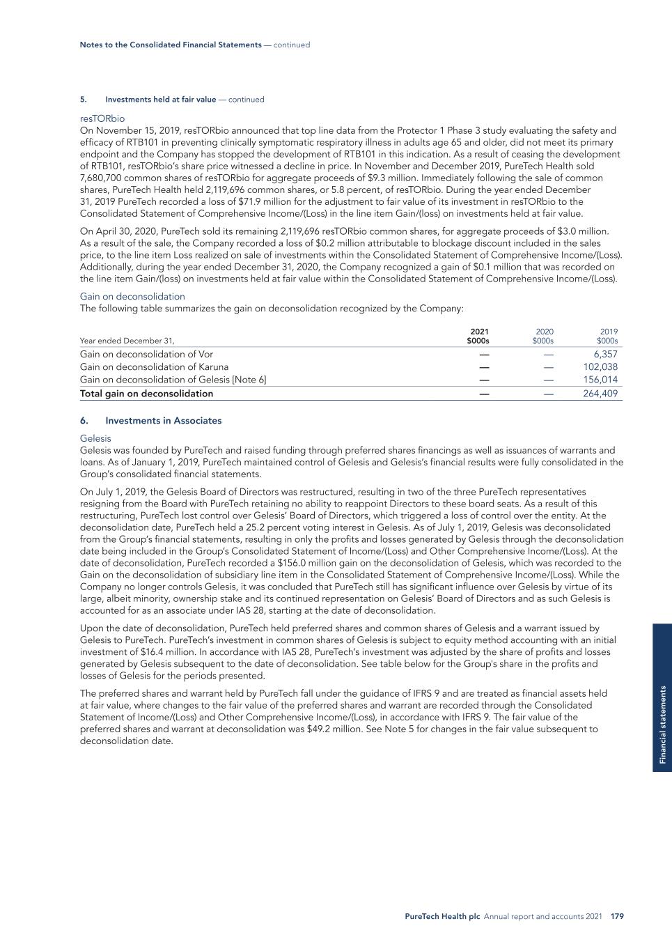 PureTech Health plc Annual report and accounts 2021 179 Fi na nc ia l s ta te m en ts resTORbio OnNovember15,2019,resTORbioannouncedthattoplinedatafromtheProtector1Phase3studyevaluatingthesafetyand efficacyofRTB101inpreventingclinicallysymptomaticrespiratoryillnessinadultsage65andolder,didnotmeetitsprimary endpointandtheCompanyhasstoppedthedevelopmentofRTB101inthisindication.Asaresultofceasingthedevelopment ofRTB101,resTORbio’ssharepricewitnessedadeclineinprice.InNovemberandDecember2019,PureTechHealthsold 7,680,700commonsharesofresTORbioforaggregateproceedsof$9.3 million.Immediatelyfollowingthesaleofcommon shares,PureTechHealthheld2,119,696commonshares,or5.8percent,ofresTORbio.DuringtheyearendedDecember 31,2019PureTechrecordedalossof$71.9 millionfortheadjustmenttofairvalueofitsinvestmentinresTORbioto the ConsolidatedStatementofComprehensiveIncome/(Loss)inthelineitemGain/(loss)oninvestmentsheldatfairvalue. OnApril30,2020,PureTechsolditsremaining2,119,696resTORbiocommonshares,foraggregateproceedsof$3.0 million. Asaresultofthesale,theCompanyrecordedalossof$0.2 millionattributabletoblockagediscountincludedinthesales price,tothelineitemLossrealizedonsaleofinvestmentswithintheConsolidatedStatementofComprehensiveIncome/(Loss). Additionally,duringtheyearendedDecember31,2020,theCompanyrecognizedagainof$0.1 millionthatwasrecordedon thelineitemGain/(loss)oninvestmentsheldatfairvaluewithintheConsolidatedStatementofComprehensiveIncome/(Loss). Gainondeconsolidation ThefollowingtablesummarizesthegainondeconsolidationrecognizedbytheCompany: 2021 $000s 2020 $000s 2019 $000sYearended December31, GainondeconsolidationofVor — — 6,357 GainondeconsolidationofKaruna — — 102,038 GainondeconsolidationofGelesis[Note6] — — 156,014 Total gain on deconsolidation — — 264,409 Notes to the Consolidated Financial Statements — continued 5. Investments held at fair value —continued 6. Investments in Associates Gelesis GelesiswasfoundedbyPureTechandraisedfundingthroughpreferredsharesfinancingsaswellasissuancesofwarrantsand loans.AsofJanuary1,2019,PureTechmaintainedcontrolofGelesisandGelesis’sfinancialresultswerefullyconsolidatedinthe Group’sconsolidatedfinancialstatements. OnJuly1,2019,theGelesisBoardofDirectorswasrestructured,resultingintwoofthethreePureTechrepresentatives resigningfromtheBoardwithPureTechretainingnoabilitytoreappointDirectorstotheseboardseats.Asaresultofthis restructuring,PureTechlostcontroloverGelesis’BoardofDirectors,whichtriggeredalossofcontrolovertheentity.Atthe deconsolidationdate,PureTechhelda25.2percentvotinginterestinGelesis.AsofJuly1,2019,Gelesiswasdeconsolidated fromtheGroup’sfinancialstatements,resultinginonlytheprofitsandlossesgeneratedbyGelesisthroughthedeconsolidation datebeingincludedintheGroup’sConsolidatedStatementofIncome/(Loss)andOtherComprehensiveIncome/(Loss).Atthe dateofdeconsolidation,PureTechrecordeda$156.0milliongainonthedeconsolidationofGelesis,whichwasrecordedtothe GainonthedeconsolidationofsubsidiarylineitemintheConsolidatedStatementofComprehensiveIncome/(Loss).Whilethe CompanynolongercontrolsGelesis,itwasconcludedthatPureTechstillhassignificantinfluenceoverGelesisbyvirtueofits large,albeitminority,ownershipstakeanditscontinuedrepresentationonGelesis’BoardofDirectorsandassuchGelesisis accountedforasanassociateunderIAS28,startingatthedateofdeconsolidation. Uponthedateofdeconsolidation,PureTechheldpreferredsharesandcommonsharesofGelesisandawarrantissuedby GelesistoPureTech.PureTech’sinvestmentincommonsharesofGelesisissubjecttoequitymethodaccountingwithaninitial investmentof$16.4million.InaccordancewithIAS28,PureTech’sinvestmentwasadjustedbytheshareofprofitsandlosses generatedbyGelesissubsequenttothedateofdeconsolidation.SeetablebelowfortheGroup'sshareintheprofitsand lossesofGelesisfortheperiodspresented. ThepreferredsharesandwarrantheldbyPureTechfallundertheguidanceofIFRS9andaretreatedasfinancialassetsheld atfairvalue,wherechangestothefairvalueofthepreferredsharesandwarrantarerecordedthroughtheConsolidated StatementofIncome/(Loss)andOtherComprehensiveIncome/(Loss),inaccordancewithIFRS9.Thefairvalueofthe preferredsharesandwarrantatdeconsolidationwas$49.2 million.SeeNote5forchangesinthefairvaluesubsequentto deconsolidationdate.