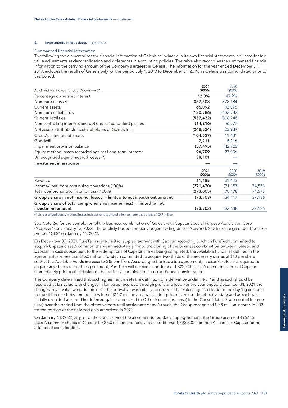 PureTech Health plc Annual report and accounts 2021 181 Fi na nc ia l s ta te m en ts Summarizedfinancialinformation ThefollowingtablesummarizesthefinancialinformationofGelesisasincludedinitsownfinancialstatements,adjustedforfair valueadjustmentsatdeconsolidationanddifferencesinaccountingpolicies.Thetablealsoreconcilesthesummarizedfinancial informationtothecarryingamountoftheCompany’sinterestinGelesis.TheinformationfortheyearendedDecember31, 2019,includestheresultsofGelesisonlyfortheperiodJuly1,2019toDecember31,2019,asGelesiswasconsolidatedpriorto thisperiod. 2021 $000s 2020 $000sAsofandfortheyearendedDecember31, Percentageownershipinterest 42.0% 47.9% Non-currentassets 357,508 372,184 Currentassets 66,092 92,875 Non-currentliabilities (120,786) (133,743) Currentliabilities (537,432) (300,748) Noncontrollinginterestsandoptionsissuedtothirdparties (14,216) (6,577) NetassetsattributabletoshareholdersofGelesisInc. (248,834) 23,989 Group'sshareofnetassets (104,527) 11,481 Goodwill 7,211 8,216 Impairmentprovisionbalance (37,495) (42,702) EquitymethodlossesrecordedagainstLong-termInterests 96,709 23,006 Unrecognizedequitymethodlosses(*) 38,101 — Investment in associate — — 2021 $000s 2020 $000s 2019 $000s Revenue 11,185 21,442 — Income/(loss)fromcontinuingoperations(100%) (271,430) (71,157) 74,573 Totalcomprehensiveincome/(loss)(100%) (273,005) (70,178) 74,573 Group's share in net income (losses) – limited to net investment amount (73,703) (34,117) 37,136 Group's share of total comprehensive income (loss) – limited to net investment amount (73,703) (33,648) 37,136 (*)Unrecognizedequitymethodlossesincludesunrecognizedothercomprehensivelossof$0.7million. SeeNote26,forthecompletionofthebusinesscombinationofGelesiswithCapstarSpecialPurposeAcquisitionCorp ("Capstar")onJanuary13,2022.ThepubliclytradedcompanybegantradingontheNewYorkStockexchangeundertheticker symbol"GLS"onJanuary14,2022. OnDecember30,2021,PureTechsignedaBackstopagreementwithCapstaraccordingtowhichPureTechcommittedto acquireCapstarclassAcommonsharesimmediatelypriortotheclosingofthebusinesscombinationbetweenGelesisand Capstar,incasesubsequenttotheredemptionsofCapstarsharesbeingcompleted,theAvailableFunds,asdefinedinthe agreement,arelessthan$15.0million.Puretechcommittedtoacquiretwothirdsofthenecessarysharesat$10pershare sothattheAvailableFundsincreaseto$15.0million.AccordingtotheBackstopagreement,incasePureTechisrequiredto acquireanysharesundertheagreement,PureTechwillreceiveanadditional1,322,500classAcommonsharesofCapstar (immediatelypriortotheclosingofthebusinesscombination)atnoadditionalconsideration. TheCompanydeterminedthatsuchagreementmeetsthedefinitionofaderivativeunderIFRS9andassuchshouldbe recordedatfairvaluewithchangesinfairvaluerecordedthroughprofitandloss.FortheyearendedDecember31,2021the changesinfairvalueweredeminimis.Thederivativewasinitiallyrecordedatfairvalueadjustedtodefertheday1gainequal tothedifferencebetweenthefairvalueof$11.2millionandtransactionpriceofzeroontheeffectivedateandassuchwas initiallyrecordedatzero.ThedeferredgainisamortizedtoOtherincome(expense)intheConsolidatedStatementofIncome (loss)overtheperiodfromtheeffectivedateuntilsettlementdate.Assuch,theGrouprecognized$0.8millionincomein2021 fortheportionofthedeferredgainamortizedin2021. OnJanuary13,2022,aspartoftheconclusionoftheaforementionedBackstopagreement,theGroupacquired496,145 classAcommonsharesofCapstarfor$5.0millionandreceivedanadditional1,322,500commonAsharesofCapstarforno additionalconsideration. 6. Investments in Associates —continued Notes to the Consolidated Financial Statements — continued