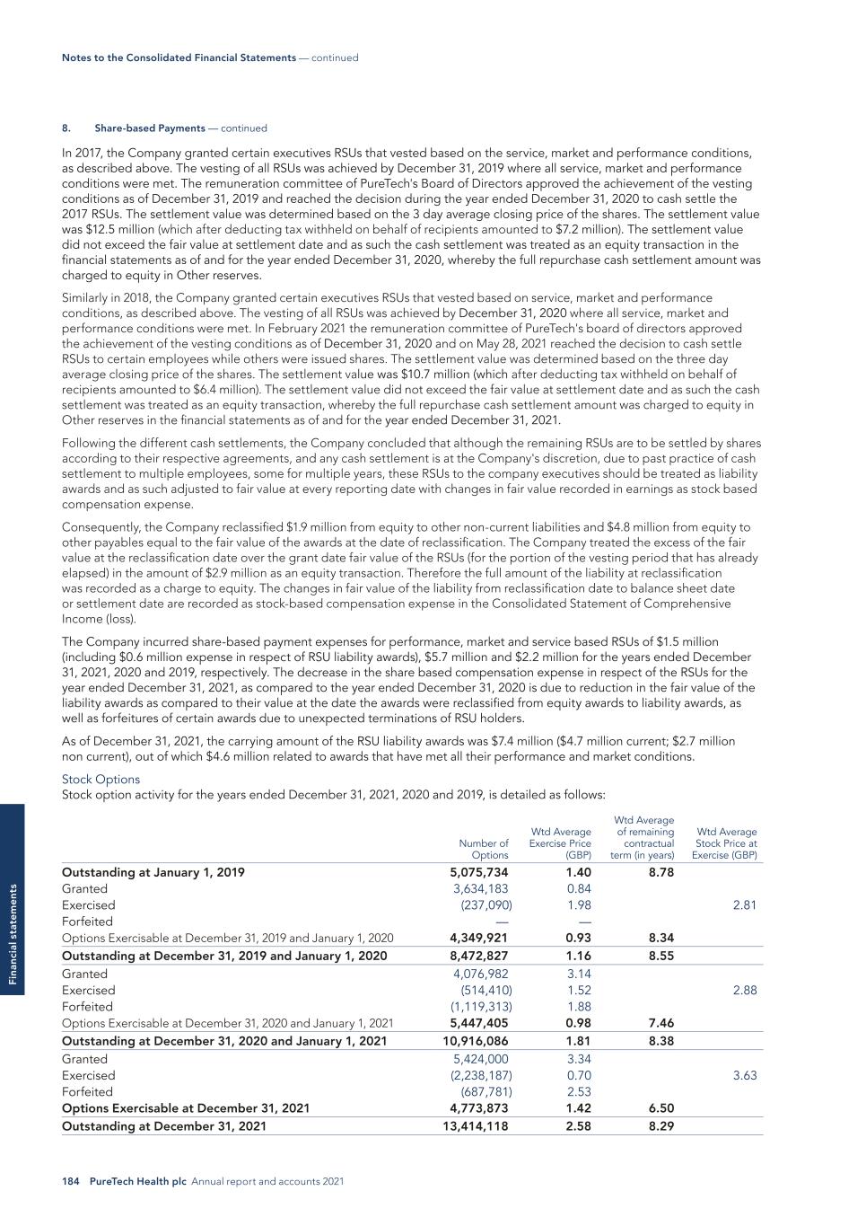 184 PureTech Health plc Annual report and accounts 2021 Fi na nc ia l s ta te m en ts In2017,theCompanygrantedcertainexecutivesRSUsthatvestedbasedontheservice,marketandperformanceconditions, asdescribedabove.ThevestingofallRSUswasachievedbyDecember31,2019whereallservice,marketandperformance conditionsweremet.TheremunerationcommitteeofPureTech'sBoardofDirectorsapprovedtheachievementofthevesting conditionsasofDecember31,2019andreachedthedecisionduringtheyearendedDecember31,2020tocashsettlethe 2017RSUs.Thesettlementvaluewasdeterminedbasedonthe3dayaverageclosingpriceoftheshares.Thesettlementvalue was$12.5 million (which after deducting tax withheld on behalf of recipients amounted to $7.2 million).Thesettlementvalue didnotexceedthefairvalueatsettlementdateandassuchthecashsettlementwastreatedasanequitytransactioninthe financialstatementsasofandfortheyearendedDecember31,2020,wherebythefullrepurchasecashsettlementamountwas chargedtoequityinOtherreserves. Similarly in 2018, the Company granted certain executives RSUs that vested based on service, market and performance conditions, as described above. The vesting of all RSUs was achieved by December31,2020 where all service, market and performance conditions were met. In February 2021 the remuneration committee of PureTech's board of directors approved the achievement of the vesting conditions as of December31,2020and on May 28, 2021 reached the decision to cash settle RSUs to certain employees while others were issued shares. The settlement value was determined based on the three day average closing price of the shares. The settlement valuewas$10.7million(whichafter deducting tax withheld on behalf of recipients amounted to $6.4 million). The settlement value did not exceed the fair value at settlement date and as such the cash settlement was treated as an equity transaction, whereby the full repurchase cash settlement amount was charged to equity in Other reserves in the financial statements as of and for the yearended December31,2021. Following the different cash settlements, the Company concluded that although the remaining RSUs are to be settled by shares according to their respective agreements, and any cash settlement is at the Company's discretion, due to past practice of cash settlement to multiple employees, some for multiple years, these RSUs to the company executives should be treated as liability awards and as such adjusted to fair value at every reporting date with changes in fair value recorded in earnings as stock based compensation expense. Consequently, the Company reclassified $1.9 million from equity to other non-current liabilities and $4.8 million from equity to other payables equal to the fair value of the awards at the date of reclassification. The Company treated the excess of the fair value at the reclassification date over the grant date fair value of the RSUs (for the portion of the vesting period that has already elapsed) in the amount of $2.9 million as an equity transaction. Therefore the full amount of the liability at reclassification was recorded as a charge to equity. The changes in fair value of the liability from reclassification date to balance sheet date or settlement date are recorded as stock-based compensation expense in the Consolidated Statement of Comprehensive Income (loss). TheCompanyincurredshare-basedpaymentexpensesforperformance,marketandservicebasedRSUsof$1.5million (including$0.6millionexpenseinrespectofRSUliabilityawards),$5.7millionand$2.2millionfortheyearsended December 31,2021,2020and2019,respectively.ThedecreaseinthesharebasedcompensationexpenseinrespectoftheRSUsforthe yearended December31,2021,ascomparedtotheyearendedDecember31,2020isduetoreductioninthefairvalueofthe liabilityawardsascomparedtotheirvalueatthedatetheawardswerereclassifiedfromequityawardstoliabilityawards,as wellasforfeituresofcertainawardsduetounexpectedterminationsofRSUholders. AsofDecember31,2021,thecarryingamountoftheRSUliabilityawardswas$7.4million($4.7millioncurrent;$2.7million non current),outofwhich$4.6millionrelatedtoawardsthathavemetalltheirperformanceandmarketconditions. StockOptions Stockoptionactivityfortheyearsended December31,2021,2020and2019,isdetailedasfollows: Numberof Options Wtd Average ExercisePrice (GBP) Wtd Average of remaining contractual term(inyears) Wtd Average StockPriceat Exercise(GBP) Outstanding at January 1, 2019 5,075,734 1.40 8.78 Granted 3,634,183 0.84 Exercised (237,090) 1.98 2.81 Forfeited — — Options Exercisable at December 31, 2019 and January 1, 2020 4,349,921 0.93 8.34 Outstanding at December 31, 2019 and January 1, 2020 8,472,827 1.16 8.55 Granted 4,076,982 3.14 Exercised (514,410) 1.52 2.88 Forfeited (1,119,313) 1.88 Options Exercisable at December 31, 2020 and January 1, 2021 5,447,405 0.98 7.46 Outstanding at December 31, 2020 and January 1, 2021 10,916,086 1.81 8.38 Granted 5,424,000 3.34 Exercised (2,238,187) 0.70 3.63 Forfeited (687,781) 2.53 Options Exercisable at December 31, 2021 4,773,873 1.42 6.50 Outstanding at December 31, 2021 13,414,118 2.58 8.29 8. Share-based Payments —continued Notes to the Consolidated Financial Statements — continued
