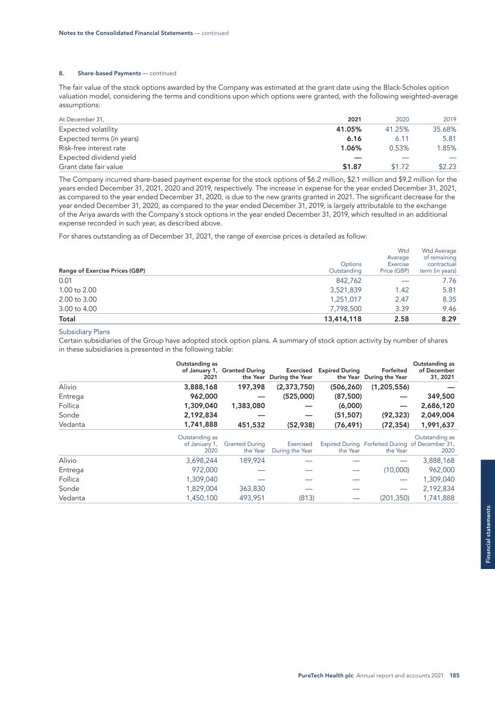 PureTech Health plc Annual report and accounts 2021 185 Fi na nc ia l s ta te m en ts ThefairvalueofthestockoptionsawardedbytheCompanywasestimatedatthegrantdateusingtheBlack-Scholesoption valuationmodel,consideringthetermsandconditionsuponwhichoptionsweregranted,withthefollowingweighted-average assumptions: AtDecember31, 2021 2020 2019 Expectedvolatility 41.05% 41.25% 35.68% Expectedterms(inyears) 6.16 6.11 5.81 Risk-freeinterestrate 1.06% 0.53% 1.85% Expecteddividendyield — — — Grantdatefairvalue $1.87 $1.72 $2.23 TheCompanyincurredshare-basedpaymentexpenseforthestockoptionsof$6.2million,$2.1millionand$9.2millionforthe yearsended December31,2021,2020and2019,respectively.Theincreaseinexpensefortheyearended December31,2021, ascomparedtotheyearended December31,2020,isduetothenewgrantsgrantedin2021.Thesignificantdecreaseforthe yearended December31,2020,ascomparedtotheyearended December31,2019,islargelyattributabletotheexchange oftheAriyaawardswiththeCompany'sstockoptionsintheyearended December31,2019,whichresultedinanadditional expenserecordedinsuchyear,asdescribedabove. ForsharesoutstandingasofDecember31,2021,therangeofexercisepricesisdetailedasfollow: Range of Exercise Prices (GBP) Options Outstanding Wtd Average Exercise Price(GBP) Wtd Average of remaining contractual term(inyears) 0.01 842,762 — 7.76 1.00to2.00 3,521,839 1.42 5.81 2.00to3.00 1,251,017 2.47 8.35 3.00to4.00 7,798,500 3.39 9.46 Total 13,414,118 2.58 8.29 SubsidiaryPlans CertainsubsidiariesoftheGrouphaveadoptedstockoptionplans.Asummaryofstockoptionactivitybynumberofshares in thesesubsidiariesispresentedinthefollowingtable: Outstanding as of January 1, 2021 Granted During the Year Exercised During the Year Expired During the Year Forfeited During the Year Outstanding as of December 31, 2021 Alivio 3,888,168 197,398 (2,373,750) (506,260) (1,205,556) — Entrega 962,000 — (525,000) (87,500) — 349,500 Follica 1,309,040 1,383,080 — (6,000) — 2,686,120 Sonde 2,192,834 — — (51,507) (92,323) 2,049,004 Vedanta 1,741,888 451,532 (52,938) (76,491) (72,354) 1,991,637 Outstandingas ofJanuary1, 2020 GrantedDuring theYear Exercised DuringtheYear ExpiredDuring theYear ForfeitedDuring theYear Outstandingas ofDecember31, 2020 Alivio 3,698,244 189,924 — — — 3,888,168 Entrega 972,000 — — — (10,000) 962,000 Follica 1,309,040 — — — — 1,309,040 Sonde 1,829,004 363,830 — — — 2,192,834 Vedanta 1,450,100 493,951 (813) — (201,350) 1,741,888 8. Share-based Payments —continued Notes to the Consolidated Financial Statements — continued