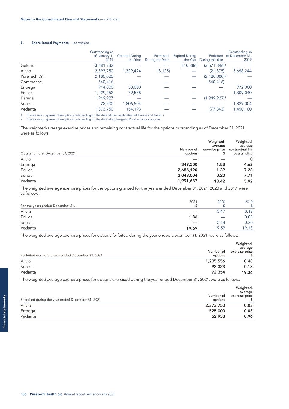 186 PureTech Health plc Annual report and accounts 2021 Fi na nc ia l s ta te m en ts Outstandingas ofJanuary1, 2019 GrantedDuring theYear Exercised DuringtheYear ExpiredDuring theYear Forfeited DuringtheYear Outstandingas ofDecember31, 2019 Gelesis 3,681,732 — — (110,386) (3,571,346)¹ — Alivio 2,393,750 1,329,494 (3,125) — (21,875) 3,698,244 PureTechLYT 2,180,000 — — — (2,180,000)² — Commense 540,416 — — — (540,416) — Entrega 914,000 58,000 — — — 972,000 Follica 1,229,452 79,588 — — — 1,309,040 Karuna 1,949,927 — — — (1,949,927)¹ — Sonde 22,500 1,806,504 — — — 1,829,004 Vedanta 1,373,750 154,193 — — (77,843) 1,450,100 1 ThesesharesrepresenttheoptionsoutstandingonthedateofdeconsolidationofKarunaandGelesis. 2 ThesesharesrepresenttheoptionsoutstandingonthedateofexchangetoPureTechstockoptions. Theweighted-averageexercisepricesandremainingcontractuallifefortheoptionsoutstandingasofDecember31,2021, wereas follows: OutstandingatDecember31,2021 Number of options Weighted- average exercise price $ Weighted- average contractual life outstanding Alivio — — 0 Entrega 349,500 1.88 4.62 Follica 2,686,120 1.39 7.28 Sonde 2,049,004 0.20 7.71 Vedanta 1,991,637 13.42 5.92 Theweightedaverageexercisepricesfortheoptionsgrantedfortheyearsended December31,2021,2020and2019,were as follows: FortheyearsendedDecember31, 2021 $ 2020 $ 2019 $ Alivio — 0.47 0.49 Follica 1.86 — 0.03 Sonde — 0.18 0.20 Vedanta 19.69 19.59 19.13 Theweightedaverageexercisepricesforoptionsforfeitedduringthe yearended December31,2021,wereasfollows: ForfeitedduringtheyearendedDecember31,2021 Number of options Weighted- average exercise price $ Alivio 1,205,556 0.48 Sonde 92,323 0.18 Vedanta 72,354 19.36 TheweightedaverageexercisepricesforoptionsexercisedduringtheyearendedDecember31,2021,wereasfollows: ExercisedduringtheyearendedDecember31,2021 Number of options Weighted- average exercise price $ Alivio 2,373,750 0.03 Entrega 525,000 0.03 Vedanta 52,938 0.96 8. Share-based Payments —continued Notes to the Consolidated Financial Statements — continued