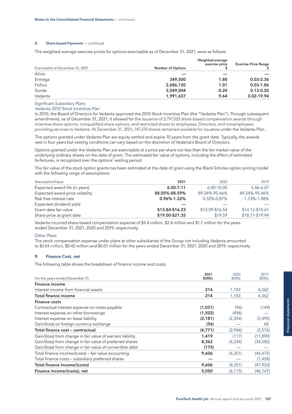 PureTech Health plc Annual report and accounts 2021 187 Fi na nc ia l s ta te m en ts TheweightedaverageexercisepricesforoptionsexercisableasofDecember31,2021,wereasfollows: ExercisableatDecember31,2021 Number of Options Weighted-average exercise price $ Exercise Price Range $ Alivio — — — Entrega 349,500 1.88 0.03-2.36 Follica 2,686,120 1.01 0.03-1.86 Sonde 2,049,004 0.20 0.13-0.20 Vedanta 1,991,637 9.64 0.02-19.94 SignificantSubsidiaryPlans Vedanta 2010 Stock Incentive Plan In2010,theBoardofDirectorsforVedantaapprovedthe2010StockIncentivePlan(the“VedantaPlan”).Throughsubsequent amendments,asofDecember31,2021,itallowedforthe issuance of 2,797,055 share-based compensation awards through incentive share options, nonqualified share options, and restricted shares to employees, Directors, and nonemployees providing services to Vedanta. At December 31, 2021, 747,270 shares remained available for issuanceundertheVedantaPlan. TheoptionsgrantedunderVedantaPlanareequitysettledandexpire10yearsfromthegrantdate.Typically,theawards vest infouryearsbutvestingconditionscanvarybasedonthediscretionofVedanta’sBoardofDirectors. OptionsgrantedundertheVedantaPlanareexercisableatapricepersharenotlessthanthefairmarketvalueofthe underlyingordinarysharesonthedateofgrant.Theestimatedfairvalueofoptions,includingtheeffectofestimated forfeitures,isrecognizedovertheoptions’vestingperiod. ThefairvalueofthestockoptiongrantshasbeenestimatedatthedateofgrantusingtheBlack-Scholesoptionpricingmodel withthefollowingrangeofassumptions: Assumption/Input 2021 2020 2019 Expectedawardlife(inyears) 6.00-7.11 6.00-10.00 5.86-6.07 Expectedawardpricevolatility 88.05%-88.59% 89.24%-95.46% 89.24%-95.46% Riskfreeinterestrate 0.96%-1.32% 0.32%-0.87% 1.73%-1.88% Expecteddividendyield — — — Grantdatefairvalue $13.84-$16.23 $13.09-$16.54 $14.12-$15.61 Sharepriceatgrantdate $19.00-$21.35 $19.59 $18.71-$19.94 Vedantaincurredshare-basedcompensationexpenseof$5.4million,$2.4millionand$1.7 millionfortheyears ended December31,2021,2020and2019,respectively. OtherPlans ThestockcompensationexpenseunderplansatothersubsidiariesoftheGroupnotincludingVedantaamounted to $0.84 million,$0.42millionand$0.01millionfortheyearsended December31,2021,2020and2019,respectively. 8. Share-based Payments —continued Notes to the Consolidated Financial Statements — continued 9. Finance Cost, net Thefollowingtableshowsthebreakdownoffinanceincomeandcosts: 2021 $000s 2020 $000s 2019 $000sFortheyearsended December31, Finance income Interestincomefromfinancialassets 214 1,183 4,362 Total finance income 214 1,183 4,362 Finance costs Contractualinterestexpenseonnotespayable (1,031) (96) (149) Interestexpenseonotherborrowings (1,502) (496) — Interestexpenseonleaseliability (2,181) (2,354) (2,495) Gain/(loss)onforeigncurrencyexchange (56) — 68 Total finance cost – contractual (4,771) (2,946) (2,576) Gain/(loss)fromchangeinfairvalueofwarrantliability 1,419 (117) (11,890) Gain/(loss)fromchangeinfairvalueofpreferredshares 8,362 (4,234) (34,585) Gain/(loss)fromchangeinfairvalueofconvertibledebt (175) — — Totalfinanceincome/(costs)–fairvalueaccounting 9,606 (4,351) (46,475) Totalfinancecosts–subsidiarypreferredshares — — (1,458) Total finance income/(costs) 9,606 (4,351) (47,933) Finance income/(costs), net 5,050 (6,115) (46,147)