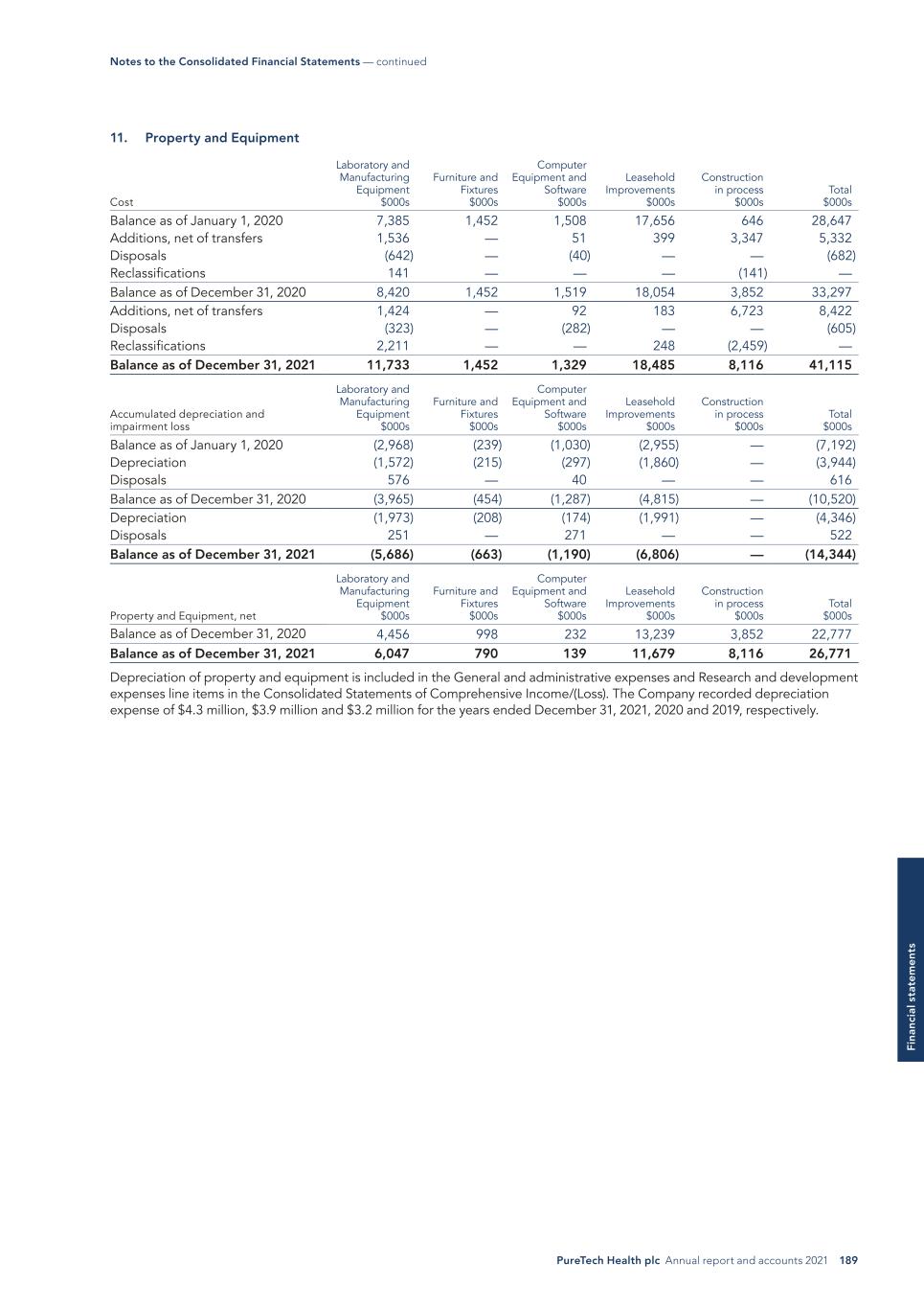 PureTech Health plc Annual report and accounts 2021 189 Fi na nc ia l s ta te m en ts 11. Property and Equipment Cost Laboratoryand Manufacturing Equipment $000s Furniture and Fixtures $000s Computer Equipmentand Software $000s Leasehold Improvements $000s Construction in process $000s Total $000s BalanceasofJanuary1,2020 7,385 1,452 1,508 17,656 646 28,647 Additions,netoftransfers 1,536 — 51 399 3,347 5,332 Disposals (642) — (40) — — (682) Reclassifications 141 — — — (141) — BalanceasofDecember31,2020 8,420 1,452 1,519 18,054 3,852 33,297 Additions,netoftransfers 1,424 — 92 183 6,723 8,422 Disposals (323) — (282) — — (605) Reclassifications 2,211 — — 248 (2,459) — Balance as of December 31, 2021 11,733 1,452 1,329 18,485 8,116 41,115 Accumulateddepreciationand impairment loss Laboratoryand Manufacturing Equipment $000s Furniture and Fixtures $000s Computer Equipmentand Software $000s Leasehold Improvements $000s Construction in process $000s Total $000s BalanceasofJanuary1,2020 (2,968) (239) (1,030) (2,955) — (7,192) Depreciation (1,572) (215) (297) (1,860) — (3,944) Disposals 576 — 40 — — 616 BalanceasofDecember31,2020 (3,965) (454) (1,287) (4,815) — (10,520) Depreciation (1,973) (208) (174) (1,991) — (4,346) Disposals 251 — 271 — — 522 Balance as of December 31, 2021 (5,686) (663) (1,190) (6,806) — (14,344) PropertyandEquipment,net Laboratoryand Manufacturing Equipment $000s Furniture and Fixtures $000s Computer Equipmentand Software $000s Leasehold Improvements $000s Construction in process $000s Total $000s BalanceasofDecember31,2020 4,456 998 232 13,239 3,852 22,777 Balance as of December 31, 2021 6,047 790 139 11,679 8,116 26,771 DepreciationofpropertyandequipmentisincludedintheGeneralandadministrativeexpensesandResearchanddevelopment expenseslineitemsintheConsolidatedStatementsofComprehensiveIncome/(Loss).TheCompanyrecordeddepreciation expenseof$4.3million,$3.9millionand$3.2millionfortheyearsended December31,2021,2020and2019,respectively. Notes to the Consolidated Financial Statements — continued