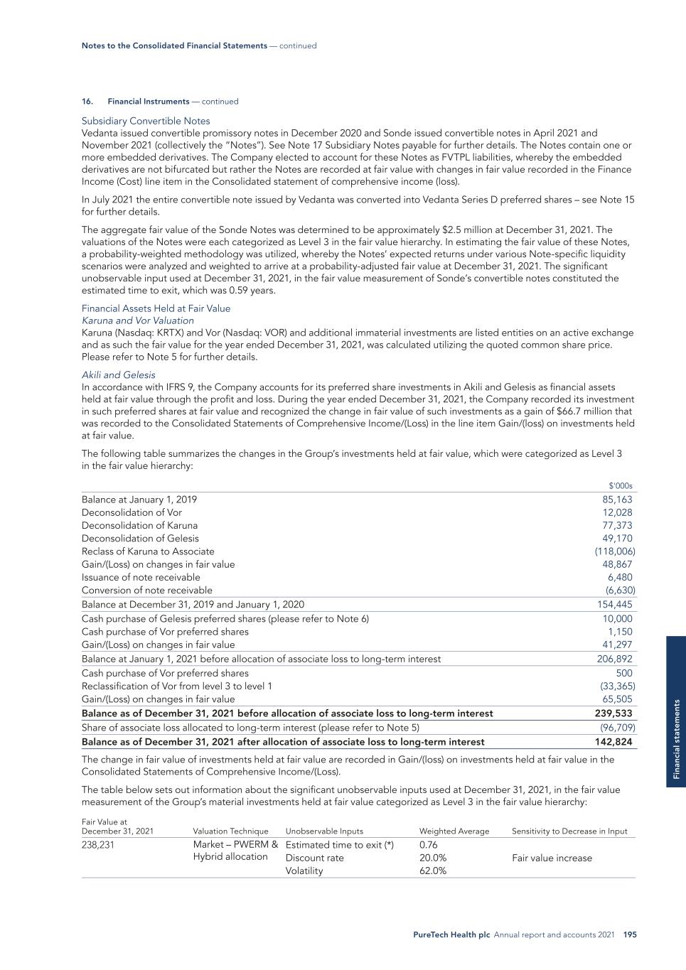 PureTech Health plc Annual report and accounts 2021 195 Fi na nc ia l s ta te m en ts SubsidiaryConvertibleNotes VedantaissuedconvertiblepromissorynotesinDecember2020andSondeissuedconvertiblenotesinApril2021and November2021(collectivelythe“Notes”).SeeNote17SubsidiaryNotespayableforfurtherdetails.TheNotescontainoneor moreembeddedderivatives.TheCompanyelectedtoaccountfortheseNotesasFVTPLliabilities,wherebytheembedded derivativesarenotbifurcatedbutrathertheNotesarerecordedatfairvaluewithchangesinfairvaluerecordedintheFinance Income(Cost)lineitemintheConsolidatedstatementofcomprehensiveincome(loss). InJuly2021theentireconvertiblenoteissuedbyVedantawasconvertedintoVedantaSeriesDpreferredshares–seeNote15 forfurtherdetails. TheaggregatefairvalueoftheSondeNoteswasdeterminedtobeapproximately$2.5 millionatDecember31,2021.The valuationsoftheNoteswereeachcategorizedasLevel3inthefairvaluehierarchy.InestimatingthefairvalueoftheseNotes, aprobability-weightedmethodologywasutilized,wherebytheNotes’expectedreturnsundervariousNote-specificliquidity scenarioswereanalyzedandweightedtoarriveataprobability-adjustedfairvalueatDecember31,2021.Thesignificant unobservableinputusedatDecember31,2021,inthefairvaluemeasurementofSonde’sconvertiblenotesconstitutedthe estimatedtimetoexit,whichwas0.59years. FinancialAssetsHeldatFairValue Karuna and Vor Valuation Karuna(Nasdaq:KRTX)andVor(Nasdaq:VOR)andadditionalimmaterialinvestmentsarelistedentitiesonanactiveexchange andassuchthefairvaluefortheyearended December31,2021,wascalculatedutilizingthequotedcommonshareprice. PleaserefertoNote5forfurtherdetails. Akili and Gelesis InaccordancewithIFRS9,theCompanyaccountsforitspreferredshareinvestmentsinAkiliandGelesisasfinancialassets heldatfairvaluethroughtheprofitandloss.Duringtheyearended December31,2021,theCompanyrecordeditsinvestment insuchpreferredsharesatfairvalueandrecognizedthechangeinfairvalueofsuchinvestmentsasagainof$66.7 millionthat wasrecordedtotheConsolidatedStatementsofComprehensiveIncome/(Loss)inthelineitemGain/(loss)oninvestmentsheld atfairvalue. ThefollowingtablesummarizesthechangesintheGroup’sinvestmentsheldatfairvalue,whichwerecategorizedasLevel3 in thefairvaluehierarchy: $'000s BalanceatJanuary1,2019 85,163 DeconsolidationofVor 12,028 DeconsolidationofKaruna 77,373 DeconsolidationofGelesis 49,170 ReclassofKarunatoAssociate (118,006) Gain/(Loss)onchangesinfairvalue 48,867 Issuanceofnotereceivable 6,480 Conversionofnotereceivable (6,630) BalanceatDecember31,2019andJanuary1,2020 154,445 CashpurchaseofGelesispreferredshares(pleaserefertoNote6) 10,000 CashpurchaseofVorpreferredshares 1,150 Gain/(Loss)onchangesinfairvalue 41,297 BalanceatJanuary1,2021beforeallocationofassociatelosstolong-terminterest 206,892 CashpurchaseofVorpreferredshares 500 ReclassificationofVorfromlevel3tolevel1 (33,365) Gain/(Loss)onchangesinfairvalue 65,505 Balance as of December 31, 2021 before allocation of associate loss to long-term interest 239,533 Shareofassociatelossallocatedtolong-terminterest(pleaserefertoNote5) (96,709) Balance as of December 31, 2021 after allocation of associate loss to long-term interest 142,824 ThechangeinfairvalueofinvestmentsheldatfairvaluearerecordedinGain/(loss)oninvestmentsheldatfairvalueinthe ConsolidatedStatementsofComprehensiveIncome/(Loss). ThetablebelowsetsoutinformationaboutthesignificantunobservableinputsusedatDecember31,2021,inthefairvalue measurementoftheGroup’smaterialinvestmentsheldatfairvaluecategorizedasLevel3inthefairvaluehierarchy: FairValueat December 31, 2021 ValuationTechnique UnobservableInputs Weighted Average SensitivitytoDecreaseinInput 238,231 Market–PWERM& Hybridallocation Estimatedtimetoexit(*) 0.76 FairvalueincreaseDiscountrate 20.0% Volatility 62.0% 16. Financial Instruments —continued Notes to the Consolidated Financial Statements — continued