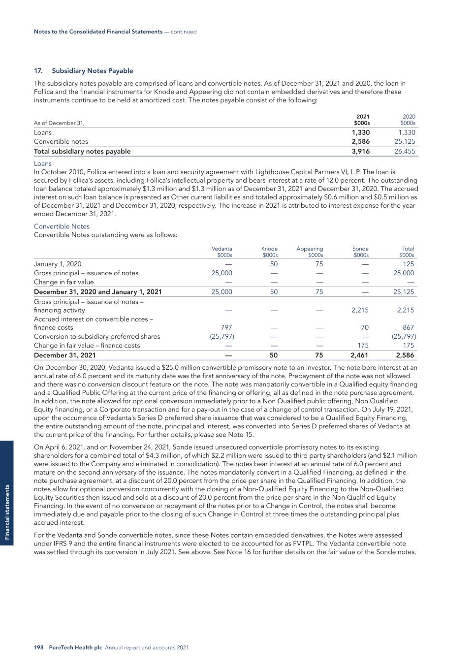 198 PureTech Health plc Annual report and accounts 2021 Fi na nc ia l s ta te m en ts 17. Subsidiary Notes Payable Thesubsidiarynotespayablearecomprisedofloansandconvertiblenotes.AsofDecember31,2021and2020,theloanin FollicaandthefinancialinstrumentsforKnodeandAppeeringdidnotcontainembeddedderivativesandthereforethese instrumentscontinuetobeheldatamortizedcost.Thenotespayableconsistofthefollowing: 2021 $000s 2020 $000sAsofDecember31, Loans 1,330 1,330 Convertiblenotes 2,586 25,125 Total subsidiary notes payable 3,916 26,455 Loans InOctober2010,FollicaenteredintoaloanandsecurityagreementwithLighthouseCapitalPartnersVI,L.P.Theloanis securedbyFollica’sassets,includingFollica’sintellectualpropertyandbearsinterestatarateof12.0percent.Theoutstanding loanbalancetotaledapproximately$1.3millionand$1.3millionasofDecember31,2021andDecember31,2020.Theaccrued interestonsuchloanbalanceispresentedasOthercurrentliabilitiesandtotaledapproximately$0.6millionand$0.5millionas ofDecember31,2021andDecember31,2020,respectively.Theincreasein2021isattributedtointerestexpensefortheyear endedDecember31,2021. ConvertibleNotes ConvertibleNotesoutstandingwereasfollows: Vedanta $000s Knode $000s Appeering $000s Sonde $000s Total $000s January1,2020 — 50 75 — 125 Grossprincipal–issuanceofnotes 25,000 — — — 25,000 Changeinfairvalue — — — — — December 31, 2020 and January 1, 2021 25,000 50 75 — 25,125 Grossprincipal–issuanceofnotes– financing activity — — — 2,215 2,215 Accruedinterestonconvertiblenotes– finance costs 797 — — 70 867 Conversiontosubsidiarypreferredshares (25,797) — — — (25,797) Changeinfairvalue–financecosts — — — 175 175 December 31, 2021 — 50 75 2,461 2,586 OnDecember30,2020,Vedantaissueda$25.0 millionconvertiblepromissorynotetoaninvestor.Thenoteboreinterestatan annualrateof6.0percentanditsmaturitydatewasthefirstanniversaryofthenote.Prepaymentofthenotewasnotallowed andtherewasnoconversiondiscountfeatureonthenote.ThenotewasmandatorilyconvertibleinaQualifiedequityfinancing andaQualifiedPublicOfferingatthecurrentpriceofthefinancingoroffering,allasdefinedinthenotepurchaseagreement. Inaddition,thenoteallowedforoptionalconversionimmediatelypriortoaNonQualifiedpublicoffering,NonQualified Equityfinancing,oraCorporatetransactionandforapay-outinthecaseofachangeofcontroltransaction.OnJuly19,2021, upontheoccurrenceofVedanta'sSeriesDpreferredshareissuancethatwasconsideredtobeaQualifiedEquityFinancing, theentireoutstandingamountofthenote,principalandinterest,wasconvertedintoSeriesDpreferredsharesofVedantaat thecurrentpriceofthefinancing.Forfurtherdetails,pleaseseeNote15. OnApril6,2021, andonNovember24,2021, Sondeissuedunsecuredconvertiblepromissorynotestoitsexisting shareholdersforacombinedtotalof$4.3million,ofwhich$2.2millionwereissuedtothirdpartyshareholders(and$2.1million wereissuedtotheCompanyandeliminatedinconsolidation).Thenotesbearinterestatanannualrateof6.0percentand matureonthesecondanniversaryoftheissuance.ThenotesmandatorilyconvertinaQualifiedFinancing,asdefinedinthe notepurchaseagreement,atadiscountof20.0percentfromthepricepershareintheQualifiedFinancing.Inaddition,the notesallowforoptionalconversionconcurrentlywiththeclosingofaNon-QualifiedEquityFinancingtotheNon-Qualified EquitySecuritiesthenissuedandsoldatadiscountof20.0percentfromthepricepershareintheNonQualifiedEquity Financing.IntheeventofnoconversionorrepaymentofthenotespriortoaChangeinControl,thenotesshallbecome immediatelydueandpayablepriortotheclosingofsuchChangeinControlatthreetimestheoutstandingprincipalplus accruedinterest. FortheVedantaandSondeconvertiblenotes,sincetheseNotescontainembeddedderivatives,theNoteswereassessed underIFRS9andtheentirefinancialinstrumentswereelectedtobeaccountedforasFVTPL.TheVedantaconvertiblenote wassettledthroughitsconversioninJuly2021.Seeabove.SeeNote16forfurtherdetailsonthefairvalueoftheSondenotes. Notes to the Consolidated Financial Statements — continued