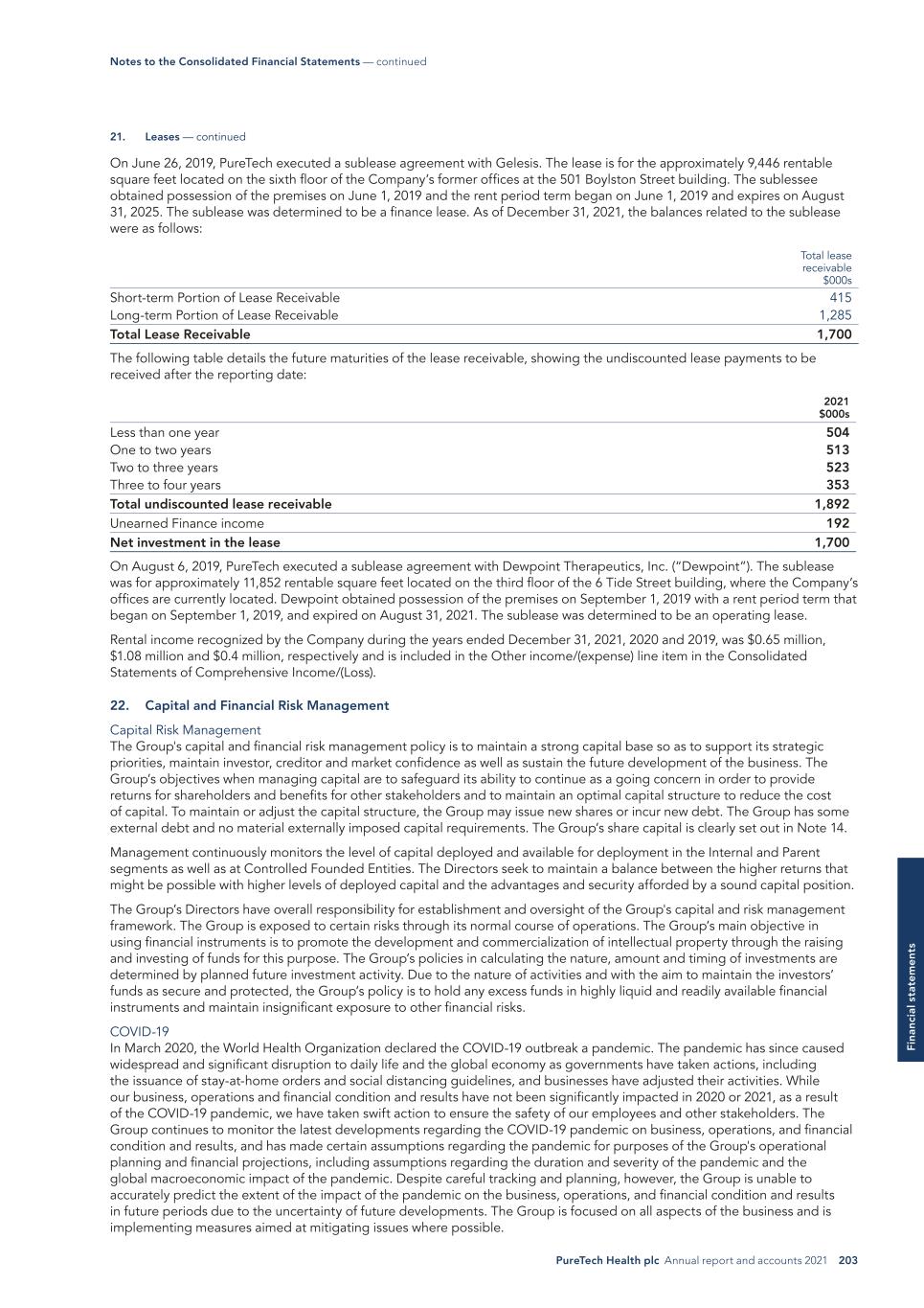 PureTech Health plc Annual report and accounts 2021 203 Fi na nc ia l s ta te m en ts 21. Leases —continued Notes to the Consolidated Financial Statements — continued 22. Capital and Financial Risk Management CapitalRiskManagement TheGroup'scapitalandfinancialriskmanagementpolicyistomaintainastrongcapitalbasesoastosupportitsstrategic priorities,maintaininvestor,creditorandmarketconfidenceaswellassustainthefuturedevelopmentofthebusiness.The Group’sobjectiveswhenmanagingcapitalaretosafeguarditsabilitytocontinueasagoingconcerninordertoprovide returnsforshareholdersandbenefitsforotherstakeholdersandtomaintainanoptimalcapitalstructuretoreducethecost of capital.Tomaintainoradjustthecapitalstructure,theGroupmayissuenewsharesorincurnewdebt.TheGrouphassome externaldebtandnomaterialexternallyimposedcapitalrequirements.TheGroup’ssharecapitalisclearlysetoutinNote14. ManagementcontinuouslymonitorsthelevelofcapitaldeployedandavailablefordeploymentintheInternalandParent segmentsaswellasatControlledFoundedEntities.TheDirectorsseektomaintainabalancebetweenthehigherreturnsthat mightbepossiblewithhigherlevelsofdeployedcapitalandtheadvantagesandsecurityaffordedbyasoundcapitalposition. TheGroup’sDirectorshaveoverallresponsibilityforestablishmentandoversightoftheGroup'scapitalandriskmanagement framework.TheGroupisexposedtocertainrisksthroughitsnormalcourseofoperations.TheGroup’smainobjectivein usingfinancialinstrumentsistopromotethedevelopmentandcommercializationofintellectualpropertythroughtheraising andinvestingoffundsforthispurpose.TheGroup’spoliciesincalculatingthenature,amountandtimingofinvestmentsare determinedbyplannedfutureinvestmentactivity.Duetothenatureofactivitiesandwiththeaimtomaintaintheinvestors’ fundsassecureandprotected,theGroup’spolicyistoholdanyexcessfundsinhighlyliquidandreadilyavailablefinancial instrumentsandmaintaininsignificantexposuretootherfinancialrisks. COVID-19 InMarch2020,theWorldHealthOrganizationdeclaredtheCOVID-19outbreakapandemic.Thepandemichassincecaused widespreadandsignificantdisruptiontodailylifeandtheglobaleconomyasgovernmentshavetakenactions,including theissuanceofstay-at-homeordersandsocialdistancingguidelines,andbusinesseshaveadjustedtheiractivities.While ourbusiness,operationsandfinancialconditionandresultshavenotbeensignificantlyimpactedin2020or2021,asaresult oftheCOVID-19pandemic,wehavetakenswiftactiontoensurethesafetyofouremployeesandotherstakeholders.The GroupcontinuestomonitorthelatestdevelopmentsregardingtheCOVID-19pandemiconbusiness,operations,andfinancial conditionandresults,andhasmadecertainassumptionsregardingthepandemicforpurposesoftheGroup'soperational planningandfinancialprojections,includingassumptionsregardingthedurationandseverityofthepandemicandthe globalmacroeconomicimpactofthepandemic.Despitecarefultrackingandplanning,however,theGroupisunableto accuratelypredicttheextentoftheimpactofthepandemiconthebusiness,operations,andfinancialconditionandresults infutureperiodsduetotheuncertaintyoffuturedevelopments.TheGroupisfocusedonallaspectsofthebusinessandis implementingmeasuresaimedatmitigatingissueswherepossible. OnJune26,2019,PureTechexecutedasubleaseagreementwithGelesis.Theleaseisfortheapproximately9,446rentable squarefeetlocatedonthesixthflooroftheCompany’sformerofficesatthe501BoylstonStreetbuilding.Thesublessee obtainedpossessionofthepremisesonJune1,2019andtherentperiodtermbeganonJune1,2019andexpiresonAugust 31,2025.Thesubleasewasdeterminedtobeafinancelease.AsofDecember31,2021,thebalancesrelatedtothesublease wereasfollows: Totallease receivable $000s Short-termPortionofLeaseReceivable 415 Long-termPortionofLeaseReceivable 1,285 Total Lease Receivable 1,700 Thefollowingtabledetailsthefuturematuritiesoftheleasereceivable,showingtheundiscountedleasepaymentstobe receivedafterthereportingdate: 2021 $000s Lessthanoneyear 504 Onetotwoyears 513 Twotothreeyears 523 Threetofouryears 353 Total undiscounted lease receivable 1,892 UnearnedFinanceincome 192 Net investment in the lease 1,700 OnAugust6,2019,PureTechexecutedasubleaseagreementwithDewpointTherapeutics,Inc.(“Dewpoint”).Thesublease wasforapproximately11,852rentablesquarefeetlocatedonthethirdfloorofthe6TideStreetbuilding,wheretheCompany’s officesarecurrentlylocated.DewpointobtainedpossessionofthepremisesonSeptember1,2019witharentperiodtermthat beganonSeptember1,2019,andexpiredonAugust31,2021.Thesubleasewasdeterminedtobeanoperatinglease. RentalincomerecognizedbytheCompanyduringtheyearsended December31,2021,2020and2019,was$0.65million, $1.08millionand$0.4million,respectivelyandisincludedintheOtherincome/(expense)lineitemintheConsolidated StatementsofComprehensiveIncome/(Loss).