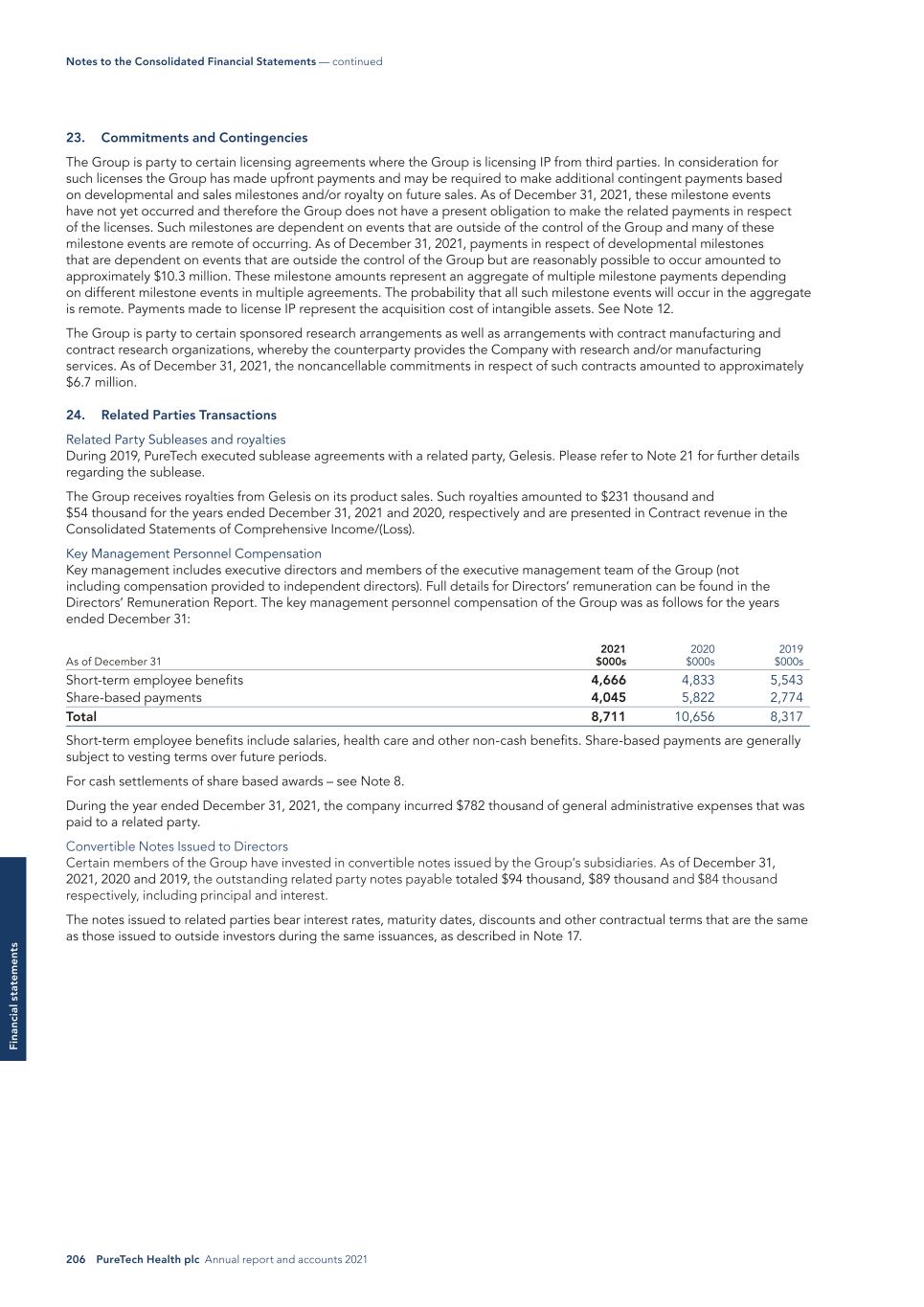 206 PureTech Health plc Annual report and accounts 2021 Fi na nc ia l s ta te m en ts 24. Related Parties Transactions RelatedPartySubleasesandroyalties During2019,PureTechexecutedsubleaseagreementswitharelatedparty,Gelesis.PleaserefertoNote21forfurtherdetails regardingthesublease. TheGroupreceivesroyaltiesfromGelesisonitsproductsales.Suchroyaltiesamountedto$231 thousandand $54 thousand fortheyearsendedDecember31,2021and2020,respectivelyandarepresentedinContractrevenueinthe ConsolidatedStatementsofComprehensiveIncome/(Loss). KeyManagementPersonnelCompensation KeymanagementincludesexecutivedirectorsandmembersoftheexecutivemanagementteamoftheGroup(not includingcompensationprovidedtoindependentdirectors).FulldetailsforDirectors’remunerationcanbefoundinthe Directors’RemunerationReport.ThekeymanagementpersonnelcompensationoftheGroupwasasfollowsfortheyears ended December31: 2021 $000s 2020 $000s 2019 $000sAsofDecember31 Short-termemployeebenefits 4,666 4,833 5,543 Share-basedpayments 4,045 5,822 2,774 Total 8,711 10,656 8,317 Short-termemployeebenefitsincludesalaries,healthcareandothernon-cashbenefits.Share-basedpaymentsaregenerally subjecttovestingtermsoverfutureperiods. Forcashsettlementsofsharebasedawards–seeNote8. DuringtheyearendedDecember31,2021,thecompanyincurred $782 thousandofgeneraladministrativeexpensesthatwas paidtoarelatedparty. Convertible Notes Issued to Directors Certain members of the Group have invested in convertible notes issued by the Group’s subsidiaries. As of December31, 2021,2020and2019, the outstanding related party notes payabletotaled$94 thousand,$89 thousand and $84 thousand respectively, including principal and interest. Thenotesissuedtorelatedpartiesbearinterestrates,maturitydates,discountsandothercontractualtermsthatarethesame asthoseissuedtooutsideinvestorsduringthesameissuances,asdescribedinNote17. Notes to the Consolidated Financial Statements — continued 23. Commitments and Contingencies TheGroupispartytocertainlicensingagreementswheretheGroupislicensingIPfromthirdparties.Inconsiderationfor suchlicensestheGrouphasmadeupfrontpaymentsandmayberequiredtomakeadditionalcontingentpaymentsbased ondevelopmentalandsalesmilestonesand/orroyaltyonfuturesales.AsofDecember31,2021,thesemilestoneevents havenotyetoccurredandthereforetheGroupdoesnothaveapresentobligationtomaketherelatedpaymentsinrespect ofthelicenses.SuchmilestonesaredependentoneventsthatareoutsideofthecontroloftheGroupandmanyofthese milestoneeventsareremoteofoccurring.AsofDecember31,2021,paymentsinrespectofdevelopmentalmilestones thataredependentoneventsthatareoutsidethecontroloftheGroupbutarereasonablypossibletooccuramountedto approximately $10.3 million.Thesemilestoneamountsrepresentanaggregateofmultiplemilestonepaymentsdepending on differentmilestoneeventsinmultipleagreements.Theprobabilitythatallsuchmilestoneeventswilloccurintheaggregate isremote.PaymentsmadetolicenseIPrepresenttheacquisitioncostofintangibleassets.SeeNote12. TheGroupispartytocertainsponsoredresearcharrangementsaswellasarrangementswithcontractmanufacturingand contractresearchorganizations,wherebythecounterpartyprovidestheCompanywithresearchand/ormanufacturing services.AsofDecember31,2021,thenoncancellablecommitmentsinrespectofsuchcontractsamountedtoapproximately $6.7 million.