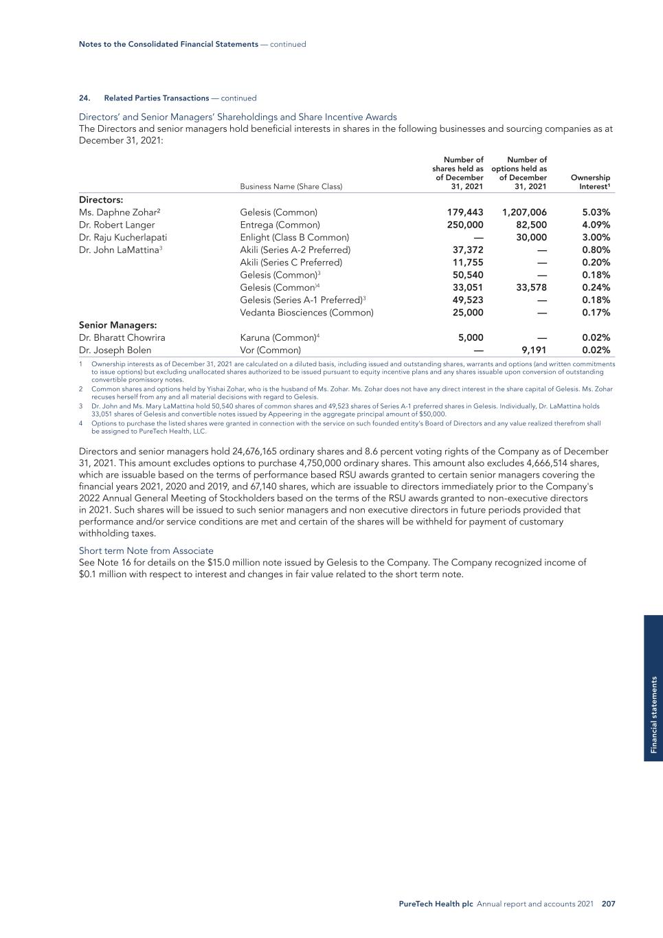 PureTech Health plc Annual report and accounts 2021 207 Fi na nc ia l s ta te m en ts Notes to the Consolidated Financial Statements — continued Directors’andSeniorManagers’ShareholdingsandShareIncentiveAwards TheDirectorsandseniormanagersholdbeneficialinterestsinsharesinthefollowingbusinessesandsourcingcompaniesasat December31,2021: BusinessName(ShareClass) Number of shares held as of December 31, 2021 Number of options held as of December 31, 2021 Ownership Interest¹ Directors: Ms.DaphneZohar² Gelesis(Common) 179,443 1,207,006 5.03% Dr.RobertLanger Entrega(Common) 250,000 82,500 4.09% Dr.RajuKucherlapati Enlight(ClassBCommon) — 30,000 3.00% Dr.JohnLaMattina3 Akili(SeriesA-2Preferred) 37,372 — 0.80% Akili(SeriesCPreferred) 11,755 — 0.20% Gelesis(Common)3 50,540 — 0.18% Gelesis(Common)4 33,051 33,578 0.24% Gelesis(SeriesA-1Preferred)3 49,523 — 0.18% VedantaBiosciences(Common) 25,000 — 0.17% Senior Managers: Dr.BharattChowrira Karuna(Common)4 5,000 — 0.02% Dr.JosephBolen Vor(Common) — 9,191 0.02% 1 OwnershipinterestsasofDecember31,2021arecalculatedonadilutedbasis,includingissuedandoutstandingshares,warrantsandoptions(andwrittencommitments toissueoptions)butexcludingunallocatedsharesauthorizedtobeissuedpursuanttoequityincentiveplansandanysharesissuableuponconversionofoutstanding convertiblepromissorynotes. 2 CommonsharesandoptionsheldbyYishaiZohar,whoisthehusbandofMs.Zohar.Ms.ZohardoesnothaveanydirectinterestinthesharecapitalofGelesis.Ms.Zohar recusesherselffromanyandallmaterialdecisionswithregardtoGelesis. 3 Dr.JohnandMs.MaryLaMattinahold50,540sharesofcommonsharesand49,523sharesofSeriesA-1preferredsharesinGelesis.Individually,Dr.LaMattinaholds 33,051sharesofGelesisandconvertiblenotesissuedbyAppeeringintheaggregateprincipalamountof$50,000. 4 Optionstopurchasethelistedsharesweregrantedinconnectionwiththeserviceonsuchfoundedentity’sBoardofDirectorsandanyvaluerealizedtherefromshall be assignedtoPureTechHealth,LLC. Directorsandseniormanagershold 24,676,165ordinarysharesand8.6percentvotingrightsoftheCompanyasofDecember 31,2021.Thisamountexcludesoptionstopurchase4,750,000ordinaryshares.Thisamountalsoexcludes4,666,514shares, whichareissuablebasedonthetermsofperformancebasedRSUawardsgrantedtocertainseniormanagerscoveringthe financialyears2021,2020and2019,and 67,140 shares,whichareissuabletodirectorsimmediatelypriortotheCompany's 2022AnnualGeneralMeetingofStockholdersbasedonthetermsoftheRSUawardsgrantedtonon-executivedirectors in2021.Suchshareswillbeissuedtosuchseniormanagersandnonexecutivedirectorsinfutureperiodsprovidedthat performanceand/orserviceconditionsaremetandcertainoftheshareswillbewithheldforpaymentofcustomary withholding taxes. ShorttermNotefromAssociate SeeNote16fordetailsonthe$15.0 millionnoteissuedbyGelesistotheCompany.TheCompanyrecognizedincomeof $0.1 millionwithrespecttointerestandchangesinfairvaluerelatedtotheshorttermnote. 24. Related Parties Transactions —continued
