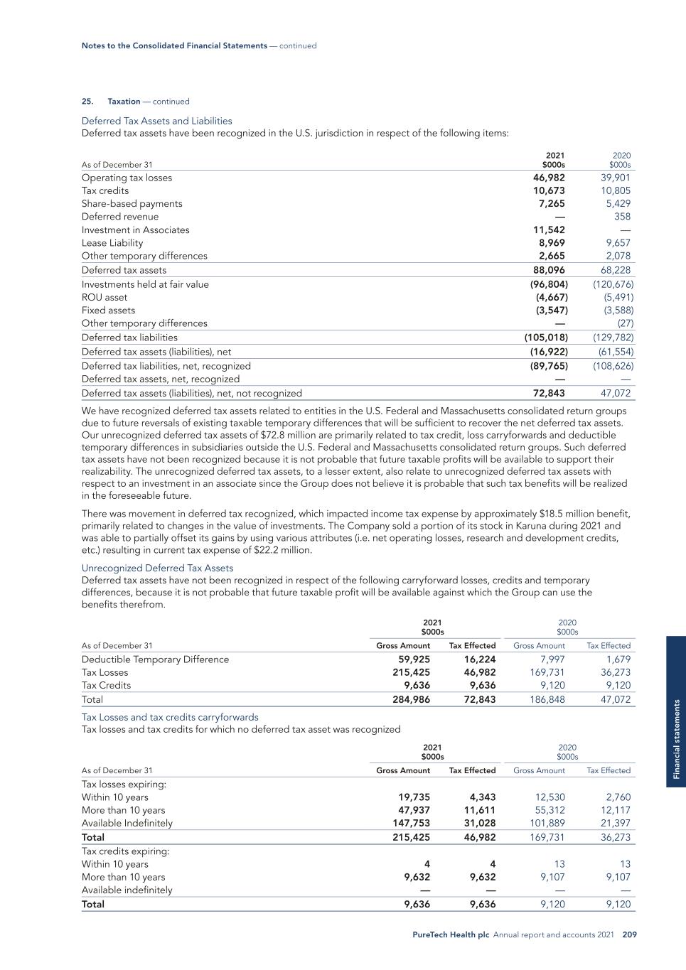 PureTech Health plc Annual report and accounts 2021 209 Fi na nc ia l s ta te m en ts DeferredTaxAssetsandLiabilities DeferredtaxassetshavebeenrecognizedintheU.S.jurisdictioninrespectofthefollowingitems: 2021 $000s 2020 $000sAsofDecember31 Operatingtaxlosses 46,982 39,901 Taxcredits 10,673 10,805 Share-basedpayments 7,265 5,429 Deferredrevenue — 358 InvestmentinAssociates 11,542 — LeaseLiability 8,969 9,657 Othertemporarydifferences 2,665 2,078 Deferredtaxassets 88,096 68,228 Investmentsheldatfairvalue (96,804) (120,676) ROUasset (4,667) (5,491) Fixedassets (3,547) (3,588) Othertemporarydifferences — (27) Deferredtaxliabilities (105,018) (129,782) Deferredtaxassets(liabilities),net (16,922) (61,554) Deferredtaxliabilities,net,recognized (89,765) (108,626) Deferredtaxassets,net,recognized — — Deferredtaxassets(liabilities),net,notrecognized 72,843 47,072 WehaverecognizeddeferredtaxassetsrelatedtoentitiesintheU.S.FederalandMassachusettsconsolidatedreturngroups duetofuturereversalsofexistingtaxabletemporarydifferencesthatwillbesufficienttorecoverthenetdeferredtaxassets. Ourunrecognizeddeferredtaxassetsof$72.8millionareprimarilyrelatedtotaxcredit,losscarryforwardsanddeductible temporarydifferencesinsubsidiariesoutsidetheU.S.FederalandMassachusettsconsolidatedreturngroups.Suchdeferred taxassetshavenotbeenrecognizedbecauseitisnotprobablethatfuturetaxableprofitswillbeavailabletosupporttheir realizability.Theunrecognizeddeferredtaxassets,toalesserextent,alsorelatetounrecognizeddeferredtaxassetswith respecttoaninvestmentinanassociatesincetheGroupdoesnotbelieveitisprobablethatsuchtaxbenefitswillberealized inthe foreseeablefuture. Therewasmovementindeferredtaxrecognized,whichimpactedincometaxexpensebyapproximately$18.5millionbenefit, primarilyrelatedtochangesinthevalueofinvestments.TheCompanysoldaportionofitsstockinKarunaduring2021and wasabletopartiallyoffsetitsgainsbyusingvariousattributes(i.e.netoperatinglosses,researchanddevelopmentcredits, etc.)resultingincurrenttaxexpenseof $22.2million. UnrecognizedDeferredTaxAssets Deferredtaxassetshavenotbeenrecognizedinrespectofthefollowingcarryforwardlosses,creditsandtemporary differences,becauseitisnotprobablethatfuturetaxableprofitwillbeavailableagainstwhichtheGroupcanusethe benefits therefrom. 2021 $000s 2020 $000s AsofDecember31 Gross Amount Tax Effected GrossAmount TaxEffected DeductibleTemporaryDifference 59,925 16,224 7,997 1,679 TaxLosses 215,425 46,982 169,731 36,273 TaxCredits 9,636 9,636 9,120 9,120 Total 284,986 72,843 186,848 47,072 TaxLossesandtaxcreditscarryforwards Taxlossesandtaxcreditsforwhichnodeferredtaxassetwasrecognized AsofDecember31 2021 $000s 2020 $000s Gross Amount Tax Effected GrossAmount TaxEffected Taxlossesexpiring: Within10years 19,735 4,343 12,530 2,760 Morethan10years 47,937 11,611 55,312 12,117 AvailableIndefinitely 147,753 31,028 101,889 21,397 Total 215,425 46,982 169,731 36,273 Taxcreditsexpiring: Within10years 4 4 13 13 Morethan10years 9,632 9,632 9,107 9,107 Availableindefinitely — — — — Total 9,636 9,636 9,120 9,120 25. Taxation —continued Notes to the Consolidated Financial Statements — continued