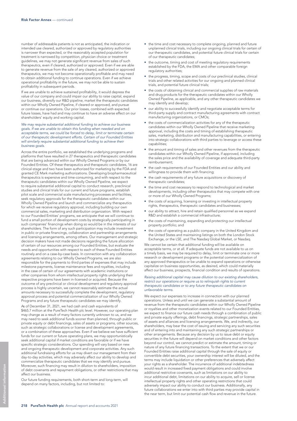 218 PureTech Health plc Annual report and accounts 2021 Risk Factor Annex — continued A d d it io na sl in fo rm at io n • the time and cost necessary to complete ongoing, planned and future unplanned clinical trials, including our ongoing clinical trials for certain of our therapeutic candidates, and potential future clinical trials for certain of our therapeutic candidates; • the outcome, timing and cost of meeting regulatory requirements established by the FDA, the EMA and other comparable foreign regulatory authorities; • the progress, timing, scope and costs of our preclinical studies, clinical trials and other related activities for our ongoing and planned clinical trials, and potential future clinical trials; • the costs of obtaining clinical and commercial supplies of raw materials and drug products for the therapeutic candidates within our Wholly Owned Pipeline, as applicable, and any other therapeutic candidates we may identify and develop; • our ability to successfully identify and negotiate acceptable terms for third-party supply and contract manufacturing agreements with contract manufacturing organizations, or CMOs; • the costs of commercialization activities for any of the therapeutic candidates within our Wholly Owned Pipeline that receive marketing approval, including the costs and timing of establishing therapeutic sales, marketing, distribution and manufacturing capabilities, or entering into strategic collaborations with third parties to leverage or access these capabilities; • the amount and timing of sales and other revenues from the therapeutic candidates within our Wholly Owned Pipeline, if approved, including the sales price and the availability of coverage and adequate third-party reimbursement; • the cash requirements of our Founded Entities and our ability and willingness to provide them with financing; • the cash requirements of any future acquisitions or discovery of therapeutic candidates; • the time and cost necessary to respond to technological and market developments, including other therapeutics that may compete with one or more of our Wholly Owned Programs; • the costs of acquiring, licensing or investing in intellectual property rights, therapeutics, therapeutic candidates and businesses; • our ability to attract, hire and retain qualified personnel as we expand R&D and establish a commercial infrastructure; • the costs of maintaining, expanding and protecting our intellectual property portfolio; and • the costs of operating as a public company in the United Kingdom and the United States and maintaining listings on both the London Stock Exchange, or the LSE, and The Nasdaq Global Market, or Nasdaq. We cannot be certain that additional funding will be available on acceptable terms, or at all. If adequate funds are not available to us on a timely basis, we may be required to delay, limit or terminate one or more research or development programs or the potential commercialization of any approved therapeutics or be unable to expand operations or otherwise capitalize on business opportunities, as desired, which could materially affect our business, prospects, financial condition and results of operations. Raising additional capital may cause dilution to our existing shareholders, restrict our operations or require us to relinquish rights to current therapeutic candidates or to any future therapeutic candidates on unfavorable terms. We expect our expenses to increase in connection with our planned operations. Unless and until we can generate a substantial amount of revenue from the therapeutic candidates within our Wholly Owned Pipeline or royalties and other monetization events related to our Founded Entities, we expect to finance our future cash needs through a combination of public and private equity offerings, debt financings, strategic partnerships, sales of assets and alliances and licensing arrangements. We, and indirectly, our shareholders, may bear the cost of issuing and servicing any such securities and of entering into and maintaining any such strategic partnerships or other arrangements. Because any decision by us to issue debt or equity securities in the future will depend on market conditions and other factors beyond our control, we cannot predict or estimate the amount, timing or nature of any future financing transactions. To the extent that we or our Founded Entities raise additional capital through the sale of equity or convertible debt securities, your ownership interest will be diluted, and the terms may include liquidation or other preferences that adversely affect your rights as a shareholder. The incurrence of additional indebtedness would result in increased fixed payment obligations and could involve additional restrictive covenants, such as limitations on our ability to incur additional debt, limitations on our ability to acquire, sell or license intellectual property rights and other operating restrictions that could adversely impact our ability to conduct our business. Additionally, any future collaborations we enter into with third parties may provide capital in the near term, but limit our potential cash flow and revenue in the future. number of addressable patients is not as anticipated, the indication or intended use cleared, authorized or approved by regulatory authorities is narrower than expected, or the reasonably accepted population for treatment is narrowed by competition, physician choice or treatment guidelines, we may not generate significant revenue from sales of such therapeutics, even if cleared, authorized or approved. Even if we are able to generate revenue from the sale of any cleared, authorized or approved therapeutics, we may not become operationally profitable and may need to obtain additional funding to continue operations. Even if we achieve operational profitability in the future, we may not be able to sustain profitability in subsequent periods. If we are unable to achieve