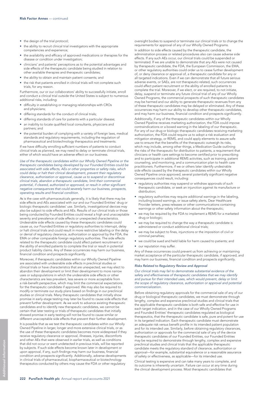 220 PureTech Health plc Annual report and accounts 2021 Risk Factor Annex — continued A d d it io na sl in fo rm at io n therapeutic candidates in our Wholly Owned Pipeline or our Founded Entities’ therapeutic candidates will be successful in clinical trials or receive regulatory approval, authorization or clearance. Further, our Wholly Owned Programs or our Founded Entities’ therapeutic candidates may not receive regulatory clearance, authorization or approval even if we believe they are successful in clinical trials. If we or our Founded Entities do not receive regulatory clearance, authorization or approval for our or their therapeutic candidates, we may not be able to continue operations, which may result in dissolution, out-licensing the technology or pursuing an alternative strategy. Preclinical development is uncertain. Our preclinical programs may experience delays or may never advance to clinical trials, which would adversely affect our ability to obtain regulatory clearance, authorization or approvals or commercialize these programs on a timely basis or at all, which would have an adverse effect on our business. Certain of our Wholly Owned Programs are in the preclinical stage, and their risk of failure is high. Before we can commence clinical trials for a therapeutic candidate, we must complete extensive preclinical testing and studies that support our planned INDs, in the United States, or similar applications in other jurisdictions. We cannot be certain of the timely completion or outcome of our preclinical testing and studies and cannot predict if the FDA or other regulatory authorities will accept our proposed clinical programs or if the outcome of our preclinical testing and studies will ultimately support the further development of our programs. As a result, we cannot be sure that we will be able to submit INDs or similar applications for our preclinical programs on the timelines we expect, if at all, and we cannot be sure that submission of INDs or similar applications will result in the FDA, the EMA or other regulatory authorities allowing clinical trials to begin. Clinical trials of our or our Founded Entities’ therapeutic candidates may be delayed, and certain programs may never advance in the clinic or may be more costly to conduct than we anticipate, any of which can affect our ability to fund our company and would have a material adverse impact on our platform or our business. Clinical testing is expensive, time-consuming, and subject to uncertainty. We cannot guarantee that any of our ongoing and planned clinical trials will be conducted as planned or completed on schedule, if at all. Moreover, even if these trials are initiated or conducted on a timely basis, issues may arise that could result in the suspension or termination of such clinical trials. A failure of one or more clinical trials can occur at any stage of testing, and our clinical trials may not be successful. Events that may prevent successful or timely initiation or completion of clinical trials include: • inability to generate sufficient preclinical, toxicology, or other in vivo or in vitro data to support the initiation or continuation of clinical trials; • delays in confirming target engagement, patient selection or other relevant biomarkers to be utilized in preclinical and clinical therapeutic candidate development; • delays in reaching a consensus with regulatory agencies as to the design or implementation of our clinical studies; • delays in reaching agreement on acceptable terms with prospective contract research organizations, or CROs, and clinical trial sites, the terms of which can be subject to extensive negotiation and may vary significantly among different CROs and clinical trial sites; • delays in identifying, recruiting and training suitable clinical investigators; • delays in obtaining required Institutional Review Board, or IRB, approval at each clinical trial site; • imposition of a temporary or permanent clinical hold by regulatory agencies for a number of reasons, including after review of an IND or amendment, clinical trial application, or CTA, or amendment, investigational device exemption, or IDE, or supplement, or equivalent application or amendment; as a result of a new safety finding that presents unreasonable risk to clinical trial participants; or a negative finding from an inspection of our clinical trial operations or study sites; • developments in trials for other therapeutic candidates with the same targets or related modalities as our or our Founded Entities’ therapeutic candidates conducted by competitors that raise regulatory or safety concerns about risk to patients of the treatment, or if the FDA finds that the investigational protocol or plan is clearly deficient to meet its stated objectives; • difficulties in securing access to materials for the comparator arm of certain of our clinical trials; • delays in identifying, recruiting and enrolling suitable patients to participate in clinical trials, and delays caused by patients withdrawing from clinical trials or failing to return for post-treatment follow-up; • difficulties in finding a sufficient number of trial sites, or trial sites deviating from trial protocol or dropping out of a trial; • difficulty collaborating with patient groups and investigators; therapeutic candidates, obtain or maintain regulatory approval, identify alternate regulatory pathways to market or otherwise achieve profitability. More restrictive statutory regimes, government regulations or negative public opinion would have an adverse effect on our business, financial condition, results of operations and prospects and may delay or impair the development and commercialization of our or our Founded Entities’ therapeutic candidates or demand for any therapeutics we or they may develop. For example, in the United States and the European Union, no therapeutics to date have been approved specifically demonst