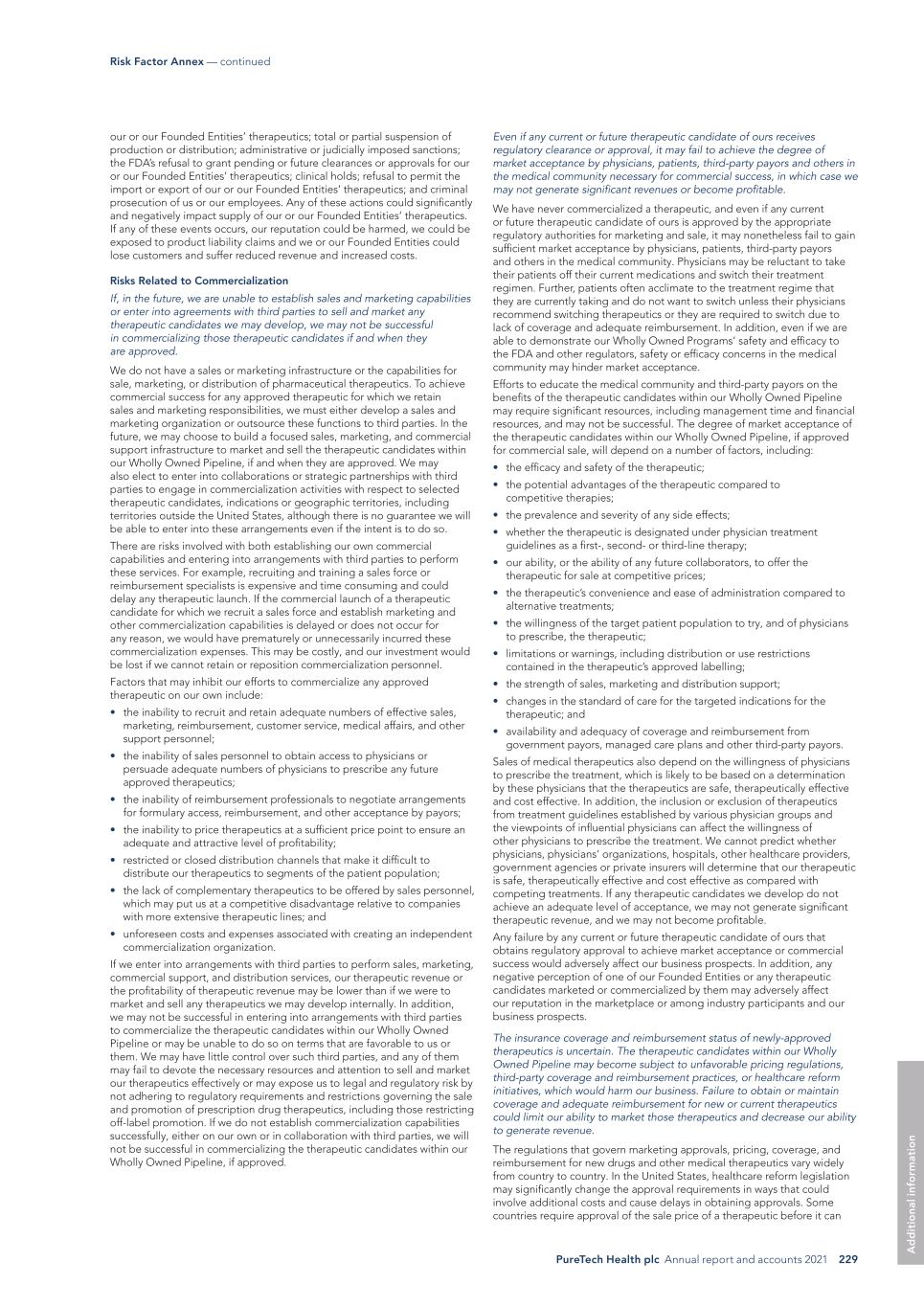 PureTech Health plc Annual report and accounts 2021 229 Risk Factor Annex — continued A d d it io na l i nf o rm at io n Even if any current or future therapeutic candidate of ours receives regulatory clearance or approval, it may fail to achieve the degree of market acceptance by physicians, patients, third‑party payors and others in the medical community necessary for commercial success, in which case we may not generate significant revenues or become profitable. We have never commercialized a therapeutic, and even if any current or future therapeutic candidate of ours is approved by the appropriate regulatory authorities for marketing and sale, it may nonetheless fail to gain sufficient market acceptance by physicians, patients, third-party payors and others in the medical community. Physicians may be reluctant to take their patients off their current medications and switch their treatment regimen. Further, patients often acclimate to the treatment regime that they are currently taking and do not want to switch unless their physicians recommend switching therapeutics or they are required to switch due to lack of coverage and adequate reimbursement. In addition, even if we are able to demonstrate our Wholly Owned Programs’ safety and efficacy to the FDA and other regulators, safety or efficacy concerns in the medical community may hinder market acceptance. Efforts to educate the medical community and third-party payors on the benefits of the therapeutic candidates within our Wholly Owned Pipeline may require significant resources, including management time and financial resources, and may not be successful. The degree of market acceptance of the therapeutic candidates within our Wholly Owned Pipeline, if approved for commercial sale, will depend on a number of factors, including: • the efficacy and safety of the therapeutic; • the potential advantages of the therapeutic compared to competitive therapies; • the prevalence and severity of any side effects; • whether the therapeutic is designated under physician treatment guidelines as a first-, second- or third-line therapy; • our ability, or the ability of any future collaborators, to offer the therapeutic for sale at competitive prices; • the therapeutic’s convenience and ease of administration compared to alternative treatments; • the willingness of the target patient population to try, and of physicians to prescribe, the therapeutic; • limitations or warnings, including distribution or use restrictions contained in the therapeutic’s approved labelling; • the strength of sales, marketing and distribution support; • changes in the standard of care for the targeted indications for the therapeutic; and • availability and adequacy of coverage and reimbursement from government payors, managed care plans and other third-party payors. Sales of medical therapeutics also depend on the willingness of physicians to prescribe the treatment, which is likely to be based on a determination by these physicians that the therapeutics are safe, therapeutically effective and cost effective. In addition, the inclusion or exclusion of therapeutics from treatment guidelines established by various physician groups and the viewpoints of influential physicians can affect the willingness of other physicians to prescribe the treatment. We cannot predict whether physicians, physicians’ organizations, hospitals, other healthcare providers, government agencies or private insurers will determine that our therapeutic is safe, therapeutically effective and cost effective as compared with competing treatments. If any therapeutic candidates we develop do not achieve an adequate level of acceptance, we may not generate significant therapeutic revenue, and we may not become profitable. Any failure by any current or future therapeutic candidate of ours that obtains regulatory approval to achieve market acceptance or commercial success would adversely affect our business prospects. In addition, any negative perception of one of our Founded Entities or any therapeutic candidates marketed or commercialized by them may adversely affect our reputation in the marketplace or among industry participants and our business prospects. The insurance coverage and reimbursement status of newly‑approved therapeutics is uncertain. The therapeutic candidates within our Wholly Owned Pipeline may become subject to unfavorable pricing regulations, third‑party coverage and reimbursement practices, or healthcare reform initiatives, which would harm our business. Failure to obtain or maintain coverage and adequate reimbursement for new or current therapeutics could limit our ability to market those therapeutics and decrease our ability to generate revenue. The regulations that govern marketing approvals, pricing, coverage, and reimbursement for new drugs and other medical therapeutics vary widely from country to country. In the United States, healthcare reform legislation may significantly change the approval requirements in ways that could involve additional costs and cause delays in obtaining approvals. Some countries require approval of the sale price of a therapeutic before it can our or our Founded Entities’ therapeutics; total or partial suspension of production or distribution; administrative or judicially imposed sanctions; the FDA’s refusal to grant pending or future clearances or approvals for our or our Founded Entities’ therapeutics; clinical holds; refusal to permit the import or export of our or our Founded Entities’ therapeutics; and criminal prosecution of us or our employees. Any of these actions could significantly and negatively impact supply of our or our Founded Entities’ therapeutics. If any of these events occurs, our reputation could be harmed, we could be exposed to product liability claims and we or our Founded Entities could lose customers and suffer reduced revenue and increased costs. Risks Related to Commercialization I
