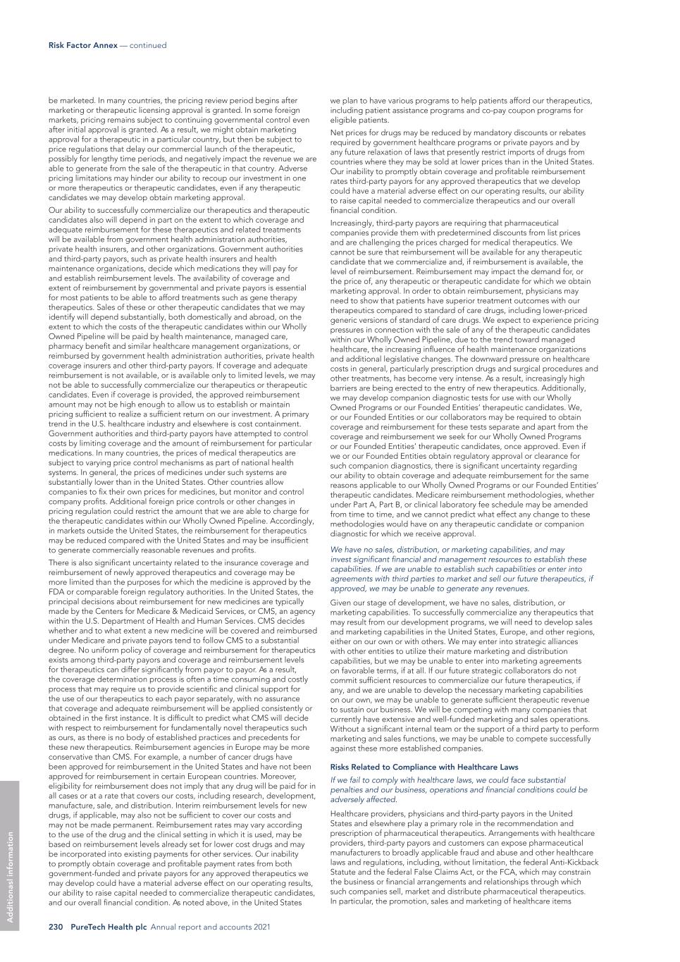 230 PureTech Health plc Annual report and accounts 2021 Risk Factor Annex — continued A d d it io na sl in fo rm at io n we plan to have various programs to help patients afford our therapeutics, including patient assistance programs and co-pay coupon programs for eligible patients. Net prices for drugs may be reduced by mandatory discounts or rebates required by government healthcare programs or private payors and by any future relaxation of laws that presently restrict imports of drugs from countries where they may be sold at lower prices than in the United States. Our inability to promptly obtain coverage and profitable reimbursement rates third-party payors for any approved therapeutics that we develop could have a material adverse effect on our operating results, our ability to raise capital needed to commercialize therapeutics and our overall financial condition. Increasingly, third-party payors are requiring that pharmaceutical companies provide them with predetermined discounts from list prices and are challenging the prices charged for medical therapeutics. We cannot be sure that reimbursement will be available for any therapeutic candidate that we commercialize and, if reimbursement is available, the level of reimbursement. Reimbursement may impact the demand for, or the price of, any therapeutic or therapeutic candidate for which we obtain marketing approval. In order to obtain reimbursement, physicians may need to show that patients have superior treatment outcomes with our therapeutics compared to standard of care drugs, including lower-priced generic versions of standard of care drugs. We expect to experience pricing pressures in connection with the sale of any of the therapeutic candidates within our Wholly Owned Pipeline, due to the trend toward managed healthcare, the increasing influence of health maintenance organizations and additional legislative changes. The downward pressure on healthcare costs in general, particularly prescription drugs and surgical procedures and other treatments, has become very intense. As a result, increasingly high barriers are being erected to the entry of new therapeutics. Additionally, we may develop companion diagnostic tests for use with our Wholly Owned Programs or our Founded Entities’ therapeutic candidates. We, or our Founded Entities or our collaborators may be required to obtain coverage and reimbursement for these tests separate and apart from the coverage and reimbursement we seek for our Wholly Owned Programs or our Founded Entities’ therapeutic candidates, once approved. Even if we or our Founded Entities obtain regulatory approval or clearance for such companion diagnostics, there is significant uncertainty regarding our ability to obtain coverage and adequate reimbursement for the same reasons applicable to our Wholly Owned Programs or our Founded Entities’ therapeutic candidates. Medicare reimbursement methodologies, whether under Part A, Part B, or clinical laboratory fee schedule may be amended from time to time, and we cannot predict what effect any change to these methodologies would have on any therapeutic candidate or companion diagnostic for which we receive approval. We have no sales, distribution, or marketing capabilities, and may invest significant financial and management resources to establish these capabilities. If we are unable to establish such capabilities or enter into agreements with third parties to market and sell our future therapeutics, if approved, we may be unable to generate any revenues. Given our stage of development, we have no sales, distribution, or marketing capabilities. To successfully commercialize any therapeutics that may result from our development programs, we will need to develop sales and marketing capabilities in the United States, Europe, and other regions, either on our own or with others. We may enter into strategic alliances with other entities to utilize their mature marketing and distribution capabilities, but we may be unable to enter into marketing agreements on favorable terms, if at all. If our future strategic collaborators do not commit sufficient resources to commercialize our future therapeutics, if any, and we are unable to develop the necessary marketing capabilities on our own, we may be unable to generate sufficient therapeutic revenue to sustain our business. We will be competing with many companies that currently have extensive and well-funded marketing and sales operations. Without a significant internal team or the support of a third party to perform marketing and sales functions, we may be unable to compete successfully against these more established companies. Risks Related to Compliance with Healthcare Laws If we fail to comply with healthcare laws, we could face substantial penalties and our business, operations and financial conditions could be adversely affected. Healthcare providers, physicians and third-party payors in the United States and elsewhere play a primary role in the recommendation and prescription of pharmaceutical therapeutics. Arrangements with healthcare providers, third-party payors and customers can expose pharmaceutical manufacturers to broadly applicable fraud and abuse and other healthcare laws and regulations, including, without limitation, the federal Anti-Kickback Statute and the federal False Claims Act, or the FCA, which may constrain the business or financial arrangements and relationships through which such companies sell, market and distribute pharmaceutical therapeutics. In particular, the promotion, sales and marketing of healthcare items be marketed. In many countries, the pricing review period begins after marketing or therapeutic licensing approval is granted. In some foreign markets, pricing remains subject to continuing governmental control even after initial approval is granted. As a result, we might obtain marketing approval for a therapeutic in a particular country, but then be subject to price regulations tha