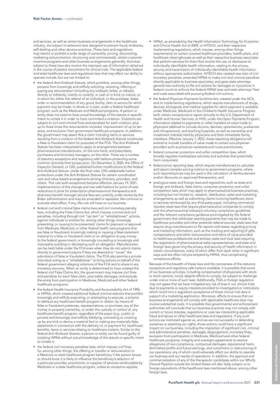 PureTech Health plc Annual report and accounts 2021 231 Risk Factor Annex — continued A d d it io na l i nf o rm at io n • HIPAA, as amended by the Health Information Technology for Economic and Clinical Health Act of 2009, or HITECH, and their respective implementing regulations, which impose, among other things, requirements on certain covered healthcare providers, health plans, and healthcare clearinghouses as well as their respective business associates that perform services for them that involve the use, or disclosure of, individually identifiable health information, relating to the privacy, security and transmission of individually identifiable health information without appropriate authorization. HITECH also created new tiers of civil monetary penalties, amended HIPAA to make civil and criminal penalties directly applicable to business associates, and gave state attorneys general new authority to file civil actions for damages or injunctions in federal courts to enforce the federal HIPAA laws and seek attorneys’ fees and costs associated with pursuing federal civil actions; • the federal Physician Payments Sunshine Act, created under the ACA, and its implementing regulations, which require manufacturers of drugs, devices, biologicals and medical supplies for which payment is available under Medicare, Medicaid or the Children’s Health Insurance Program (with certain exceptions) to report annually to the U.S. Department of Health and Human Services, or HHS, under the Open Payments Program, information related to payments or other transfers of value made to physicians (defined to include doctors, dentists, optometrists, podiatrists and chiropractors), and teaching hospitals, as well as ownership and investment interests held by physicians and their immediate family members. Effective January 1, 2022, these reporting obligations will extend to include transfers of value made to certain non-physician providers such as physician assistants and nurse practitioners; • federal consumer protection and unfair competition laws, which broadly regulate marketplace activities and activities that potentially harm consumers; • federal price reporting laws, which require manufacturers to calculate and report complex pricing metrics to government programs, where such reported prices may be used in the calculation of reimbursement and/or discounts on approved therapeutics; and • analogous state and foreign laws and regulations, such as state and foreign anti-kickback, false claims, consumer protection and unfair competition laws which may apply to pharmaceutical business practices, including but not limited to, research, distribution, sales and marketing arrangements as well as submitting claims involving healthcare items or services reimbursed by any third-party payer, including commercial insurers; state laws that require pharmaceutical companies to comply with the pharmaceutical industry’s voluntary compliance guidelines and the relevant compliance guidance promulgated by the federal government that otherwise restricts payments that may be made to healthcare providers and other potential referral sources; state laws that require drug manufacturers to file reports with states regarding pricing and marketing information, such as the tracking and reporting of gifts, compensations and other remuneration and items of value provided to healthcare professionals and entities; state and local laws requiring the registration of pharmaceutical sales representatives; and state and foreign laws governing the privacy and security of health information in certain circumstances, many of which differ from each other in significant ways and are often not pre-empted by HIPAA, thus complicating compliance efforts. Because of the breadth of these laws and the narrowness of the statutory exceptions and regulatory safe harbors available, it is possible that some of our business activities, including compensation of physicians with stock or stock options, could, despite efforts to comply, be subject to challenge under one or more of such laws. Additionally, FDA or foreign regulators may not agree that we have mitigated any risk of bias in our clinical trials due to payments or equity interests provided to investigators or institutions which could limit a regulator’s acceptance of those clinical trial data in support of a marketing application. Moreover, efforts to ensure that our business arrangements will comply with applicable healthcare laws may involve substantial costs. It is possible that governmental and enforcement authorities will conclude that our business practices may not comply with current or future statutes, regulations or case law interpreting applicable fraud and abuse or other healthcare laws and regulations. If any such actions are instituted against us, and we are not successful in defending ourselves or asserting our rights, those actions could have a significant impact on our business, including the imposition of significant civil, criminal and administrative penalties, damages, disgorgement, monetary fines, exclusion from participation in Medicare, Medicaid and other federal healthcare programs, integrity and oversight agreements to resolve allegations of non-compliance, contractual damages, reputational harm, diminished profits and future earnings, and curtailment or restructuring of our operations, any of which could adversely affect our ability to operate our business and our results of operations. In addition, the approval and commercialization of any of the therapeutic candidates within our Wholly Owned Pipeline outside the United States will also likely subject us to foreign equivalents of the healthcare laws mentioned above, among other foreign laws. and services, as well as certain business arrangements in the healthcare industry, are subject to extensive laws designed to prevent fraud, kickbacks, self-dealing and other abusive practices. These laws and regulations may r