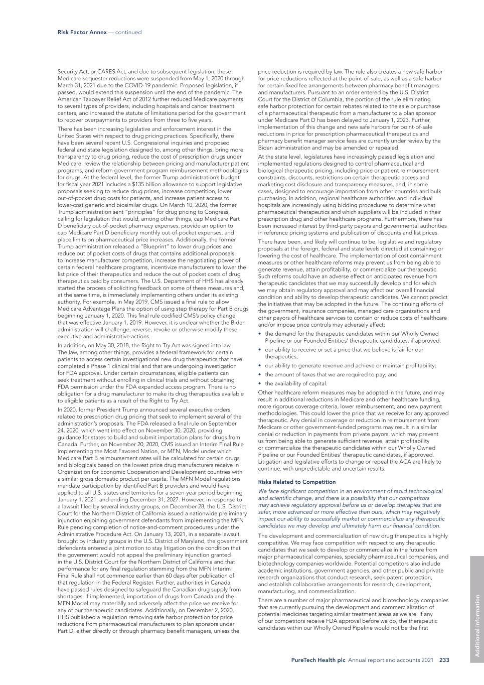 PureTech Health plc Annual report and accounts 2021 233 Risk Factor Annex — continued A d d it io na l i nf o rm at io n price reduction is required by law. The rule also creates a new safe harbor for price reductions reflected at the point-of-sale, as well as a safe harbor for certain fixed fee arrangements between pharmacy benefit managers and manufacturers. Pursuant to an order entered by the U.S. District Court for the District of Columbia, the portion of the rule eliminating safe harbor protection for certain rebates related to the sale or purchase of a pharmaceutical therapeutic from a manufacturer to a plan sponsor under Medicare Part D has been delayed to January 1, 2023. Further, implementation of this change and new safe harbors for point-of-sale reductions in price for prescription pharmaceutical therapeutics and pharmacy benefit manager service fees are currently under review by the Biden administration and may be amended or repealed. At the state level, legislatures have increasingly passed legislation and implemented regulations designed to control pharmaceutical and biological therapeutic pricing, including price or patient reimbursement constraints, discounts, restrictions on certain therapeutic access and marketing cost disclosure and transparency measures, and, in some cases, designed to encourage importation from other countries and bulk purchasing. In addition, regional healthcare authorities and individual hospitals are increasingly using bidding procedures to determine what pharmaceutical therapeutics and which suppliers will be included in their prescription drug and other healthcare programs. Furthermore, there has been increased interest by third-party payors and governmental authorities in reference pricing systems and publication of discounts and list prices. There have been, and likely will continue to be, legislative and regulatory proposals at the foreign, federal and state levels directed at containing or lowering the cost of healthcare. The implementation of cost containment measures or other healthcare reforms may prevent us from being able to generate revenue, attain profitability, or commercialize our therapeutic. Such reforms could have an adverse effect on anticipated revenue from therapeutic candidates that we may successfully develop and for which we may obtain regulatory approval and may affect our overall financial condition and ability to develop therapeutic candidates. We cannot predict the initiatives that may be adopted in the future. The continuing efforts of the government, insurance companies, managed care organizations and other payors of healthcare services to contain or reduce costs of healthcare and/or impose price controls may adversely affect: • the demand for the therapeutic candidates within our Wholly Owned Pipeline or our Founded Entities’ therapeutic candidates, if approved; • our ability to receive or set a price that we believe is fair for our therapeutics; • our ability to generate revenue and achieve or maintain profitability; • the amount of taxes that we are required to pay; and • the availability of capital. Other healthcare reform measures may be adopted in the future, and may result in additional reductions in Medicare and other healthcare funding, more rigorous coverage criteria, lower reimbursement, and new payment methodologies. This could lower the price that we receive for any approved therapeutic. Any denial in coverage or reduction in reimbursement from Medicare or other government-funded programs may result in a similar denial or reduction in payments from private payors, which may prevent us from being able to generate sufficient revenue, attain profitability or commercialize the therapeutic candidates within our Wholly Owned Pipeline or our Founded Entities’ therapeutic candidates, if approved. Litigation and legislative efforts to change or repeal the ACA are likely to continue, with unpredictable and uncertain results. Risks Related to Competition We face significant competition in an environment of rapid technological and scientific change, and there is a possibility that our competitors may achieve regulatory approval before us or develop therapies that are safer, more advanced or more effective than ours, which may negatively impact our ability to successfully market or commercialize any therapeutic candidates we may develop and ultimately harm our financial condition. The development and commercialization of new drug therapeutics is highly competitive. We may face competition with respect to any therapeutic candidates that we seek to develop or commercialize in the future from major pharmaceutical companies, specialty pharmaceutical companies, and biotechnology companies worldwide. Potential competitors also include academic institutions, government agencies, and other public and private research organizations that conduct research, seek patent protection, and establish collaborative arrangements for research, development, manufacturing, and commercialization. There are a number of major pharmaceutical and biotechnology companies that are currently pursuing the development and commercialization of potential medicines targeting similar treatment areas as we are. If any of our competitors receive FDA approval before we do, the therapeutic candidates within our Wholly Owned Pipeline would not be the first Security Act, or CARES Act, and due to subsequent legislation, these Medicare sequester reductions were suspended from May 1, 2020 through March 31, 2021 due to the COVID-19 pandemic. Proposed legislation, if passed, would extend this suspension until the end of the pandemic. The American Taxpayer Relief Act of 2012 further reduced Medicare payments to several types of providers, including hospitals and cancer treatment centers, and increased the statute of limitations period for the government to recover overpayments to providers from three to five years. There has been increasing legislati