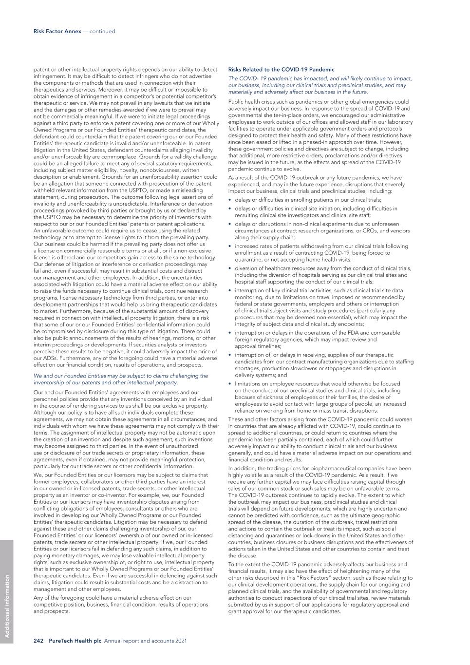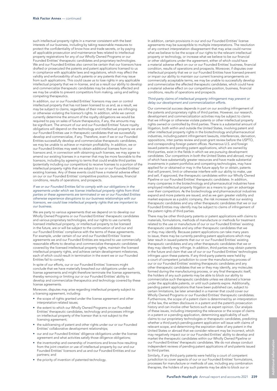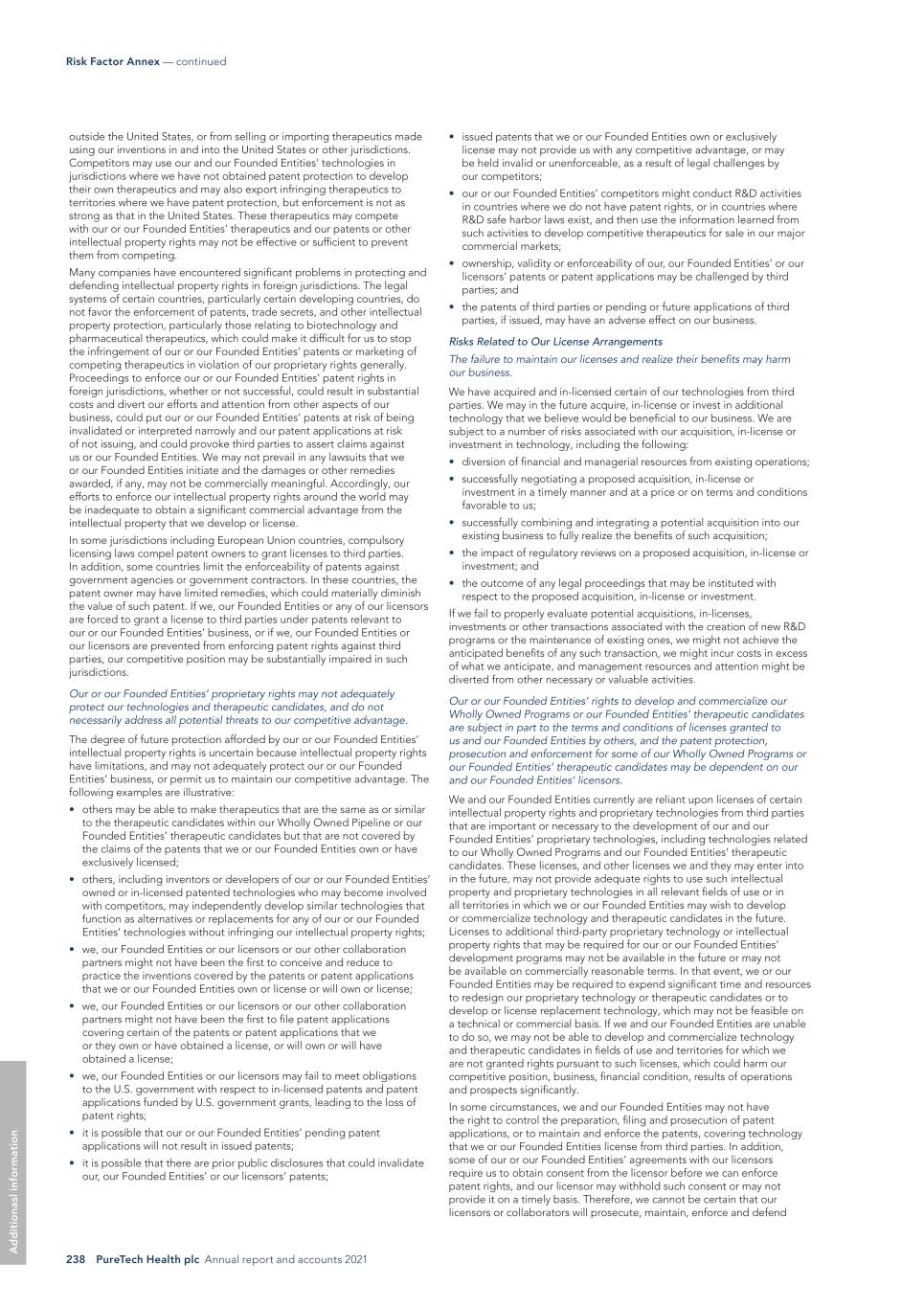 238 PureTech Health plc Annual report and accounts 2021 Risk Factor Annex — continued A d d it io na sl in fo rm at io n • issued patents that we or our Founded Entities own or exclusively license may not provide us with any competitive advantage, or may be held invalid or unenforceable, as a result of legal challenges by our competitors; • our or our Founded Entities’ competitors might conduct R&D activities in countries where we do not have patent rights, or in countries where R&D safe harbor laws exist, and then use the information learned from such activities to develop competitive therapeutics for sale in our major commercial markets; • ownership, validity or enforceability of our, our Founded Entities’ or our licensors’ patents or patent applications may be challenged by third parties; and • the patents of third parties or pending or future applications of third parties, if issued, may have an adverse effect on our business. Risks Related to Our License Arrangements The failure to maintain our licenses and realize their benefits may harm our business. We have acquired and in-licensed certain of our technologies from third parties. We may in the future acquire, in-license or invest in additional technology that we believe would be beneficial to our business. We are subject to a number of risks associated with our acquisition, in-license or investment in technology, including the following: • diversion of financial and managerial resources from existing operations; • successfully negotiating a proposed acquisition, in-license or investment in a timely manner and at a price or on terms and conditions favorable to us; • successfully combining and integrating a potential acquisition into our existing business to fully realize the benefits of such acquisition; • the impact of regulatory reviews on a proposed acquisition, in-license or investment; and • the outcome of any legal proceedings that may be instituted with respect to the proposed acquisition, in-license or investment. If we fail to properly evaluate potential acquisitions, in-licenses, investments or other transactions associated with the creation of new R&D programs or the maintenance of existing ones, we might not achieve the anticipated benefits of any such transaction, we might incur costs in excess of what we anticipate, and management resources and attention might be diverted from other necessary or valuable activities. Our or our Founded Entities’ rights to develop and commercialize our Wholly Owned Programs or our Founded Entities’ therapeutic candidates are subject in part to the terms and conditions of licenses granted to us and our Founded Entities by others, and the patent protection, prosecution and enforcement for some of our Wholly Owned Programs or our Founded Entities’ therapeutic candidates may be dependent on our and our Founded Entities’ licensors. We and our Founded Entities currently are reliant upon licenses of certain intellectual property rights and proprietary technologies from third parties that are important or necessary to the development of our and our Founded Entities’ proprietary technologies, including technologies related to our Wholly Owned Programs and our Founded Entities’ therapeutic candidates. These licenses, and other licenses we and they may enter into in the future, may not provide adequate rights to use such intellectual property and proprietary technologies in all relevant fields of use or in all territories in which we or our Founded Entities may wish to develop or commercialize technology and therapeutic candidates in the future. Licenses to additional third-party proprietary technology or intellectual property rights that may be required for our or our Founded Entities’ development programs may not be available in the future or may not be available on commercially reasonable terms. In that event, we or our Founded Entities may be required to expend significant time and resources to redesign our proprietary technology or therapeutic candidates or to develop or license replacement technology, which may not be feasible on a technical or commercial basis. If we and our Founded Entities are unable to do so, we may not be able to develop and commercialize technology and therapeutic candidates in fields of use and territories for which we are not granted rights pursuant to such licenses, which could harm our competitive position, business, financial condition, results of operations and prospects significantly. In some circumstances, we and our Founded Entities may not have the right to control the preparation, filing and prosecution of patent applications, or to maintain and enforce the patents, covering technology that we or our Founded Entities license from third parties. In addition, some of our or our Founded Entities’ agreements with our licensors require us to obtain consent from the licensor before we can enforce patent rights, and our licensor may withhold such consent or may not provide it on a timely basis. Therefore, we cannot be certain that our licensors or collaborators will prosecute, maintain, enforce and defend outside the United States, or from selling or importing therapeutics made using our inventions in and into the United States or other jurisdictions. Competitors may use our and our Founded Entities’ technologies in jurisdictions where we have not obtained patent protection to develop their own therapeutics and may also export infringing therapeutics to territories where we have patent protection, but enforcement is not as strong as that in the United States. These therapeutics may compete with our or our Founded Entities’ therapeutics and our patents or other intellectual property rights may not be effective or sufficient to prevent them from competing. Many companies have encountered significant problems in protecting and defending intellectual property rights in foreign jurisdictions. The legal systems of certain cou