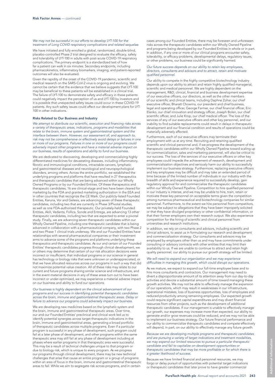 PureTech Health plc Annual report and accounts 2021 243 Risk Factor Annex — continued A d d it io na l i nf o rm at io n cases among our Founded Entities, there may be foreseen and unforeseen risks across the therapeutic candidates within our Wholly Owned Pipeline and programs being developed by our Founded Entities in whole or in part. In addition, if any one or more of our clinical programs encounter safety, tolerability, or efficacy problems, developmental delays, regulatory issues, or other problems, our business could be significantly harmed. Our future success depends on our ability to retain key employees, directors, consultants and advisors and to attract, retain and motivate qualified personnel. Our ability to compete in the highly competitive biotechnology industry depends upon our ability to attract and retain highly qualified managerial, scientific and medical personnel. We are highly dependent on the management, R&D, clinical, financial and business development expertise of our executive officers, our directors, as well as the other members of our scientific and clinical teams, including Daphne Zohar, our chief executive officer, Bharatt Chowrira, our president and chief business, legal and operating officer, George Farmer, our chief financial officer, Eric Elenko, our chief innovation and strategy officer, Joseph Bolen, our chief scientific officer, and Julie Krop, our chief medical officer. The loss of the services of any of our executive officers and other key personnel, and our inability to find suitable replacements could result in delays in therapeutic development and our financial condition and results of operations could be materially adversely affected. Furthermore, each of our executive officers may terminate their employment with us at any time. Recruiting and retaining qualified scientific and clinical personnel and, if we progress the development of the therapeutic candidates within our Wholly Owned Pipeline toward scaling up for commercialization, sales and marketing personnel, will also be critical to our success. The loss of the services of our executive officers or other key employees could impede the achievement of research, development and commercialization objectives and seriously harm our ability to successfully implement our business strategy. Furthermore, replacing executive officers and key employees may be difficult and may take an extended period of time because of the limited number of individuals in our industry with the breadth of skills and experience required to successfully develop, gain regulatory approval for and commercialize the therapeutic candidates within our Wholly Owned Pipeline. Competition to hire qualified personnel in our industry is intense, and we may be unable to hire, train, retain or motivate these key personnel on acceptable terms given the competition among numerous pharmaceutical and biotechnology companies for similar personnel. Furthermore, to the extent we hire personnel from competitors, we may be subject to allegations that they have been improperly solicited or that they have divulged proprietary or other confidential information, or that their former employers own their research output. We also experience competition for the hiring of scientific and clinical personnel from universities and research institutions. In addition, we rely on consultants and advisors, including scientific and clinical advisors, to assist us in formulating our research and development and commercialization strategy. Our consultants and advisors may be employed by employers other than us and may have commitments under consulting or advisory contracts with other entities that may limit their availability to us. If we are unable to continue to attract and retain high quality personnel, our ability to pursue our growth strategy will be limited. We will need to expand our organization and we may experience difficulties in managing this growth, which could disrupt our operations. As we mature, we expect to expand our full-time employee base and to hire more consultants and contractors. Our management may need to divert a disproportionate amount of its attention away from our day-to-day activities and devote a substantial amount of time toward managing these growth activities. We may not be able to effectively manage the expansion of our operations, which may result in weaknesses in our infrastructure, operational mistakes, loss of business opportunities, loss of employees and reduced productivity among remaining employees. Our expected growth could require significant capital expenditures and may divert financial resources from other projects, such as the development of additional therapeutic candidates. If our management is unable to effectively manage our growth, our expenses may increase more than expected, our ability to generate and/or grow revenues could be reduced, and we may not be able to implement our business strategy. Our future financial performance and our ability to commercialize therapeutic candidates and compete effectively will depend, in part, on our ability to effectively manage any future growth. Because we are developing multiple programs and therapeutic candidates and are pursuing a variety of target indications and treatment modalities, we may expend our limited resources to pursue a particular therapeutic candidate and fail to capitalize on development opportunities or therapeutic candidates that may be more profitable or for which there is a greater likelihood of success. Because we have limited financial and personnel resources, we may forgo or delay pursuit of opportunities with potential target indications or therapeutic candidates that later prove to have greater commercial We may not be successful in our efforts to develop LYT‑100 for the treatment of Long COVID respiratory complications and related sequelae. We have initiated and fully enrolled a global, randomized, double-blind, placebo-controlled Phase 2 tria