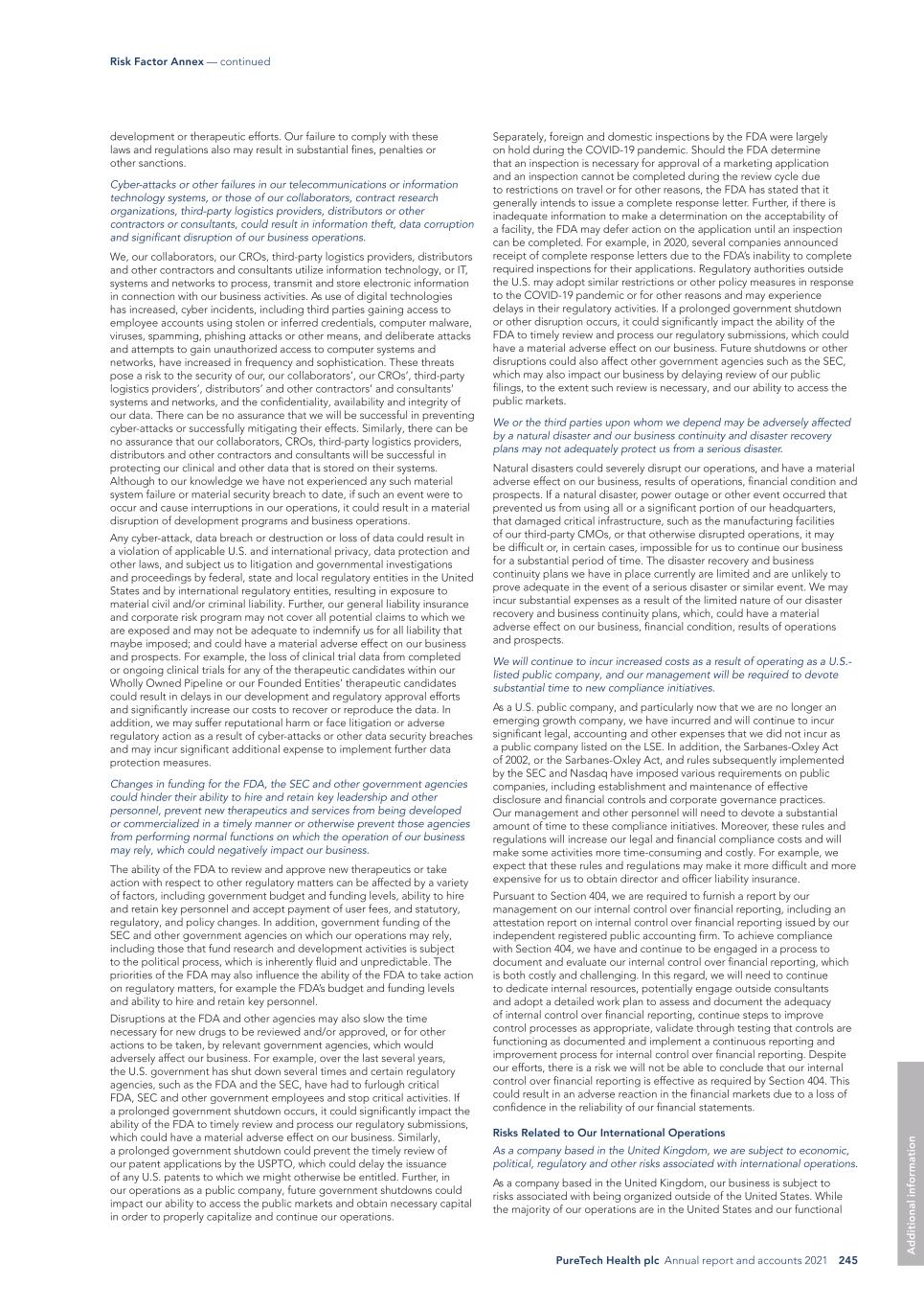 PureTech Health plc Annual report and accounts 2021 245 Risk Factor Annex — continued A d d it io na l i nf o rm at io n Separately, foreign and domestic inspections by the FDA were largely on hold during the COVID-19 pandemic. Should the FDA determine that an inspection is necessary for approval of a marketing application and an inspection cannot be completed during the review cycle due to restrictions on travel or for other reasons, the FDA has stated that it generally intends to issue a complete response letter. Further, if there is inadequate information to make a determination on the acceptability of a facility, the FDA may defer action on the application until an inspection can be completed. For example, in 2020, several companies announced receipt of complete response letters due to the FDA’s inability to complete required inspections for their applications. Regulatory authorities outside the U.S. may adopt similar restrictions or other policy measures in response to the COVID-19 pandemic or for other reasons and may experience delays in their regulatory activities. If a prolonged government shutdown or other disruption occurs, it could significantly impact the ability of the FDA to timely review and process our regulatory submissions, which could have a material adverse effect on our business. Future shutdowns or other disruptions could also affect other government agencies such as the SEC, which may also impact our business by delaying review of our public filings, to the extent such review is necessary, and our ability to access the public markets. We or the third parties upon whom we depend may be adversely affected by a natural disaster and our business continuity and disaster recovery plans may not adequately protect us from a serious disaster. Natural disasters could severely disrupt our operations, and have a material adverse effect on our business, results of operations, financial condition and prospects. If a natural disaster, power outage or other event occurred that prevented us from using all or a significant portion of our headquarters, that damaged critical infrastructure, such as the manufacturing facilities of our third-party CMOs, or that otherwise disrupted operations, it may be difficult or, in certain cases, impossible for us to continue our business for a substantial period of time. The disaster recovery and business continuity plans we have in place currently are limited and are unlikely to prove adequate in the event of a serious disaster or similar event. We may incur substantial expenses as a result of the limited nature of our disaster recovery and business continuity plans, which, could have a material adverse effect on our business, financial condition, results of operations and prospects. We will continue to incur increased costs as a result of operating as a U.S.‑ listed public company, and our management will be required to devote substantial time to new compliance initiatives. As a U.S. public company, and particularly now that we are no longer an emerging growth company, we have incurred and will continue to incur significant legal, accounting and other expenses that we did not incur as a public company listed on the LSE. In addition, the Sarbanes-Oxley Act of 2002, or the Sarbanes-Oxley Act, and rules subsequently implemented by the SEC and Nasdaq have imposed various requirements on public companies, including establishment and maintenance of effective disclosure and financial controls and corporate governance practices. Our management and other personnel will need to devote a substantial amount of time to these compliance initiatives. Moreover, these rules and regulations will increase our legal and financial compliance costs and will make some activities more time-consuming and costly. For example, we expect that these rules and regulations may make it more difficult and more expensive for us to obtain director and officer liability insurance. Pursuant to Section 404, we are required to furnish a report by our management on our internal control over financial reporting, including an attestation report on internal control over financial reporting issued by our independent registered public accounting firm. To achieve compliance with Section 404, we have and continue to be engaged in a process to document and evaluate our internal control over financial reporting, which is both costly and challenging. In this regard, we will need to continue to dedicate internal resources, potentially engage outside consultants and adopt a detailed work plan to assess and document the adequacy of internal control over financial reporting, continue steps to improve control processes as appropriate, validate through testing that controls are functioning as documented and implement a continuous reporting and improvement process for internal control over financial reporting. Despite our efforts, there is a risk we will not be able to conclude that our internal control over financial reporting is effective as required by Section 404. This could result in an adverse reaction in the financial markets due to a loss of confidence in the reliability of our financial statements. Risks Related to Our International Operations As a company based in the United Kingdom, we are subject to economic, political, regulatory and other risks associated with international operations. As a company based in the United Kingdom, our business is subject to risks associated with being organized outside of the United States. While the majority of our operations are in the United States and our functional development or therapeutic efforts. Our failure to comply with these laws and regulations also may result in substantial fines, penalties or other sanctions. Cyber‑attacks or other failures in our telecommunications or information technology systems, or those of our collaborators, contract research organizations, third‑party logistics providers, distributors or other contractors or 