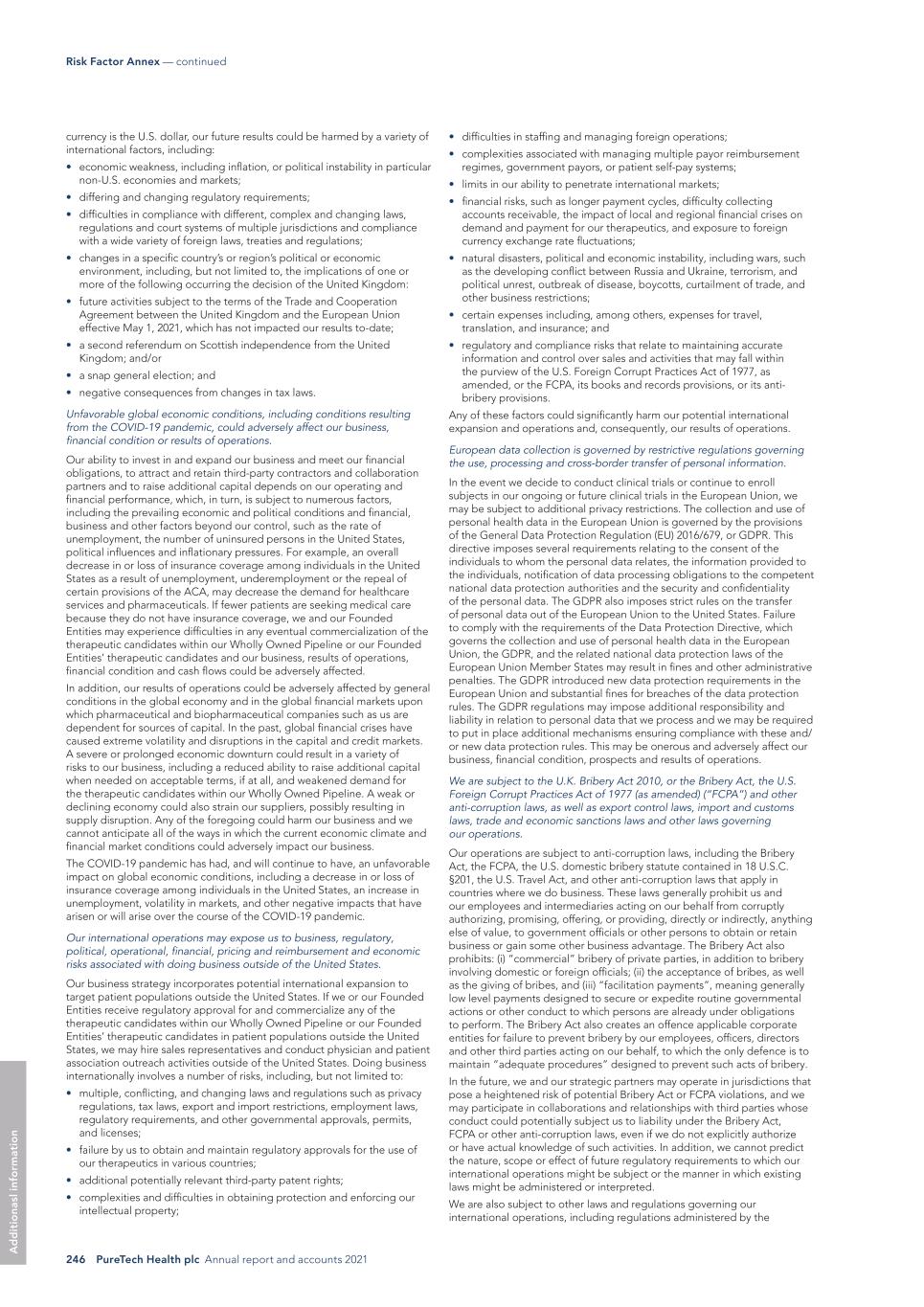 246 PureTech Health plc Annual report and accounts 2021 Risk Factor Annex — continued A d d it io na sl in fo rm at io n • difficulties in staffing and managing foreign operations; • complexities associated with managing multiple payor reimbursement regimes, government payors, or patient self-pay systems; • limits in our ability to penetrate international markets; • financial risks, such as longer payment cycles, difficulty collecting accounts receivable, the impact of local and regional financial crises on demand and payment for our therapeutics, and exposure to foreign currency exchange rate fluctuations; • natural disasters, political and economic instability, including wars, such as the developing conflict between Russia and Ukraine, terrorism, and political unrest, outbreak of disease, boycotts, curtailment of trade, and other business restrictions; • certain expenses including, among others, expenses for travel, translation, and insurance; and • regulatory and compliance risks that relate to maintaining accurate information and control over sales and activities that may fall within the purview of the U.S. Foreign Corrupt Practices Act of 1977, as amended, or the FCPA, its books and records provisions, or its anti- bribery provisions. Any of these factors could significantly harm our potential international expansion and operations and, consequently, our results of operations. European data collection is governed by restrictive regulations governing the use, processing and cross‑border transfer of personal information. In the event we decide to conduct clinical trials or continue to enroll subjects in our ongoing or future clinical trials in the European Union, we may be subject to additional privacy restrictions. The collection and use of personal health data in the European Union is governed by the provisions of the General Data Protection Regulation (EU) 2016/679, or GDPR. This directive imposes several requirements relating to the consent of the individuals to whom the personal data relates, the information provided to the individuals, notification of data processing obligations to the competent national data protection authorities and the security and confidentiality of the personal data. The GDPR also imposes strict rules on the transfer of personal data out of the European Union to the United States. Failure to comply with the requirements of the Data Protection Directive, which governs the collection and use of personal health data in the European Union, the GDPR, and the related national data protection laws of the European Union Member States may result in fines and other administrative penalties. The GDPR introduced new data protection requirements in the European Union and substantial fines for breaches of the data protection rules. The GDPR regulations may impose additional responsibility and liability in relation to personal data that we process and we may be required to put in place additional mechanisms ensuring compliance with these and/ or new data protection rules. This may be onerous and adversely affect our business, financial condition, prospects and results of operations. We are subject to the U.K. Bribery Act 2010, or the Bribery Act, the U.S. Foreign Corrupt Practices Act of 1977 (as amended) (“FCPA”) and other anti‑corruption laws, as well as export control laws, import and customs laws, trade and economic sanctions laws and other laws governing our operations. Our operations are subject to anti-corruption laws, including the Bribery Act, the FCPA, the U.S. domestic bribery statute contained in 18 U.S.C. §201, the U.S. Travel Act, and other anti-corruption laws that apply in countries where we do business. These laws generally prohibit us and our employees and intermediaries acting on our behalf from corruptly authorizing, promising, offering, or providing, directly or indirectly, anything else of value, to government officials or other persons to obtain or retain business or gain some other business advantage. The Bribery Act also prohibits: (i) “commercial” bribery of private parties, in addition to bribery involving domestic or foreign officials; (ii) the acceptance of bribes, as well as the giving of bribes, and (iii) “facilitation payments”, meaning generally low level payments designed to secure or expedite routine governmental actions or other conduct to which persons are already under obligations to perform. The Bribery Act also creates an offence applicable corporate entities for failure to prevent bribery by our employees, officers, directors and other third parties acting on our behalf, to which the only defence is to maintain “adequate procedures” designed to prevent such acts of bribery. In the future, we and our strategic partners may operate in jurisdictions that pose a heightened risk of potential Bribery Act or FCPA violations, and we may participate in collaborations and relationships with third parties whose conduct could potentially subject us to liability under the Bribery Act, FCPA or other anti-corruption laws, even if we do not explicitly authorize or have actual knowledge of such activities. In addition, we cannot predict the nature, scope or effect of future regulatory requirements to which our international operations might be subject or the manner in which existing laws might be administered or interpreted. We are also subject to other laws and regulations governing our international operations, including regulations administered by the currency is the U.S. dollar, our future results could be harmed by a variety of international factors, including: • economic weakness, including inflation, or political instability in particular non-U.S. economies and markets; • differing and changing regulatory requirements; • difficulties in compliance with different, complex and changing laws, regulations and court systems of multiple jurisdictions and compliance with a wide variety of foreign laws, tr