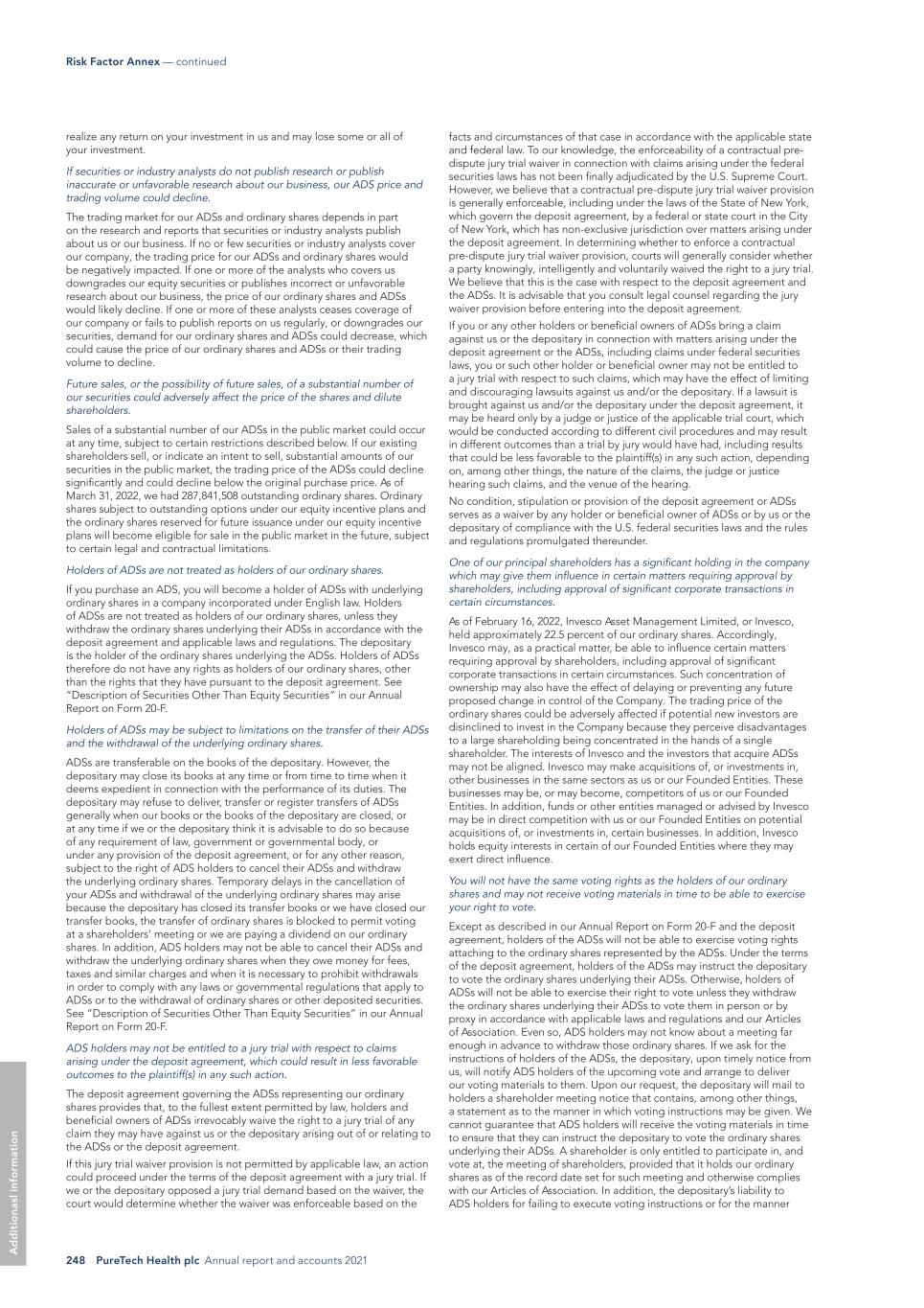 248 PureTech Health plc Annual report and accounts 2021 Risk Factor Annex — continued A d d it io na sl in fo rm at io n facts and circumstances of that case in accordance with the applicable state and federal law. To our knowledge, the enforceability of a contractual pre- dispute jury trial waiver in connection with claims arising under the federal securities laws has not been finally adjudicated by the U.S. Supreme Court. However, we believe that a contractual pre-dispute jury trial waiver provision is generally enforceable, including under the laws of the State of New York, which govern the deposit agreement, by a federal or state court in the City of New York, which has non-exclusive jurisdiction over matters arising under the deposit agreement. In determining whether to enforce a contractual pre-dispute jury trial waiver provision, courts will generally consider whether a party knowingly, intelligently and voluntarily waived the right to a jury trial. We believe that this is the case with respect to the deposit agreement and the ADSs. It is advisable that you consult legal counsel regarding the jury waiver provision before entering into the deposit agreement. If you or any other holders or beneficial owners of ADSs bring a claim against us or the depositary in connection with matters arising under the deposit agreement or the ADSs, including claims under federal securities laws, you or such other holder or beneficial owner may not be entitled to a jury trial with respect to such claims, which may have the effect of limiting and discouraging lawsuits against us and/or the depositary. If a lawsuit is brought against us and/or the depositary under the deposit agreement, it may be heard only by a judge or justice of the applicable trial court, which would be conducted according to different civil procedures and may result in different outcomes than a trial by jury would have had, including results that could be less favorable to the plaintiff(s) in any such action, depending on, among other things, the nature of the claims, the judge or justice hearing such claims, and the venue of the hearing. No condition, stipulation or provision of the deposit agreement or ADSs serves as a waiver by any holder or beneficial owner of ADSs or by us or the depositary of compliance with the U.S. federal securities laws and the rules and regulations promulgated thereunder. One of our principal shareholders has a significant holding in the company which may give them influence in certain matters requiring approval by shareholders, including approval of significant corporate transactions in certain circumstances. As of February 16, 2022, Invesco Asset Management Limited, or Invesco, held approximately 22.5 percent of our ordinary shares. Accordingly, Invesco may, as a practical matter, be able to influence certain matters requiring approval by shareholders, including approval of significant corporate transactions in certain circumstances. Such concentration of ownership may also have the effect of delaying or preventing any future proposed change in control of the Company. The trading price of the ordinary shares could be adversely affected if potential new investors are disinclined to invest in the Company because they perceive disadvantages to a large shareholding being concentrated in the hands of a single shareholder. The interests of Invesco and the investors that acquire ADSs may not be aligned. Invesco may make acquisitions of, or investments in, other businesses in the same sectors as us or our Founded Entities. These businesses may be, or may become, competitors of us or our Founded Entities. In addition, funds or other entities managed or advised by Invesco may be in direct competition with us or our Founded Entities on potential acquisitions of, or investments in, certain businesses. In addition, Invesco holds equity interests in certain of our Founded Entities where they may exert direct influence. You will not have the same voting rights as the holders of our ordinary shares and may not receive voting materials in time to be able to exercise your right to vote. Except as described in our Annual Report on Form 20-F and the deposit agreement, holders of the ADSs will not be able to exercise voting rights attaching to the ordinary shares represented by the ADSs. Under the terms of the deposit agreement, holders of the ADSs may instruct the depositary to vote the ordinary shares underlying their ADSs. Otherwise, holders of ADSs will not be able to exercise their right to vote unless they withdraw the ordinary shares underlying their ADSs to vote them in person or by proxy in accordance with applicable laws and regulations and our Articles of Association. Even so, ADS holders may not know about a meeting far enough in advance to withdraw those ordinary shares. If we ask for the instructions of holders of the ADSs, the depositary, upon timely notice from us, will notify ADS holders of the upcoming vote and arrange to deliver our voting materials to them. Upon our request, the depositary will mail to holders a shareholder meeting notice that contains, among other things, a statement as to the manner in which voting instructions may be given. We cannot guarantee that ADS holders will receive the voting materials in time to ensure that they can instruct the depositary to vote the ordinary shares underlying their ADSs. A shareholder is only entitled to participate in, and vote at, the meeting of shareholders, provided that it holds our ordinary shares as of the record date set for such meeting and otherwise complies with our Articles of Association. In addition, the depositary’s liability to ADS holders for failing to execute voting instructions or for the manner realize any return on your investment in us and may lose some or all of your investment. If securities or industry analysts do not publish research or publish inaccurate or unfavorable research about our business, our ADS price and trading 