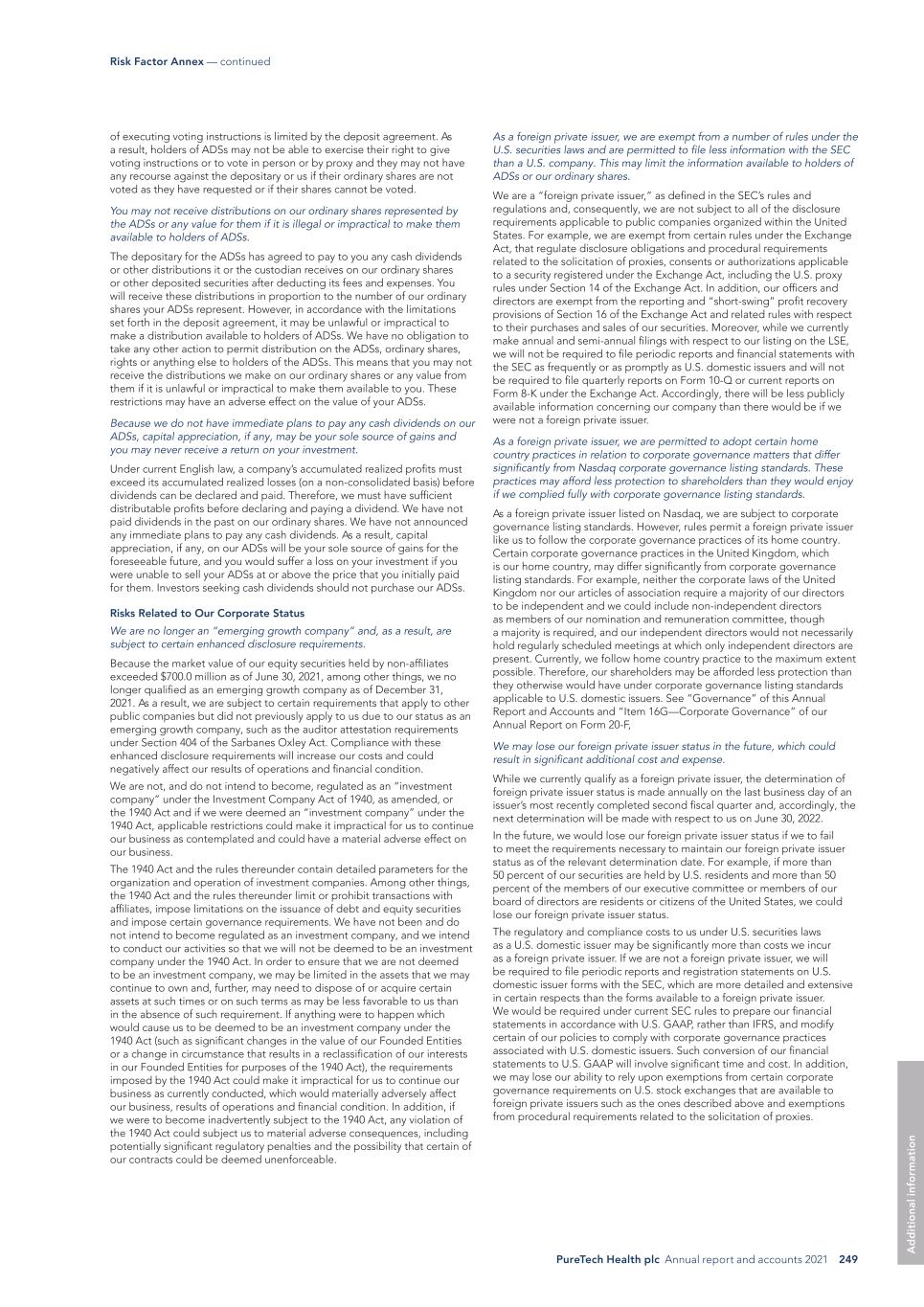 PureTech Health plc Annual report and accounts 2021 249 Risk Factor Annex — continued A d d it io na l i nf o rm at io n As a foreign private issuer, we are exempt from a number of rules under the U.S. securities laws and are permitted to file less information with the SEC than a U.S. company. This may limit the information available to holders of ADSs or our ordinary shares. We are a “foreign private issuer,” as defined in the SEC’s rules and regulations and, consequently, we are not subject to all of the disclosure requirements applicable to public companies organized within the United States. For example, we are exempt from certain rules under the Exchange Act, that regulate disclosure obligations and procedural requirements related to the solicitation of proxies, consents or authorizations applicable to a security registered under the Exchange Act, including the U.S. proxy rules under Section 14 of the Exchange Act. In addition, our officers and directors are exempt from the reporting and “short-swing” profit recovery provisions of Section 16 of the Exchange Act and related rules with respect to their purchases and sales of our securities. Moreover, while we currently make annual and semi-annual filings with respect to our listing on the LSE, we will not be required to file periodic reports and financial statements with the SEC as frequently or as promptly as U.S. domestic issuers and will not be required to file quarterly reports on Form 10-Q or current reports on Form 8-K under the Exchange Act. Accordingly, there will be less publicly available information concerning our company than there would be if we were not a foreign private issuer. As a foreign private issuer, we are permitted to adopt certain home country practices in relation to corporate governance matters that differ significantly from Nasdaq corporate governance listing standards. These practices may afford less protection to shareholders than they would enjoy if we complied fully with corporate governance listing standards. As a foreign private issuer listed on Nasdaq, we are subject to corporate governance listing standards. However, rules permit a foreign private issuer like us to follow the corporate governance practices of its home country. Certain corporate governance practices in the United Kingdom, which is our home country, may differ significantly from corporate governance listing standards. For example, neither the corporate laws of the United Kingdom nor our articles of association require a majority of our directors to be independent and we could include non-independent directors as members of our nomination and remuneration committee, though a majority is required, and our independent directors would not necessarily hold regularly scheduled meetings at which only independent directors are present. Currently, we follow home country practice to the maximum extent possible. Therefore, our shareholders may be afforded less protection than they otherwise would have under corporate governance listing standards applicable to U.S. domestic issuers. See “Governance” of this Annual Report and Accounts and “Item 16G—Corporate Governance” of our Annual Report on Form 20-F, We may lose our foreign private issuer status in the future, which could result in significant additional cost and expense. While we currently qualify as a foreign private issuer, the determination of foreign private issuer status is made annually on the last business day of an issuer’s most recently completed second fiscal quarter and, accordingly, the next determination will be made with respect to us on June 30, 2022. In the future, we would lose our foreign private issuer status if we to fail to meet the requirements necessary to maintain our foreign private issuer status as of the relevant determination date. For example, if more than 50 percent of our securities are held by U.S. residents and more than 50 percent of the members of our executive committee or members of our board of directors are residents or citizens of the United States, we could lose our foreign private issuer status. The regulatory and compliance costs to us under U.S. securities laws as a U.S. domestic issuer may be significantly more than costs we incur as a foreign private issuer. If we are not a foreign private issuer, we will be required to file periodic reports and registration statements on U.S. domestic issuer forms with the SEC, which are more detailed and extensive in certain respects than the forms available to a foreign private issuer. We would be required under current SEC rules to prepare our financial statements in accordance with U.S. GAAP, rather than IFRS, and modify certain of our policies to comply with corporate governance practices associated with U.S. domestic issuers. Such conversion of our financial statements to U.S. GAAP will involve significant time and cost. In addition, we may lose our ability to rely upon exemptions from certain corporate governance requirements on U.S. stock exchanges that are available to foreign private issuers such as the ones described above and exemptions from procedural requirements related to the solicitation of proxies. of executing voting instructions is limited by the deposit agreement. As a result, holders of ADSs may not be able to exercise their right to give voting instructions or to vote in person or by proxy and they may not have any recourse against the depositary or us if their ordinary shares are not voted as they have requested or if their shares cannot be voted. You may not receive distributions on our ordinary shares represented by the ADSs or any value for them if it is illegal or impractical to make them available to holders of ADSs. The depositary for the ADSs has agreed to pay to you any cash dividends or other distributions it or the custodian receives on our ordinary shares or other deposited securities after deducting its fees and expenses. You will receive these distributi