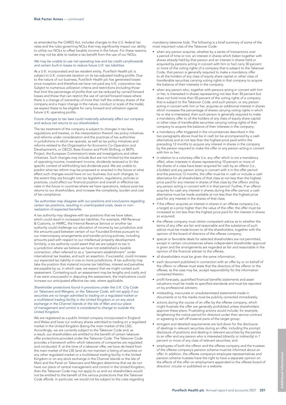 PureTech Health plc Annual report and accounts 2021 251 Risk Factor Annex — continued A d d it io na l i nf o rm at io n mandatory takeover bids. The following is a brief summary of some of the most important rules of the Takeover Code: • when any person acquires, whether by a series of transactions over a period of time or not, an interest in shares which (taken together with shares already held by that person and an interest in shares held or acquired by persons acting in concert with him or her) carry 30 percent or more of the voting rights of a company that is subject to the Takeover Code, that person is generally required to make a mandatory offer to all the holders of any class of equity share capital or other class of transferable securities carrying voting rights in that company to acquire the balance of their interests in the company; • when any person who, together with persons acting in concert with him or her, is interested in shares representing not less than 30 percent but does not hold more than 50 percent of the voting rights of a company that is subject to the Takeover Code, and such person, or any person acting in concert with him or her, acquires an additional interest in shares which increases the percentage of shares carrying voting rights in which he or she is interested, then such person is generally required to make a mandatory offer to all the holders of any class of equity share capital or other class of transferable securities carrying voting rights of that company to acquire the balance of their interests in the company; • a mandatory offer triggered in the circumstances described in the two paragraphs above must be in cash (or be accompanied by a cash alternative) and at not less than the highest price paid within the preceding 12 months to acquire any interest in shares in the company by the person required to make the offer or any person acting in concert with him or her; • in relation to a voluntary offer (i.e. any offer which is not a mandatory offer), when interests in shares representing 10 percent or more of the shares of a class have been acquired for cash by an offeror (i.e., a bidder) and any person acting in concert with it in the offer period and the previous 12 months, the offer must be in cash or include a cash alternative for all shareholders of that class at not less than the highest price paid for any interest in shares of that class by the offeror and by any person acting in concert with it in that period. Further, if an offeror acquires for cash any interest in shares during the offer period, a cash alternative must be made available at not less than the highest price paid for any interest in the shares of that class; • if the offeror acquires an interest in shares in an offeree company (i.e., a target) at a price higher than the value of the offer, the offer must be increased to not less than the highest price paid for the interest in shares so acquired; • the offeree company must obtain competent advice as to whether the terms of any offer are fair and reasonable and the substance of such advice must be made known to all the shareholders, together with the opinion of the board of directors of the offeree company; • special or favorable deals for selected shareholders are not permitted, except in certain circumstances where independent shareholder approval is given and the arrangements are regarded as fair and reasonable in the opinion of the financial adviser to the offeree; • all shareholders must be given the same information; • each document published in connection with an offer by or on behalf of the offeror or offeree must state that the directors of the offeror or the offeree, as the case may be, accept responsibility for the information contained therein; • profit forecasts, quantified financial benefits statements and asset valuations must be made to specified standards and must be reported on by professional advisers; • misleading, inaccurate or unsubstantiated statements made in documents or to the media must be publicly corrected immediately; • actions during the course of an offer by the offeree company, which might frustrate the offer are generally prohibited unless shareholders approve these plans. Frustrating actions would include, for example, lengthening the notice period for directors under their service contract or agreeing to sell off material parts of the target group; • stringent and detailed requirements are laid down for the disclosure of dealings in relevant securities during an offer, including the prompt disclosure of positions and dealing in relevant securities by the parties to an offer and any person who is interested (directly or indirectly) in 1 percent or more of any class of relevant securities; and • employees of both the offeror and the offeree company and the trustees of the offeree company’s pension scheme must be informed about an offer. In addition, the offeree company’s employee representatives and pension scheme trustees have the right to have a separate opinion on the effects of the offer on employment appended to the offeree board of directors’ circular or published on a website. as amended by the CARES Act, includes changes to the U.S. federal tax rates and the rules governing NOLs that may significantly impact our ability to utilize our NOLs to offset taxable income in the future. For these reasons, we may not be able to realize a tax benefit from the use of our NOLs. We may be unable to use net operating loss and tax credit carryforwards and certain built‑in losses to reduce future U.K. tax liabilities. As a U.K. incorporated and tax resident entity, PureTech Health plc is subject to U.K. corporate taxation on its tax-adjusted trading profits. Due to the nature of our business, PureTech Health plc has generated losses since inception and therefore we have not paid any U.K. corporation tax. Subject to numerous utilization criteria and restrictions (includi