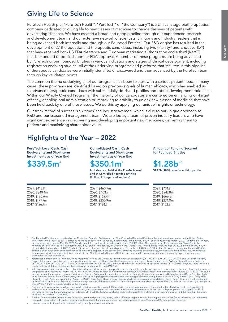 PureTech Health plc Annual report and accounts 2022 1 O ve rv ie w 1 Our Founded Entities are comprised of our Controlled Founded Entities and our Non-Controlled Founded Entities, all of which are incorporated in the United States. References in this report to our “Controlled Founded Entities” refer to Follica, Incorporated, and Entrega, Inc., for all periods prior to March 1, 2023, Vedanta Biosciences, Inc., for all periods prior to May 25, 2022, Sonde Health Inc., and for all periods prior to June 10, 2021, Alivio Therapeutics, Inc. References to our “Non-Controlled Founded Entities” refer to Akili Interactive Labs, Inc., Karuna Therapeutics, Inc., Vor Bio, Inc., Gelesis, Inc., for all periods following May 25, 2022, Sonde Health, Inc., for all periods following March 1, 2023, Vedanta Biosciences, Inc., and, for all periods prior to December 18, 2019, resTORbio, Inc. We formed each of our Founded Entities and have been involved in development efforts in varying degrees. In the case of our Controlled Founded Entities Follica, Incorporated and Entrega, Inc., we continue to maintain majority voting control. With respect to our Non-Controlled Founded Entities, we may benefit from appreciation in our minority equity investment as a shareholder of such companies. 2 References in this report to “Wholly Owned Programs” refer to the Company’s five therapeutic candidates (LYT-100, LYT-200, LYT-300, LYT-310, and LYT-503/IMB-150), Glyph platform and potential future therapeutic candidates and platforms that the Company may develop or obtain. References to “Wholly Owned Pipeline” refer to LYT-100, LYT-200, LYT-300, LYT-310, and LYT-503/IMB-150. On July 23, 2021, Imbrium Therapeutics exercised its option to license LYT-503/IMB-150 pursuant to which it is responsible for all future development activities and funding for LYT-503/IMB-150. 3 Industry average data measures the probability of clinical trial success of therapeutics by calculating the number of programs progressing to the next phase vs. the number progressing and suspended (Phase 1=52%, Phase 2=29%, Phase 3=58%). BIO, PharmaIntelligence, QLS (2021) Clinical Development Success Rates 2011 – 2020. This study did not include therapeutics regulated as devices. PureTech’s aggregate percentages include all therapeutic candidates advanced through at least Phase 1 by PureTech or its Founded Entities from 2009 onward, calculated by multiplying the individual phase percentages of the following, Phase 1 (n = 6/8; 75%), Phase 2 (n = 10/12; 83%), Phase 3 (n = 3/4; 75%), last updated on August 8, 2022; Phase 2 and Phase 3 percentages include some therapeutic candidates where Phase 1 trials were not conducted by PureTech or its Founded Entities (i) due to the requirements of the medical device regulatory pathway or (ii) because a prior Phase 1 trial was conducted by a third party, which Phase 1 trials were not included in this analysis. 4 PureTech level cash, cash equivalents and short-term investments is a non-IFRS measure. For more information in relation to the PureTech level cash, cash equivalents and short-term investments and Consolidated cash, cash equivalents and short-term investments measures used in this Annual Report, please see pages 51 to 52 of the Financial Review. For comparative periods from 2016 to 2019, balances included cash, cash equivalents and short-term investments and for 2020 and 2021 balances included cash and cash equivalents. 5 Funding figure includes private equity financings, loans and promissory notes, public offerings or grant awards. Funding figure excludes future milestone considerations received in conjunction with partnerships and collaborations. Funding figure does not include proceeds from Vedanta’s 2023 post-period financing. 6 Number represents figure for the relevant fiscal year only and is not cumulative. Highlights of the Year – 2022 Amount of Funding Secured for Founded Entities $1.28b5,6 $1.25b (98%) came from third parties PureTech Level Cash, Cash Equivalents and Short-term Investments as of Year End $339.5m4 Consolidated Cash, Cash Equivalents and Short-term Investments as of Year End $350.1m4 Includes cash held at the PureTech level and at Controlled Founded Entities (Follica, Entrega, and Vedanta) 2021: $731.9m 2020: $247.8m 2019: $666.8m 2018: $274.0m 2017: $102.9m 2021: $418.9m 2020: $349.4m 2019: $120.6m 2018: $177.7m 2017: $126.7m 2021: $465.7m 2020: $403.9m 2019: $162.4m 2018: $250.9m 2017: $188.7m Giving Life to Science PureTech Health plc (“PureTech Health”, “PureTech” or “the Company”) is a clinical-stage biotherapeutics company dedicated to giving life to new classes of medicine to change the lives of patients with devastating diseases. We have created a broad and deep pipeline through our experienced research and development team and our extensive network of scientists, clinicians and industry leaders that is being advanced both internally and through our Founded Entities.1 Our R&D engine has resulted in the development of 27 therapeutics and therapeutic candidates, including two (Plenity® and EndeavorRx®) that have received both US FDA clearance and European marketing authorization and a third (KarXT) that is expected to be filed soon for FDA approval. A number of these programs are being advanced by PureTech or our Founded Entities in various indications and stages of clinical development, including registration enabling studies. All of the underlying programs and platforms that resulted in this pipeline of therapeutic candidates were initially identified or discovered and then advanced by the PureTech team through key validation points. The common theme underlying all of our programs has been to start with a serious patient need. In many cases, these programs are identified based on previous signals of human efficacy, which has enabled us to advance therapeutic candidates with substantially de-risked profiles and robust development rationales. Within ou