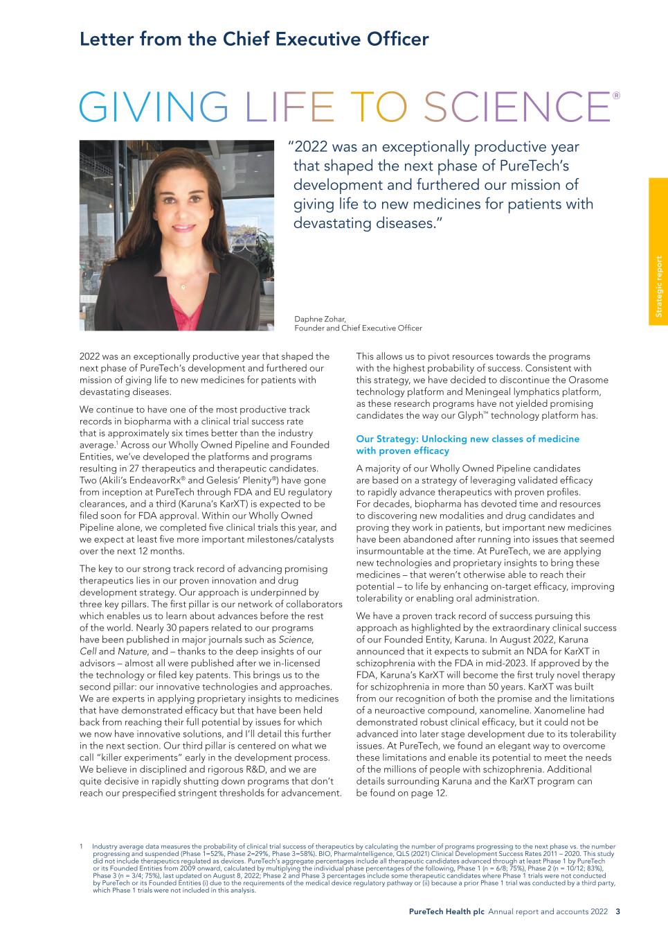 PureTech Health plc Annual report and accounts 2022 3 St ra te g ic r ep o rt Letter from the Chief Executive Officer This allows us to pivot resources towards the programs with the highest probability of success. Consistent with this strategy, we have decided to discontinue the Orasome technology platform and Meningeal lymphatics platform, as these research programs have not yielded promising candidates the way our Glyph™ technology platform has. Our Strategy: Unlocking new classes of medicine with proven efficacy A majority of our Wholly Owned Pipeline candidates are based on a strategy of leveraging validated efficacy to rapidly advance therapeutics with proven profiles. For decades, biopharma has devoted time and resources to discovering new modalities and drug candidates and proving they work in patients, but important new medicines have been abandoned after running into issues that seemed insurmountable at the time. At PureTech, we are applying new technologies and proprietary insights to bring these medicines – that weren’t otherwise able to reach their potential – to life by enhancing on-target efficacy, improving tolerability or enabling oral administration. We have a proven track record of success pursuing this approach as highlighted by the extraordinary clinical success of our Founded Entity, Karuna. In August 2022, Karuna announced that it expects to submit an NDA for KarXT in schizophrenia with the FDA in mid-2023. If approved by the FDA, Karuna’s KarXT will become the first truly novel therapy for schizophrenia in more than 50 years. KarXT was built from our recognition of both the promise and the limitations of a neuroactive compound, xanomeline. Xanomeline had demonstrated robust clinical efficacy, but it could not be advanced into later stage development due to its tolerability issues. At PureTech, we found an elegant way to overcome these limitations and enable its potential to meet the needs of the millions of people with schizophrenia. Additional details surrounding Karuna and the KarXT program can be found on page 12. 2022 was an exceptionally productive year that shaped the next phase of PureTech’s development and furthered our mission of giving life to new medicines for patients with devastating diseases. We continue to have one of the most productive track records in biopharma with a clinical trial success rate that is approximately six times better than the industry average.1 Across our Wholly Owned Pipeline and Founded Entities, we’ve developed the platforms and programs resulting in 27 therapeutics and therapeutic candidates. Two (Akili’s EndeavorRx® and Gelesis’ Plenity®) have gone from inception at PureTech through FDA and EU regulatory clearances, and a third (Karuna’s KarXT) is expected to be filed soon for FDA approval. Within our Wholly Owned Pipeline alone, we completed five clinical trials this year, and we expect at least five more important milestones/catalysts over the next 12 months. The key to our strong track record of advancing promising therapeutics lies in our proven innovation and drug development strategy. Our approach is underpinned by three key pillars. The first pillar is our network of collaborators which enables us to learn about advances before the rest of the world. Nearly 30 papers related to our programs have been published in major journals such as Science, Cell and Nature, and – thanks to the deep insights of our advisors – almost all were published after we in-licensed the technology or filed key patents. This brings us to the second pillar: our innovative technologies and approaches. We are experts in applying proprietary insights to medicines that have demonstrated efficacy but that have been held back from reaching their full potential by issues for which we now have innovative solutions, and I’ll detail this further in the next section. Our third pillar is centered on what we call “killer experiments” early in the development process. We believe in disciplined and rigorous R&D, and we are quite decisive in rapidly shutting down programs that don’t reach our prespecified stringent thresholds for advancement. “2022 was an exceptionally productive year that shaped the next phase of PureTech’s development and furthered our mission of giving life to new medicines for patients with devastating diseases.” Daphne Zohar, Founder and Chief Executive Officer 1 Industry average data measures the probability of clinical trial success of therapeutics by calculating the number of programs progressing to the next phase vs. the number progressing and suspended (Phase 1=52%, Phase 2=29%, Phase 3=58%). BIO, PharmaIntelligence, QLS (2021) Clinical Development Success Rates 2011 – 2020. This study did not include therapeutics regulated as devices. PureTech’s aggregate percentages include all therapeutic candidates advanced through at least Phase 1 by PureTech or its Founded Entities from 2009 onward, calculated by multiplying the individual phase percentages of the following, Phase 1 (n = 6/8; 75%), Phase 2 (n = 10/12; 83%), Phase 3 (n = 3/4; 75%), last updated on August 8, 2022; Phase 2 and Phase 3 percentages include some therapeutic candidates where Phase 1 trials were not conducted by PureTech or its Founded Entities (i) due to the requirements of the medical device regulatory pathway or (ii) because a prior Phase 1 trial was conducted by a third party, which Phase 1 trials were not included in this analysis.